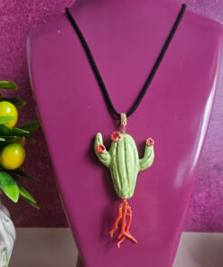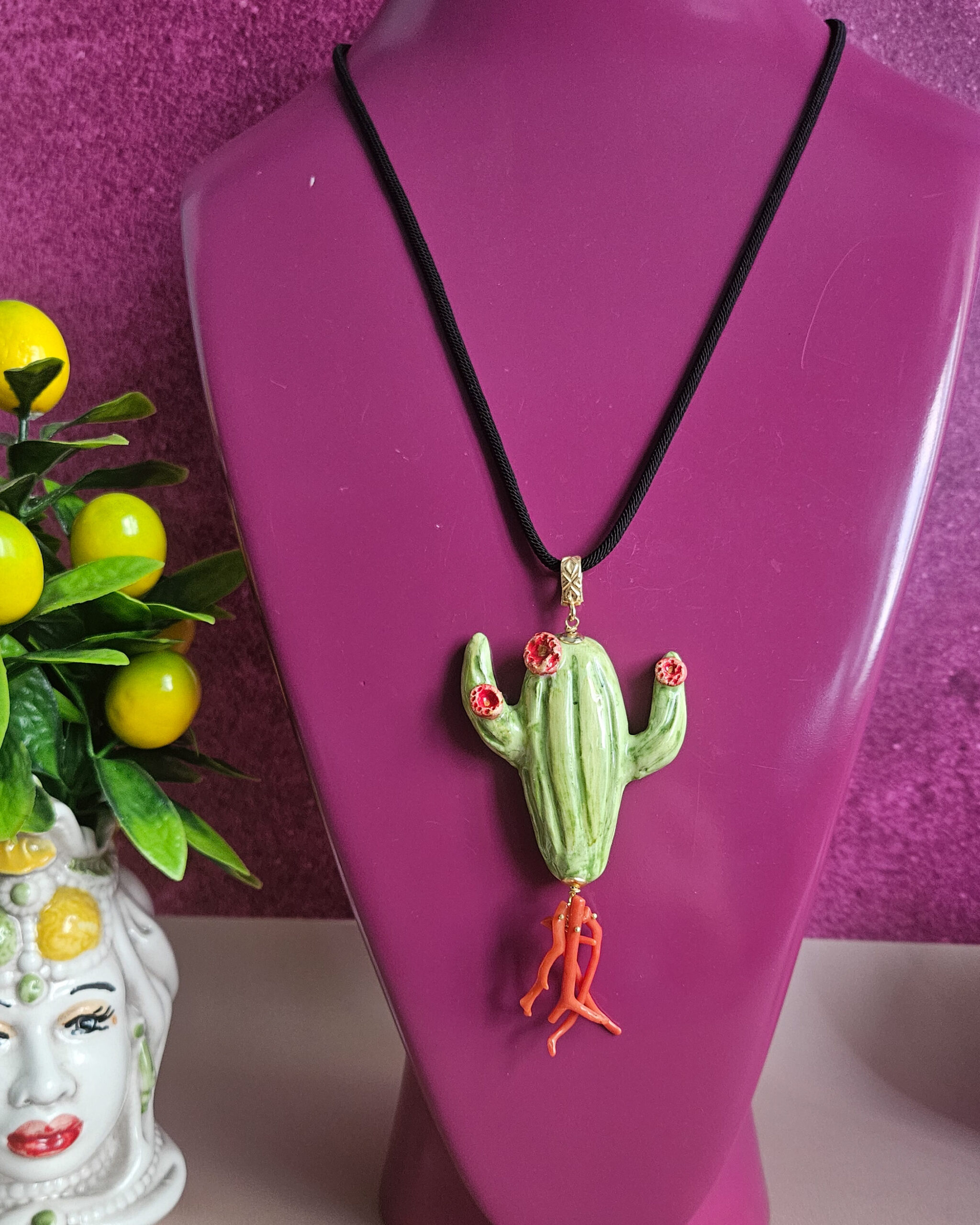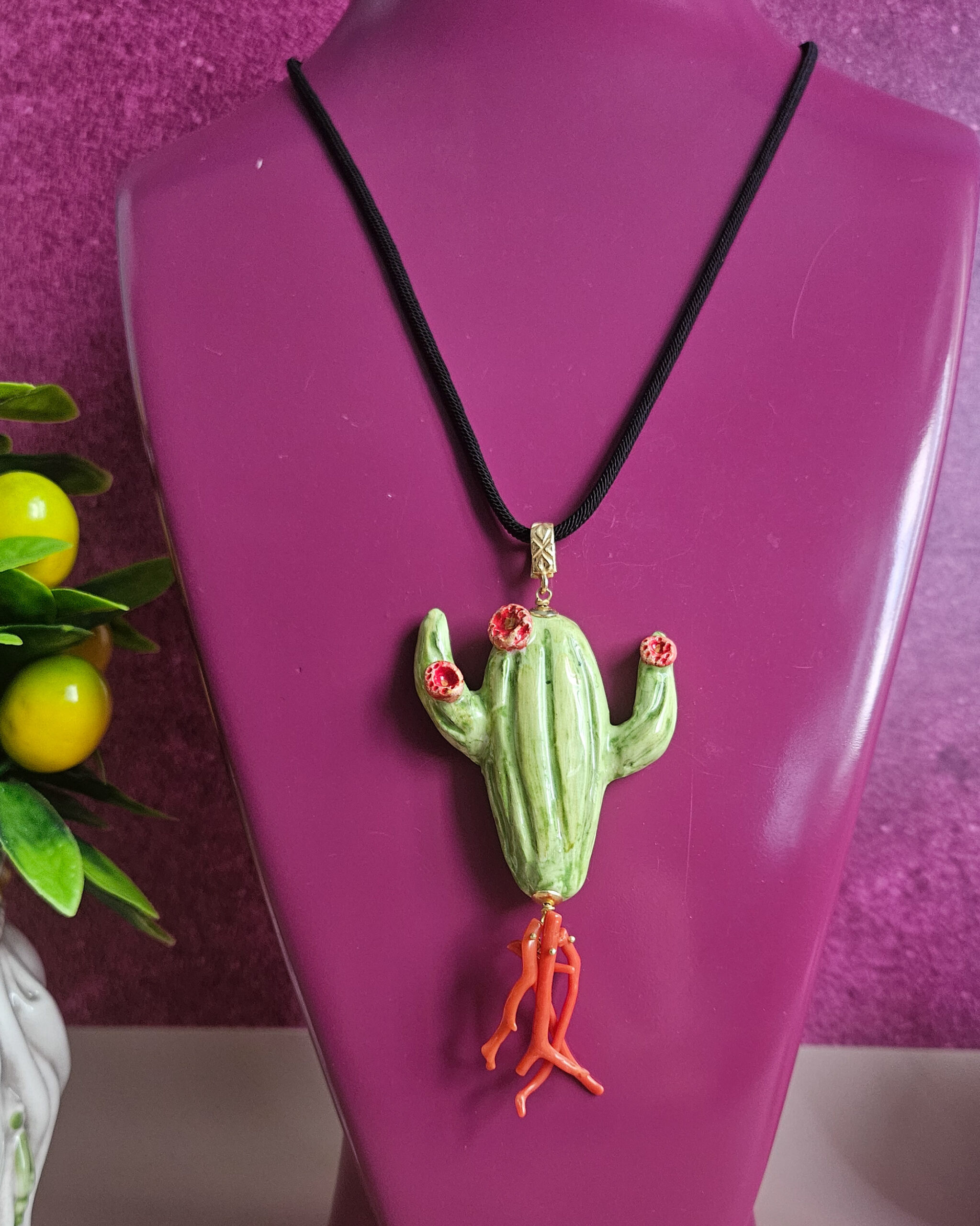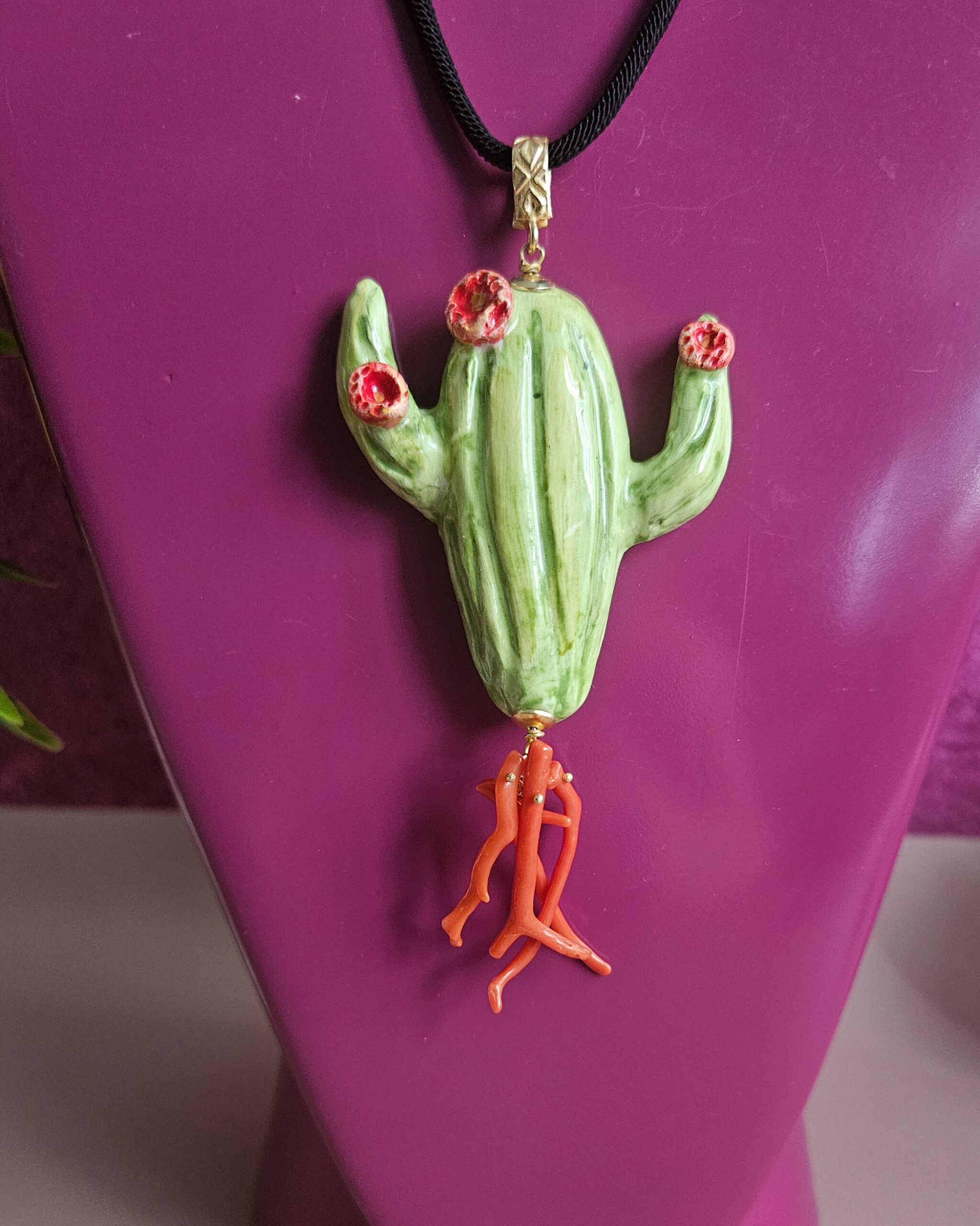 Collana di Corda con Fico d’India in Ceramica di Caltagirone e Corallo Rosso