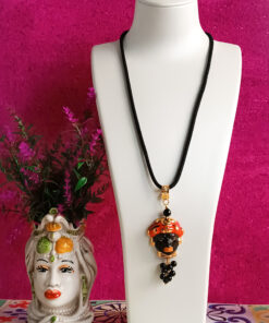 Uno splendido ciondolo, realizzato con moretto siciliano in Ceramica di Caltagirone e grappolo di Onice, a cui abbiamo abbinato una collana a corda invece del classico girocollo di pietre dure.