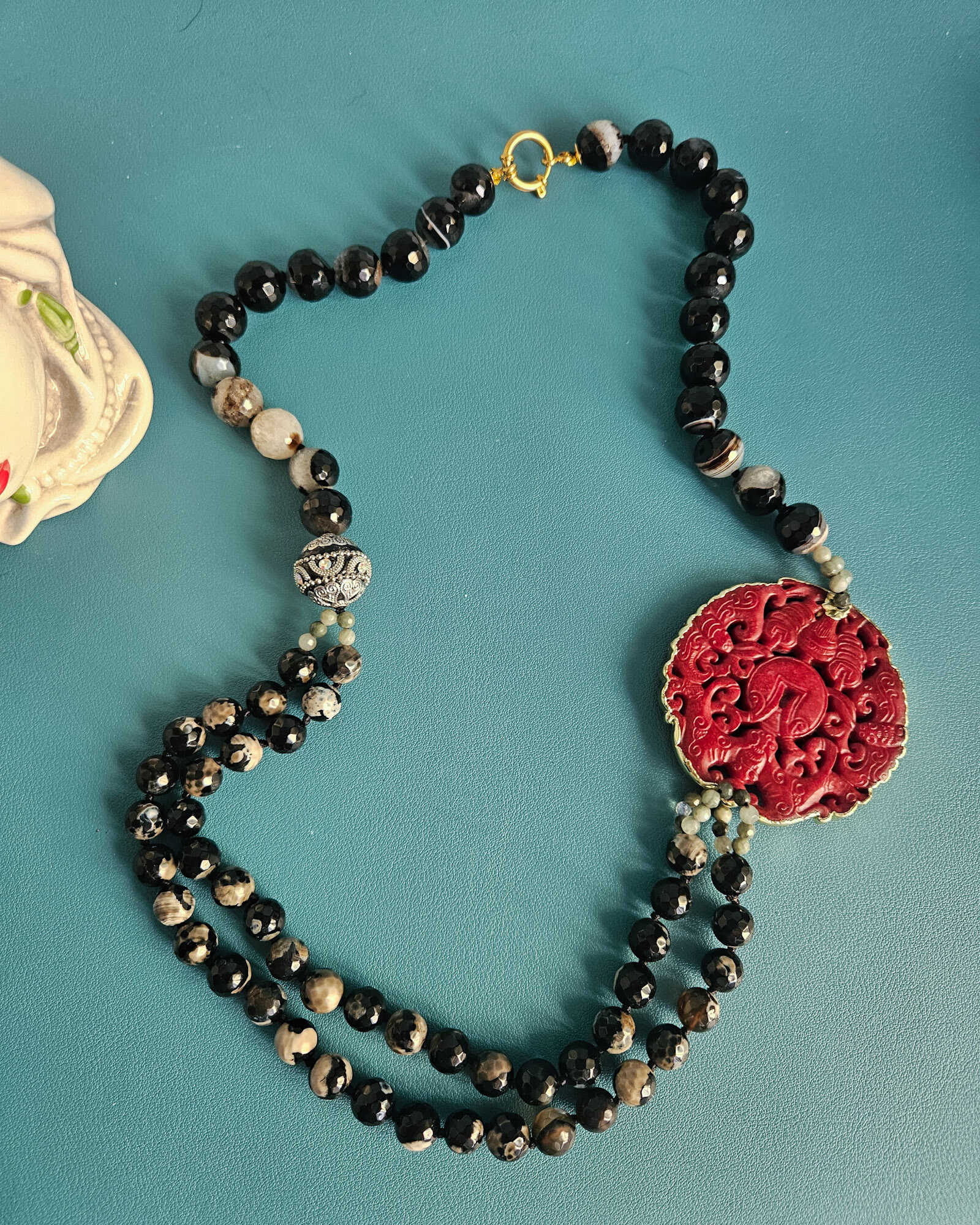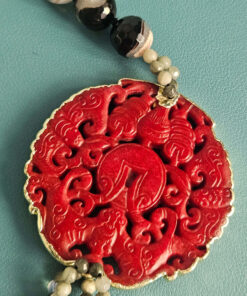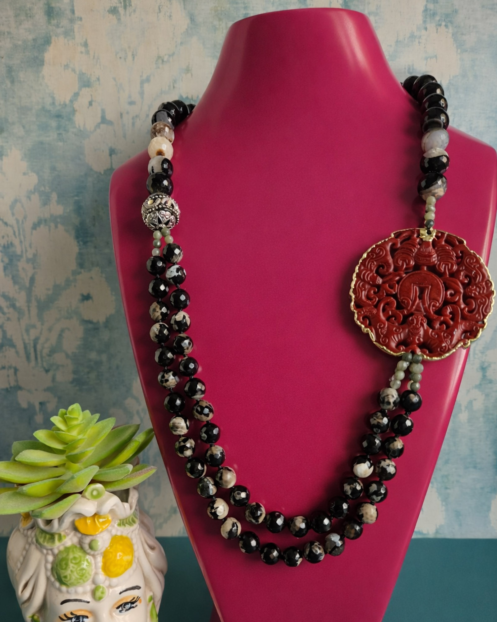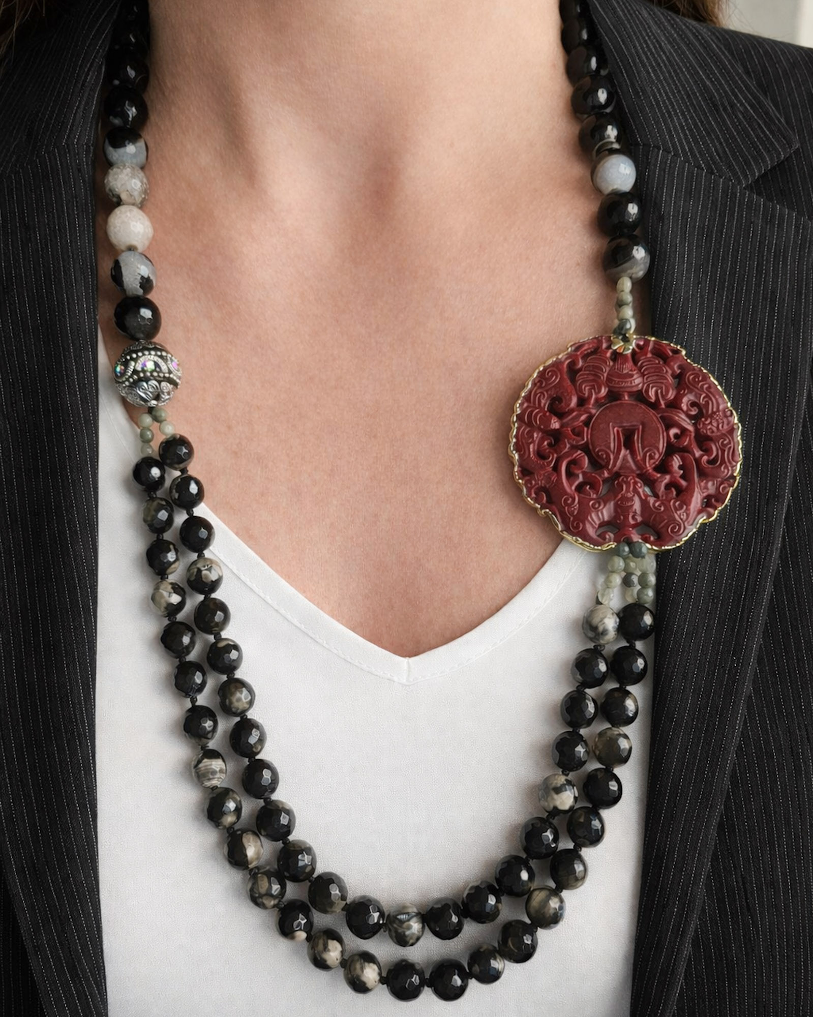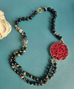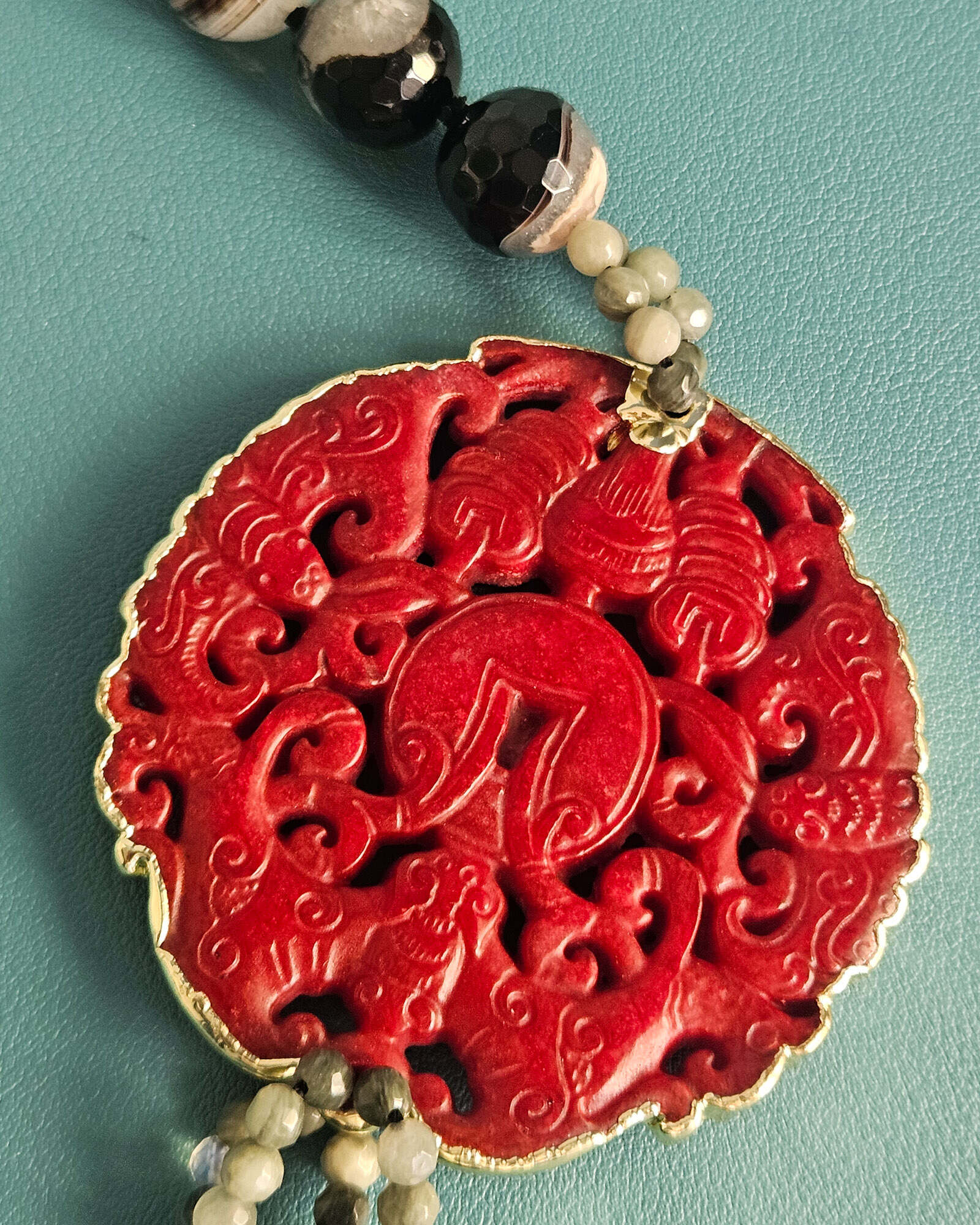 Al centro ho voluto qualcosa che catturasse lo sguardo: un grande medaglione in giada Burma rossa, scolpito con un motivo ornamentale ricco di dettagli. Il rosso intenso della giada emerge con forza sul nero delle pietre, creando un equilibrio molto deciso e scenografico.