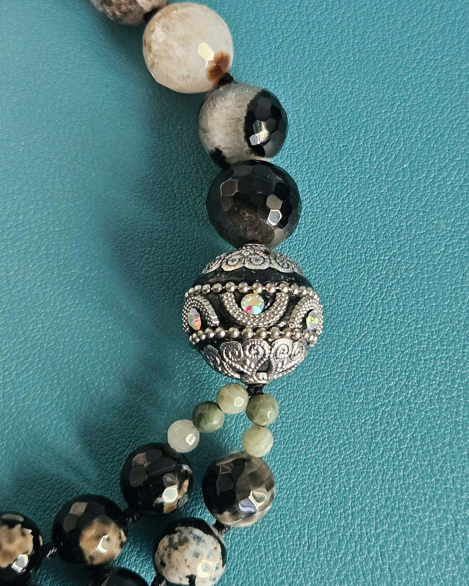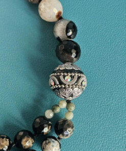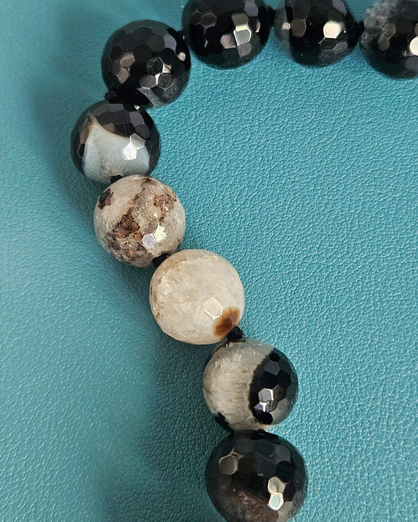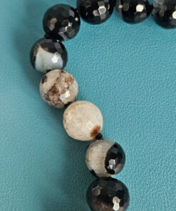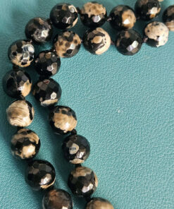 Ho scelto agata del Madagascar per il corpo della collana: pietre sfaccettate, profonde, con quelle venature naturali che rendono ogni sfera diversa dall’altra. Alcune sono quasi nere, altre attraversate da disegni color avorio e sabbia. È proprio questo contrasto naturale che crea movimento e carattere, senza bisogno di aggiungere altro.