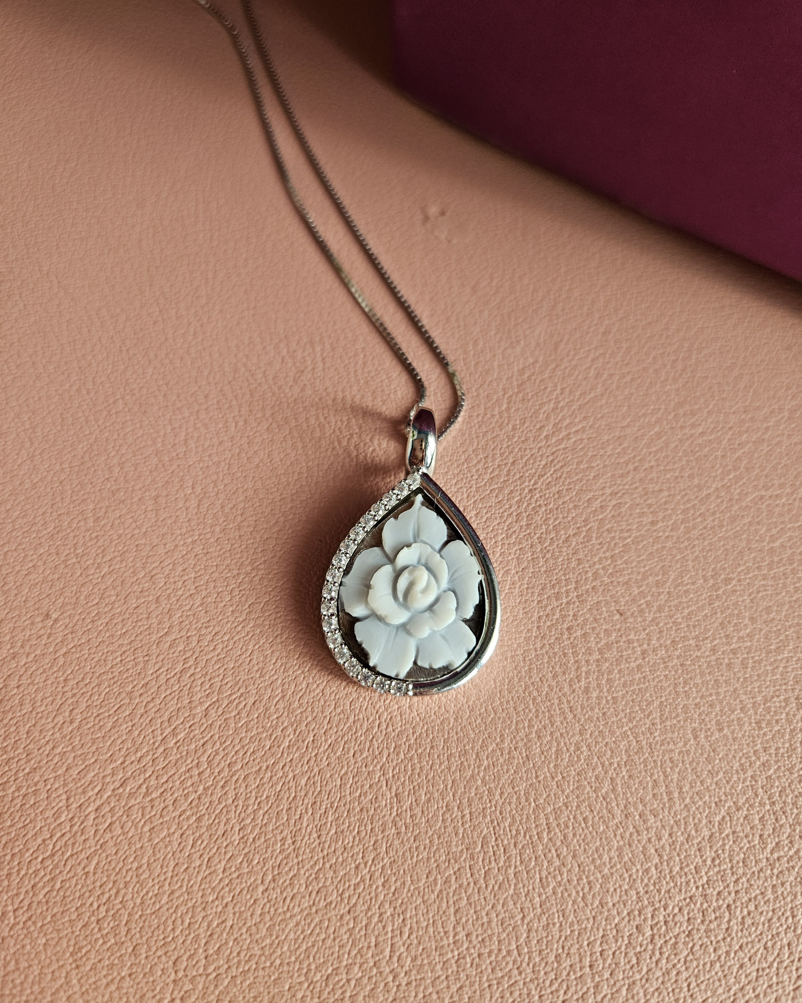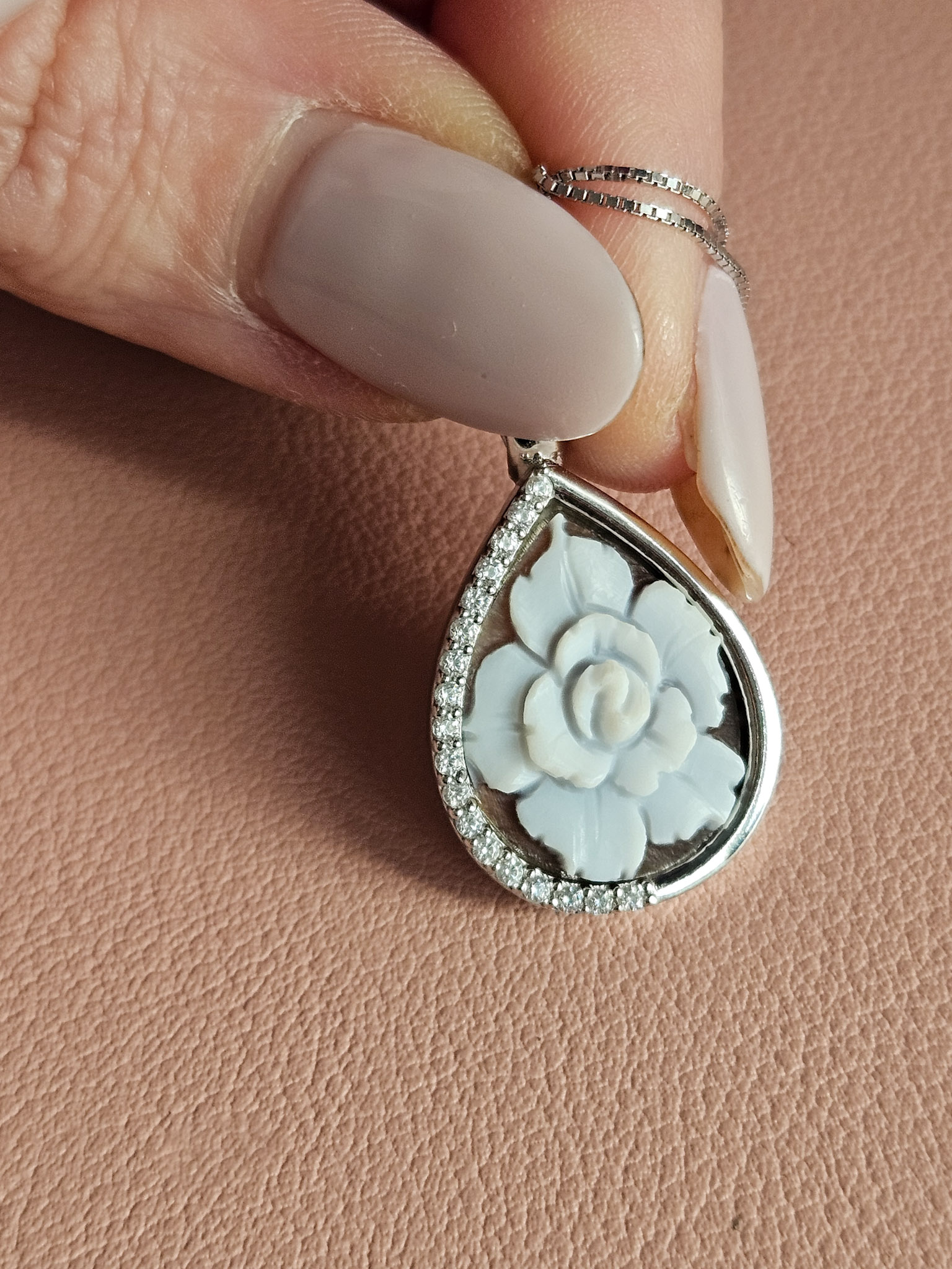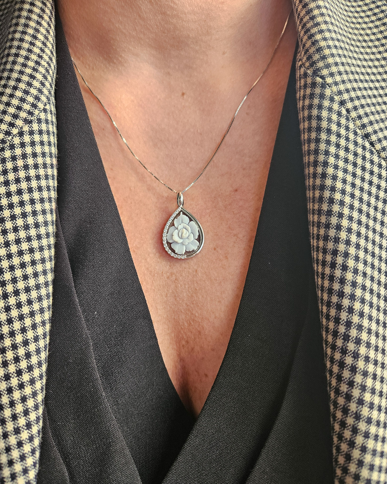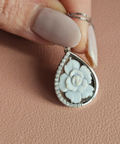 Una collanina delicatissima ed elegante realizzata con questo raffinatissimo ciondolo a goccia con cammeo incastonato.