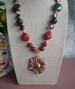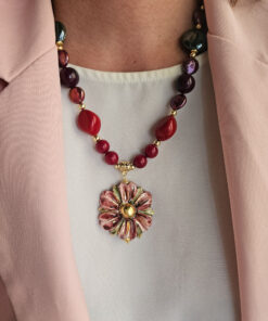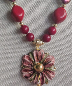 Collana Girocollo con Pasta di Corallo, Perle e Fiore in Ceramica di Caltagirone