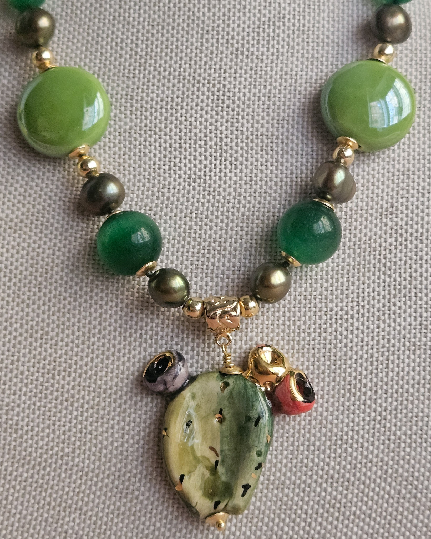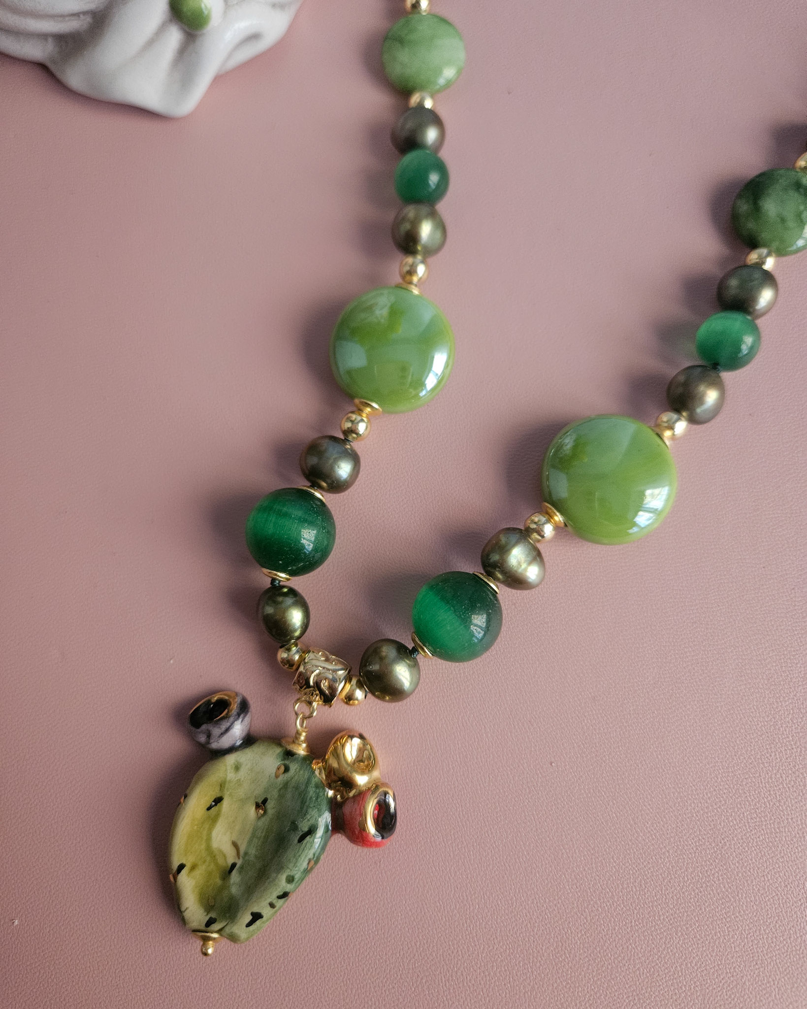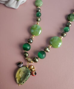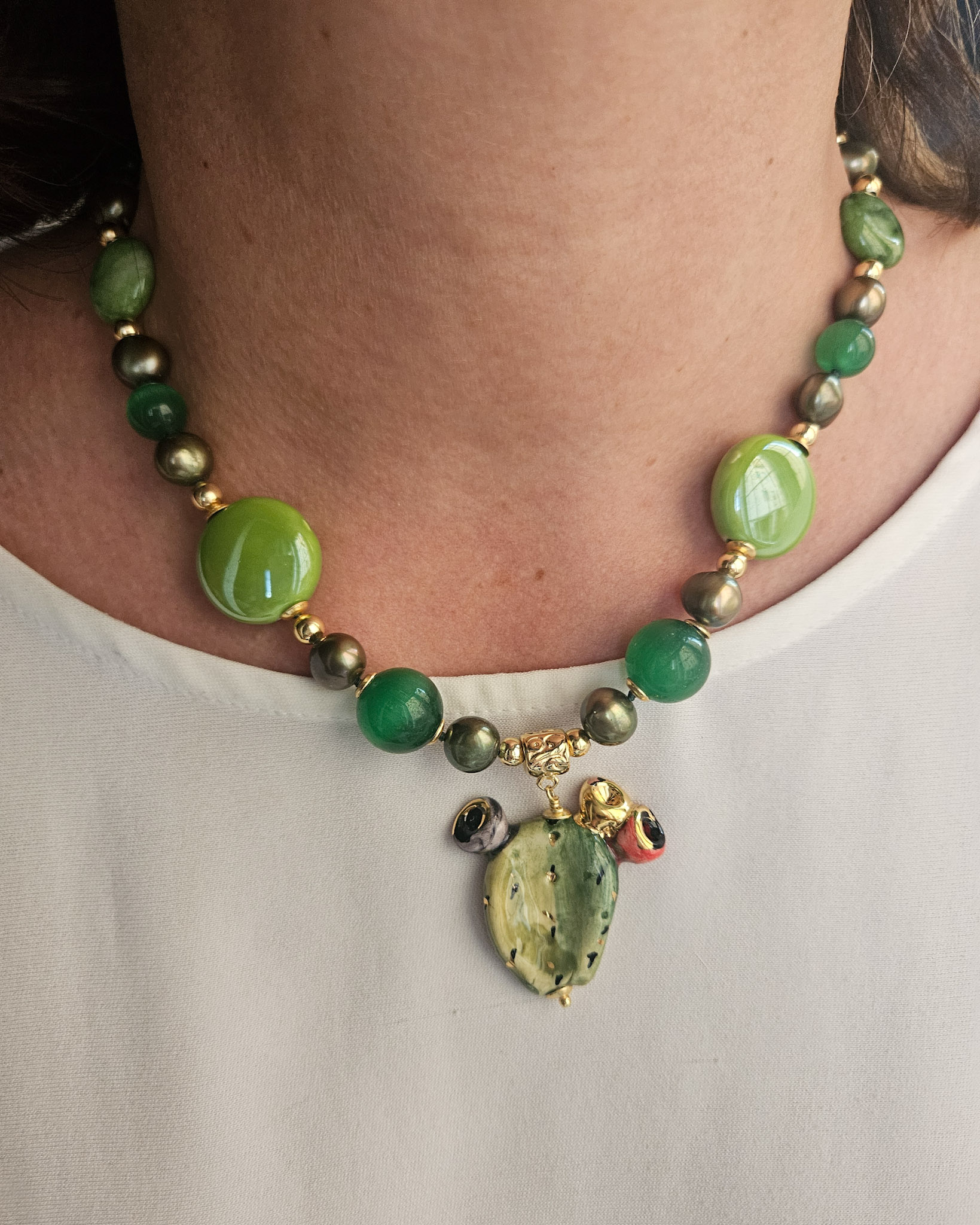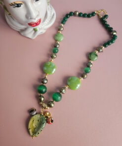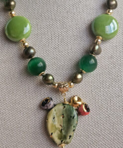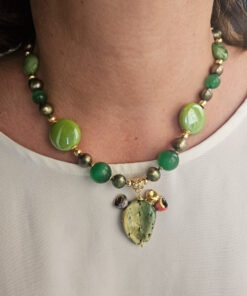 Una collana che racchiude ’energia e vitalità: realizzata con pietre dure verdi, perle colorate e un delizioso fico d’india in ceramica, che diventa protagonista del gioiello.