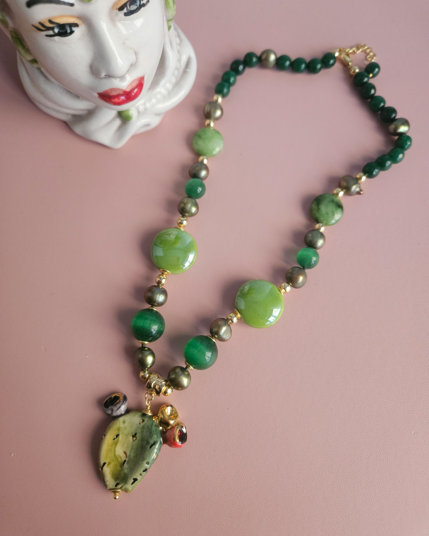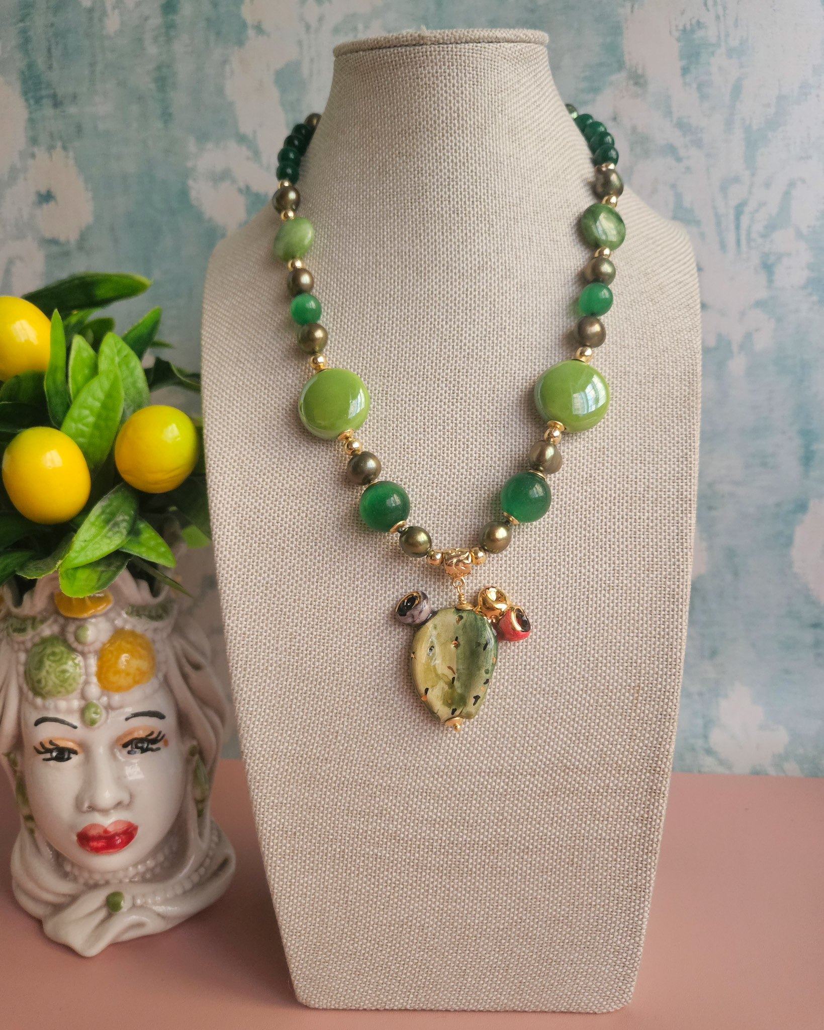 Collana Girocollo con Pietre Verdi e Fico D’India in Ceramica di Caltagirone
