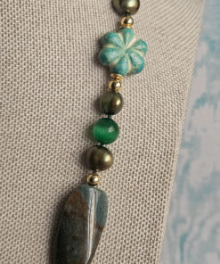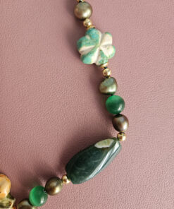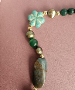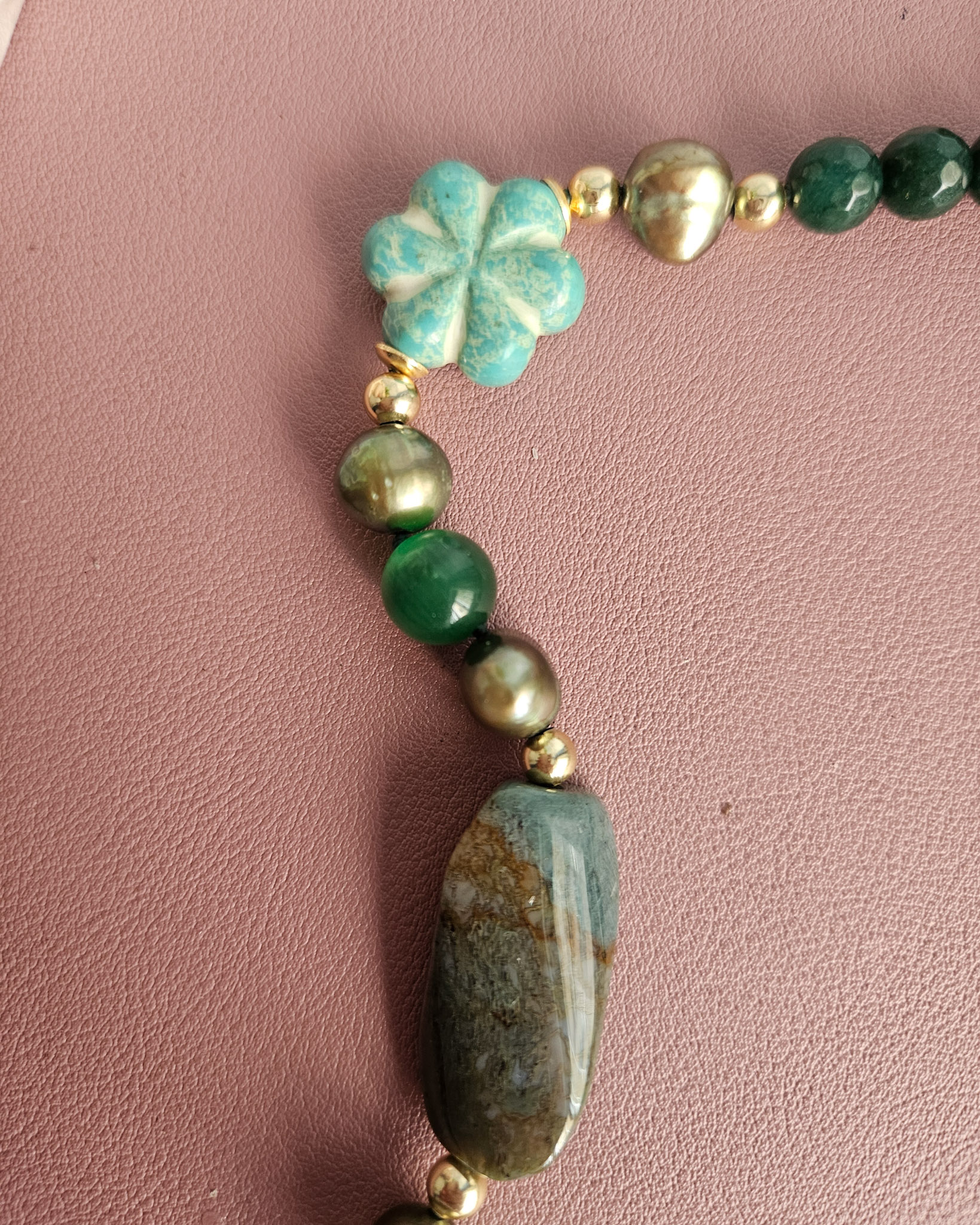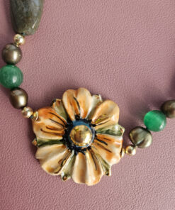 Una collana che racchiude energia e vitalità: realizzata con pietre dure verdi, pietre colorate, culmina in un delizioso fiore passante centrale che diventa protagonista assoluto del gioiello.
