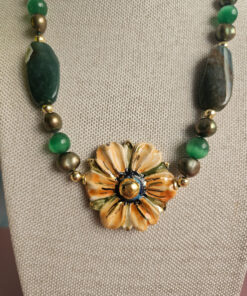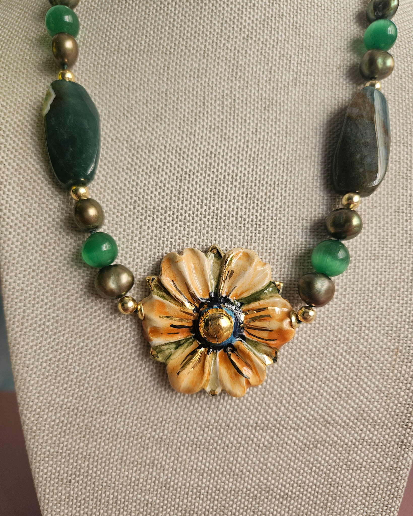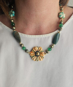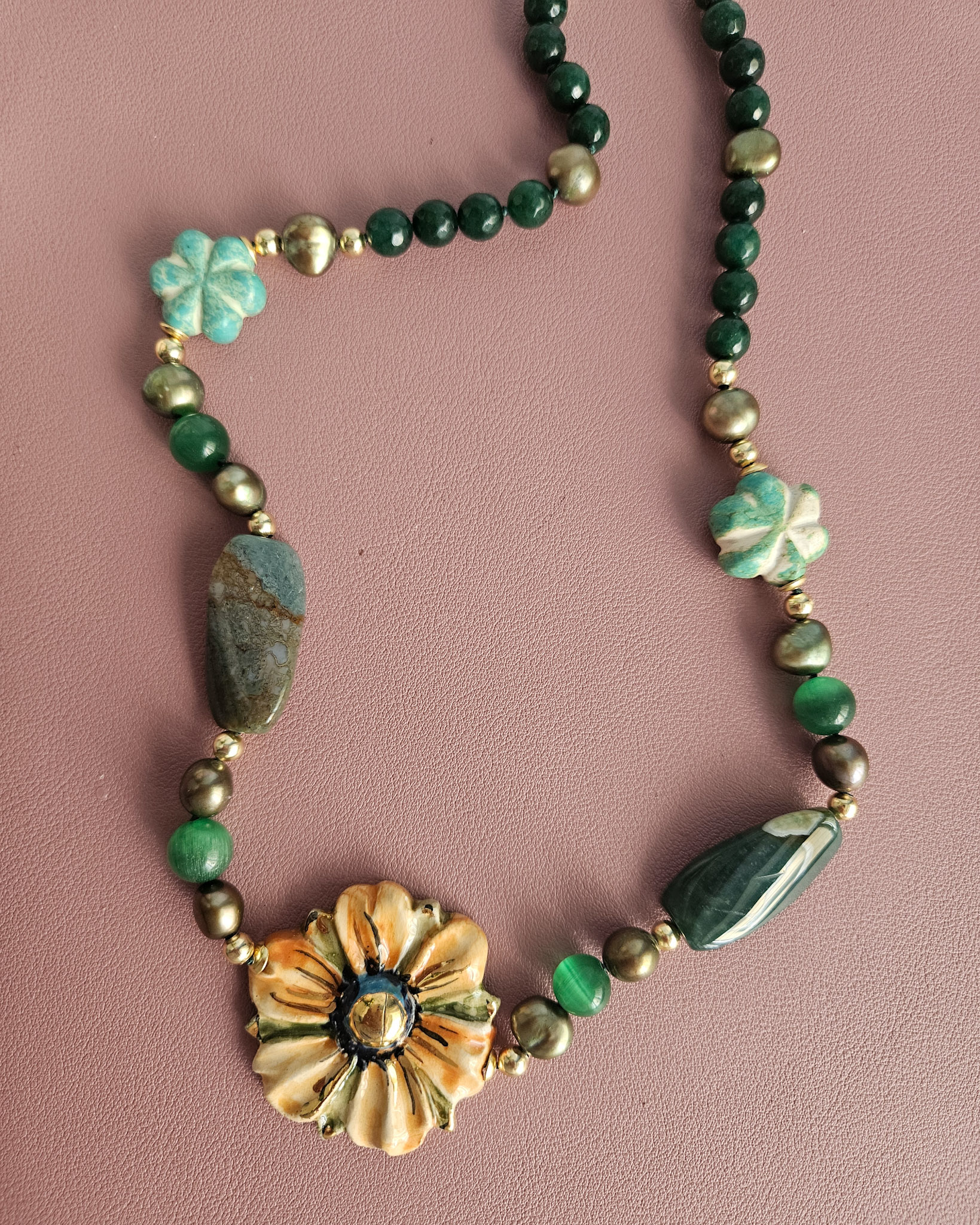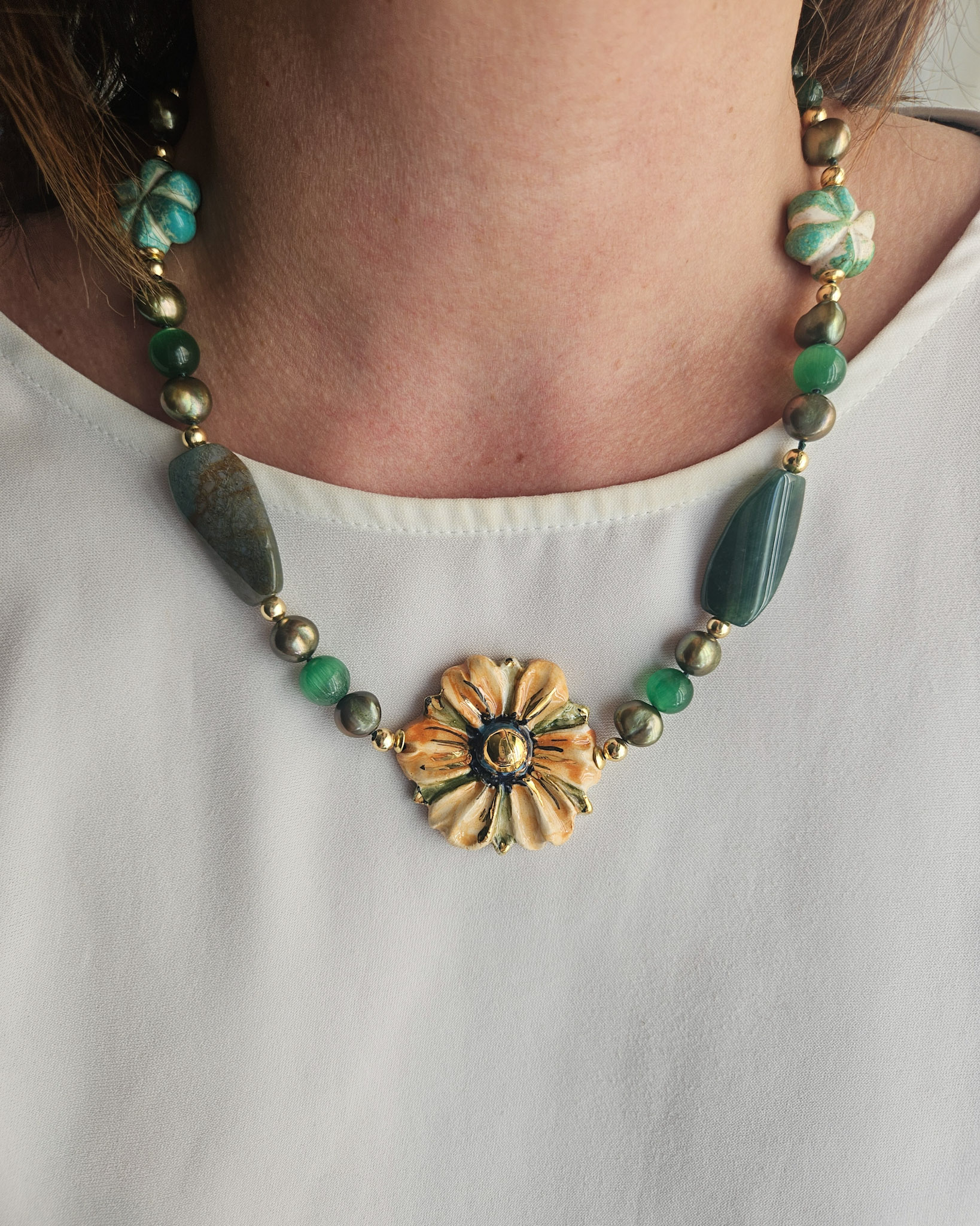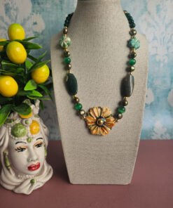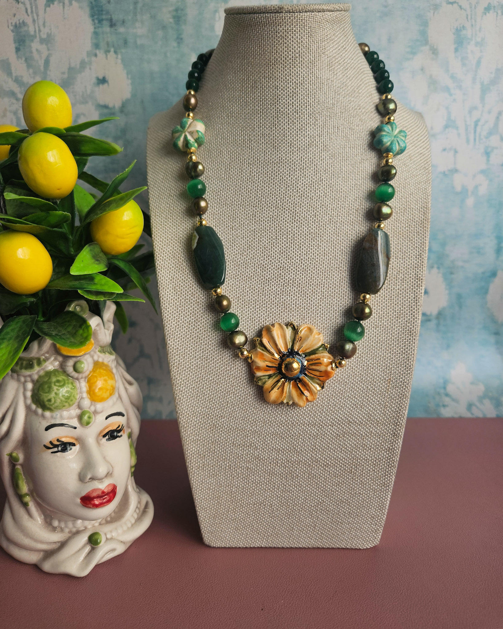 Collana Girocollo con Pietre Verdi e Fiore in Ceramica di Caltagirone