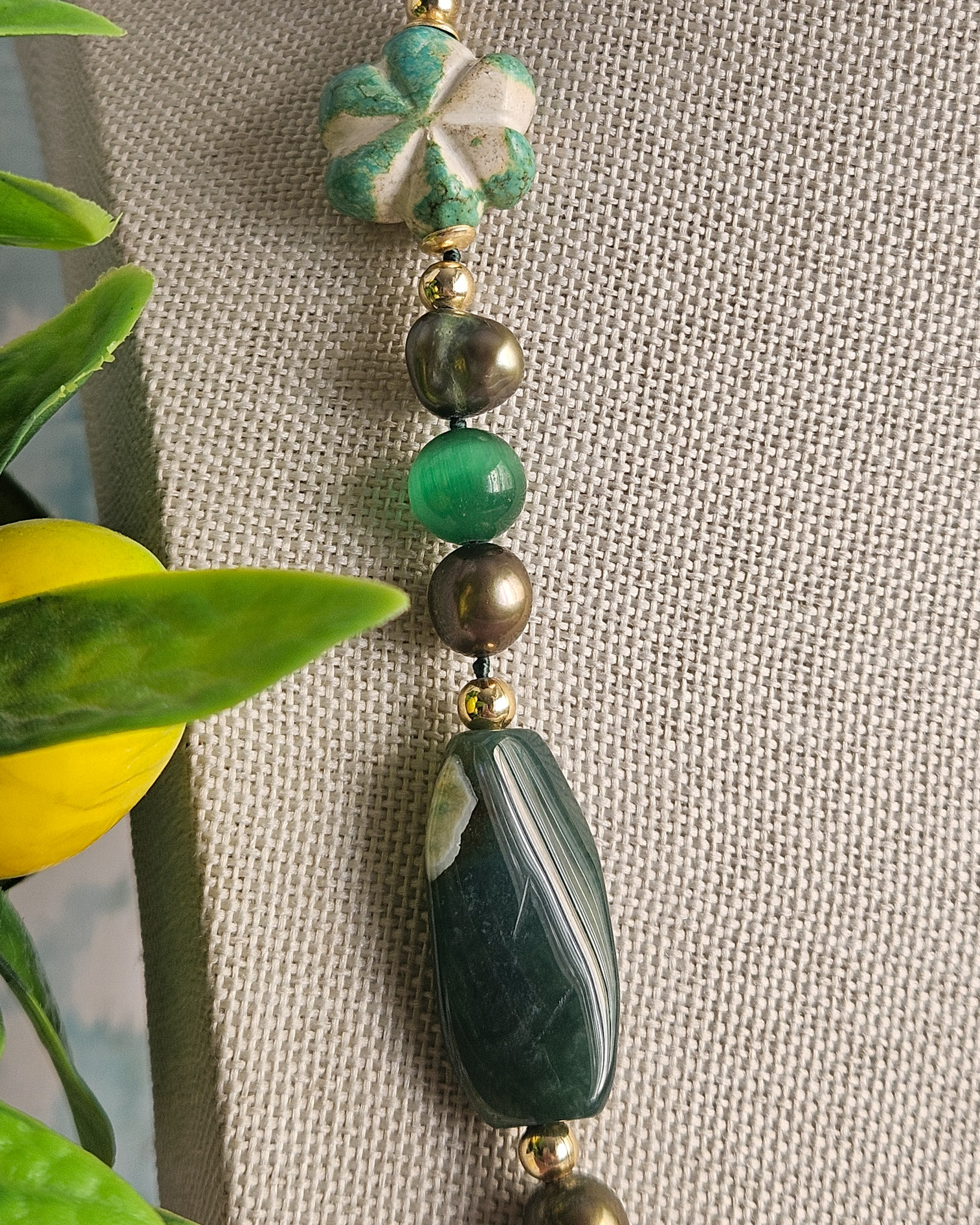 Il contrasto tra il verde intenso delle pietre e il giallo luminoso della ceramica dona un effetto vivace e raffinato, perfetto per chi ama accessori unici e colorati.