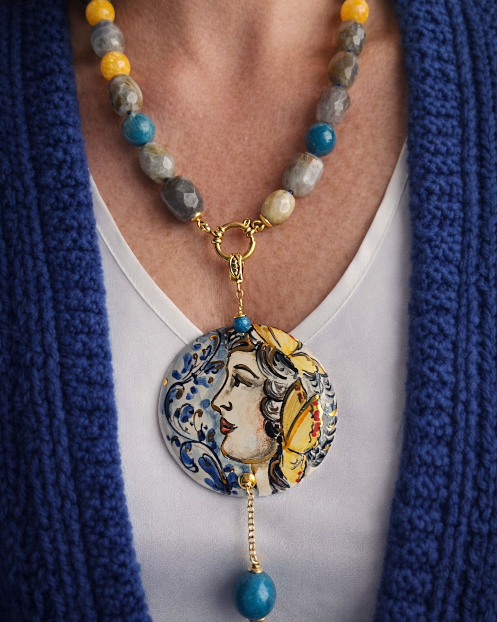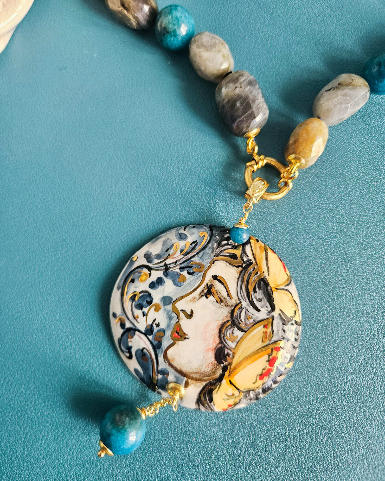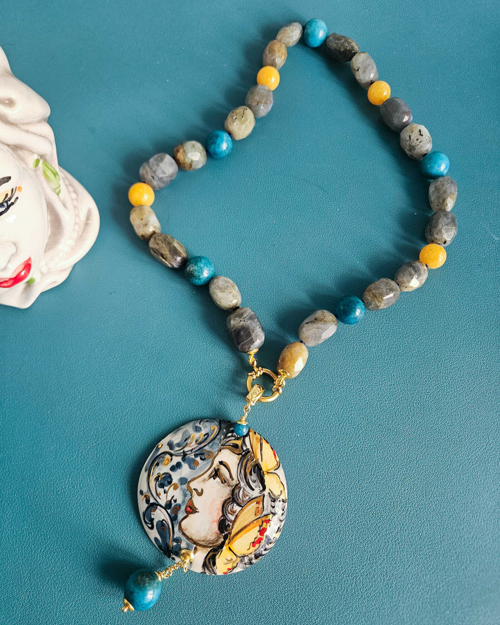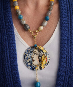 Il cuore della collana è il grande ciondolo in ceramica di Caltagirone, dipinto a mano: un volto femminile circondato da decorazioni blu e gialle che richiamano immediatamente l’estetica mediterranea. È una piccola opera d’arte da indossare.