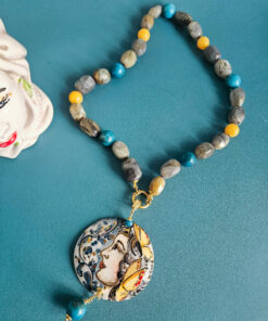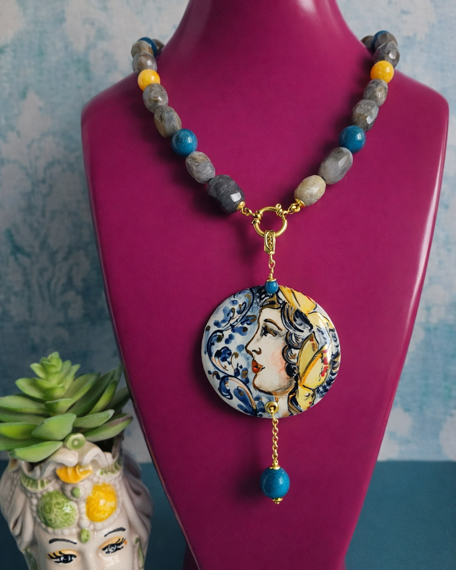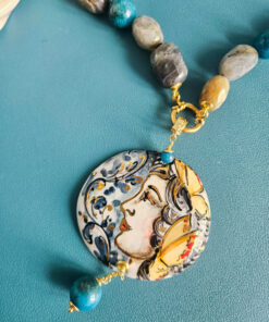 Collana Girocollo in Labradorite con Apatite, Giada Gialla e Ciondolo in Ceramica di Caltagirone
