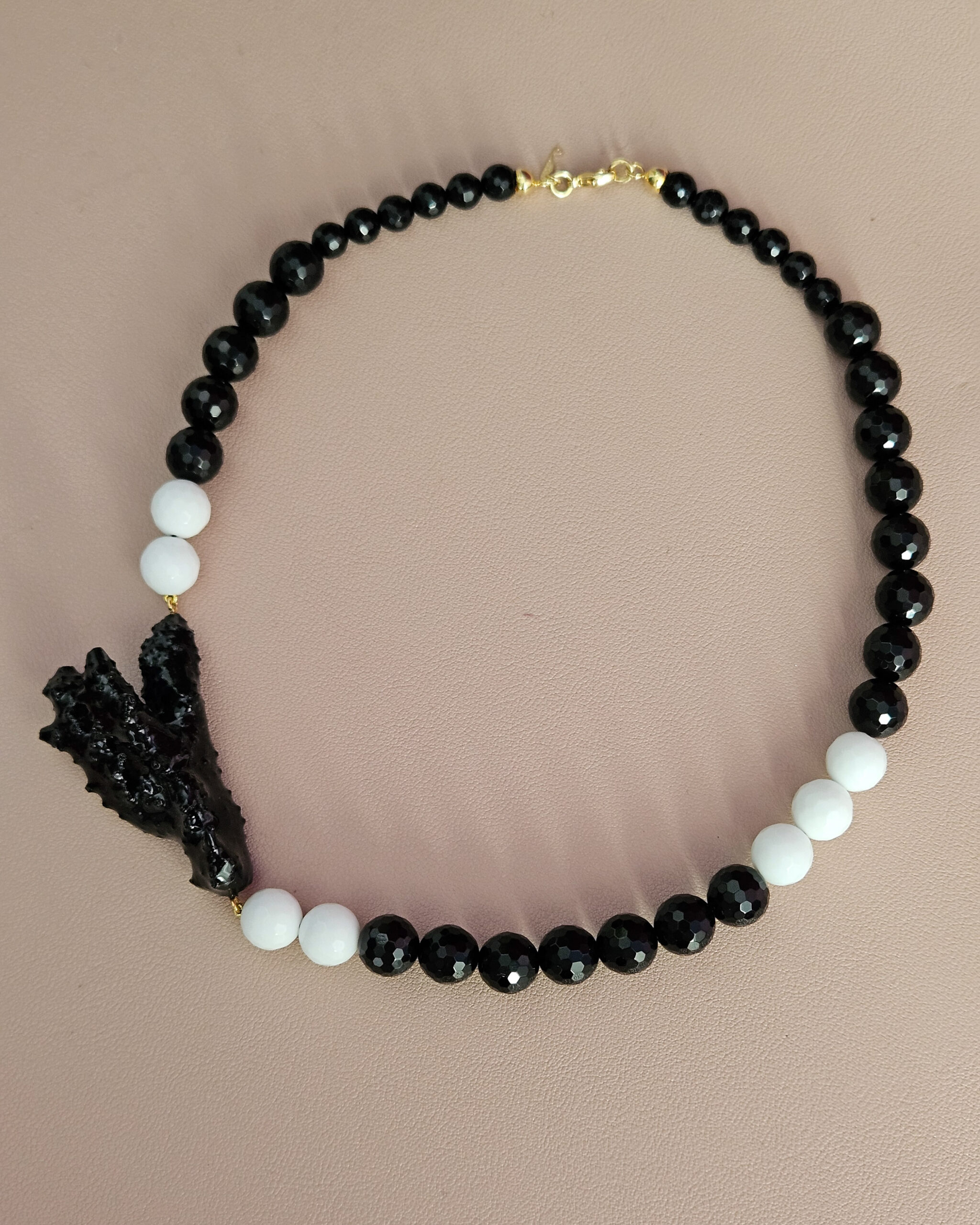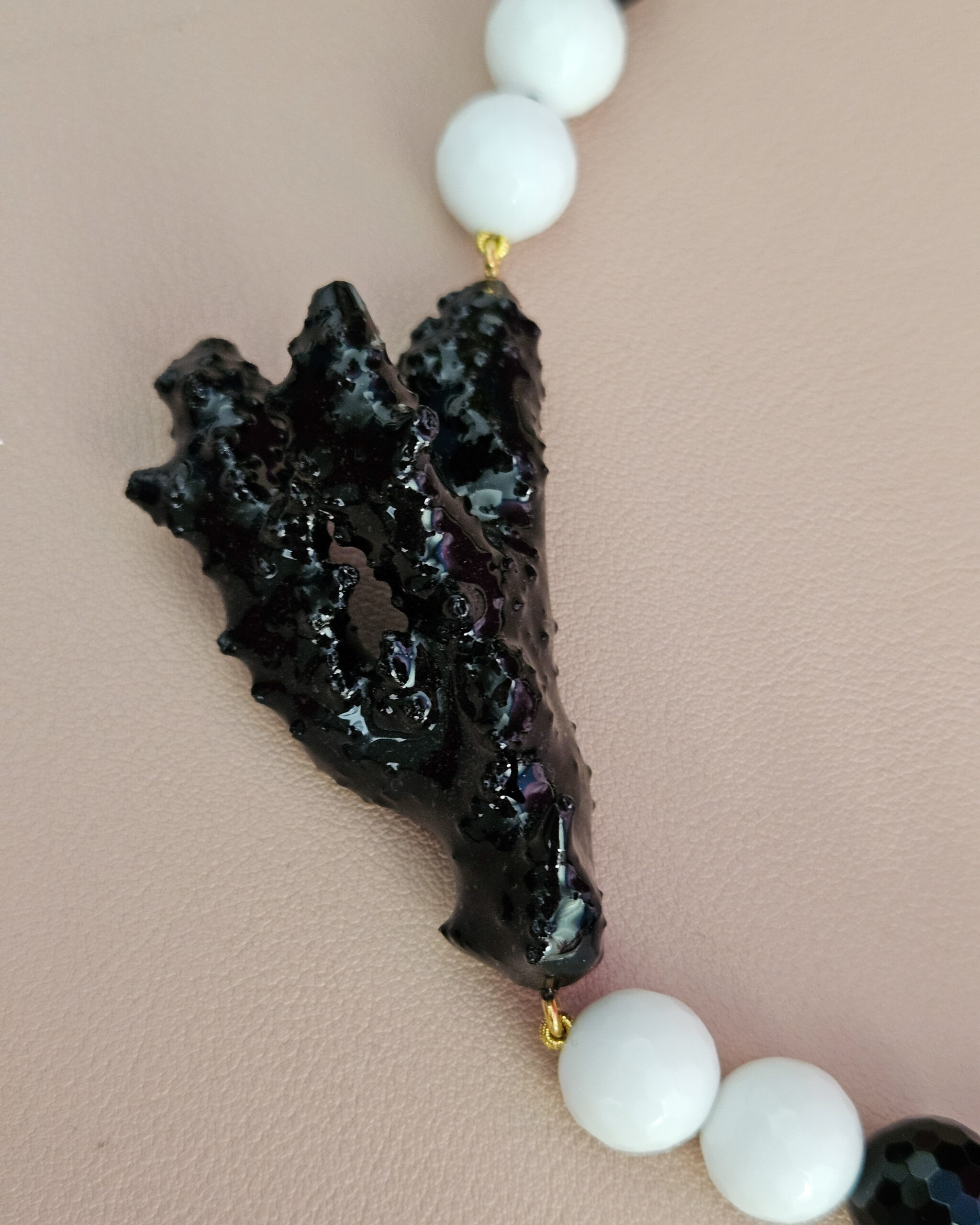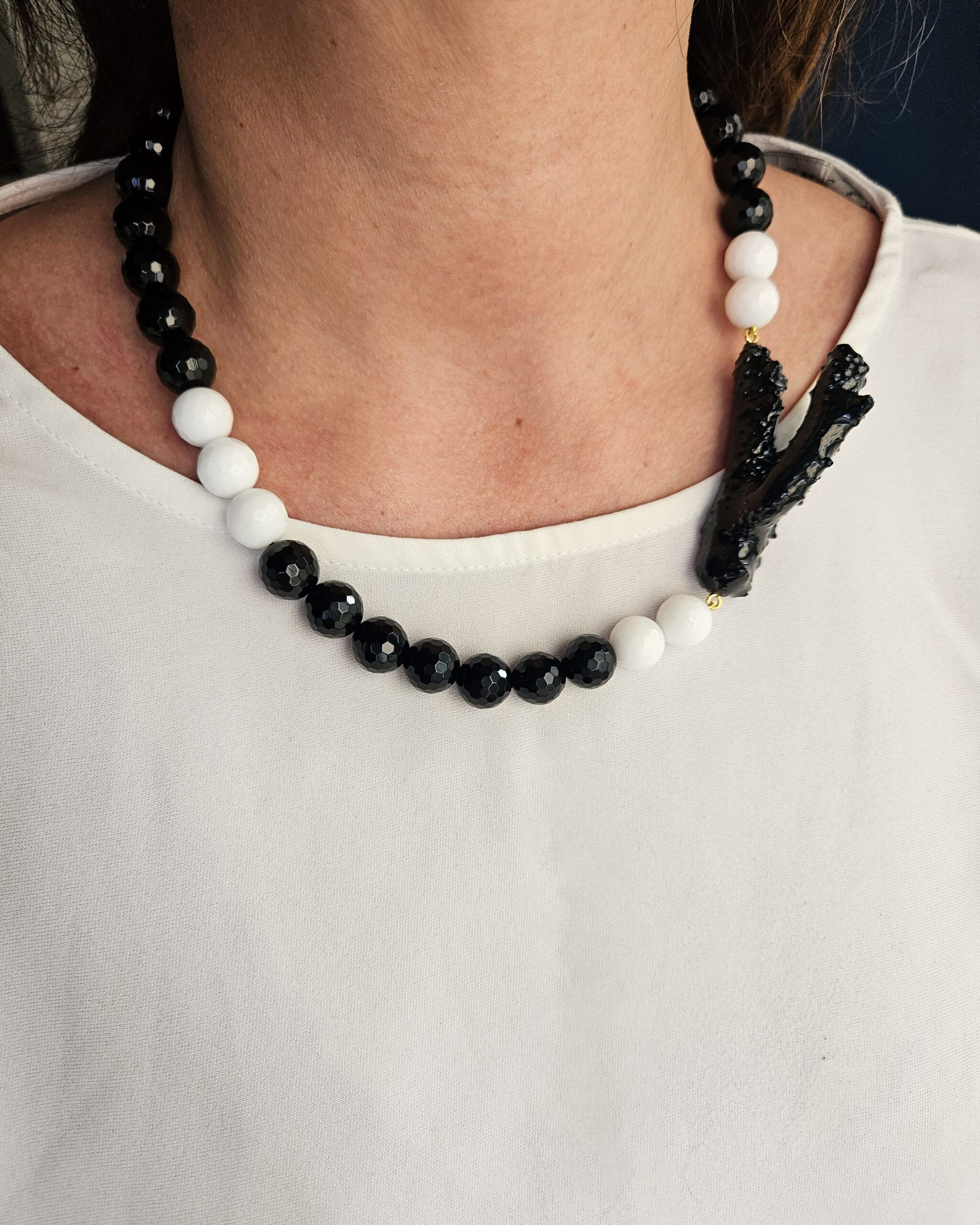 Collana Girocollo in Onice con Agata Bianca e Ramo di Corallo Madrepora Nero