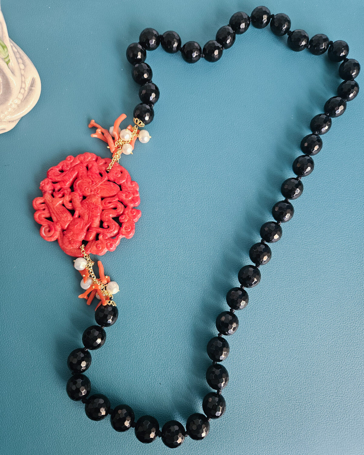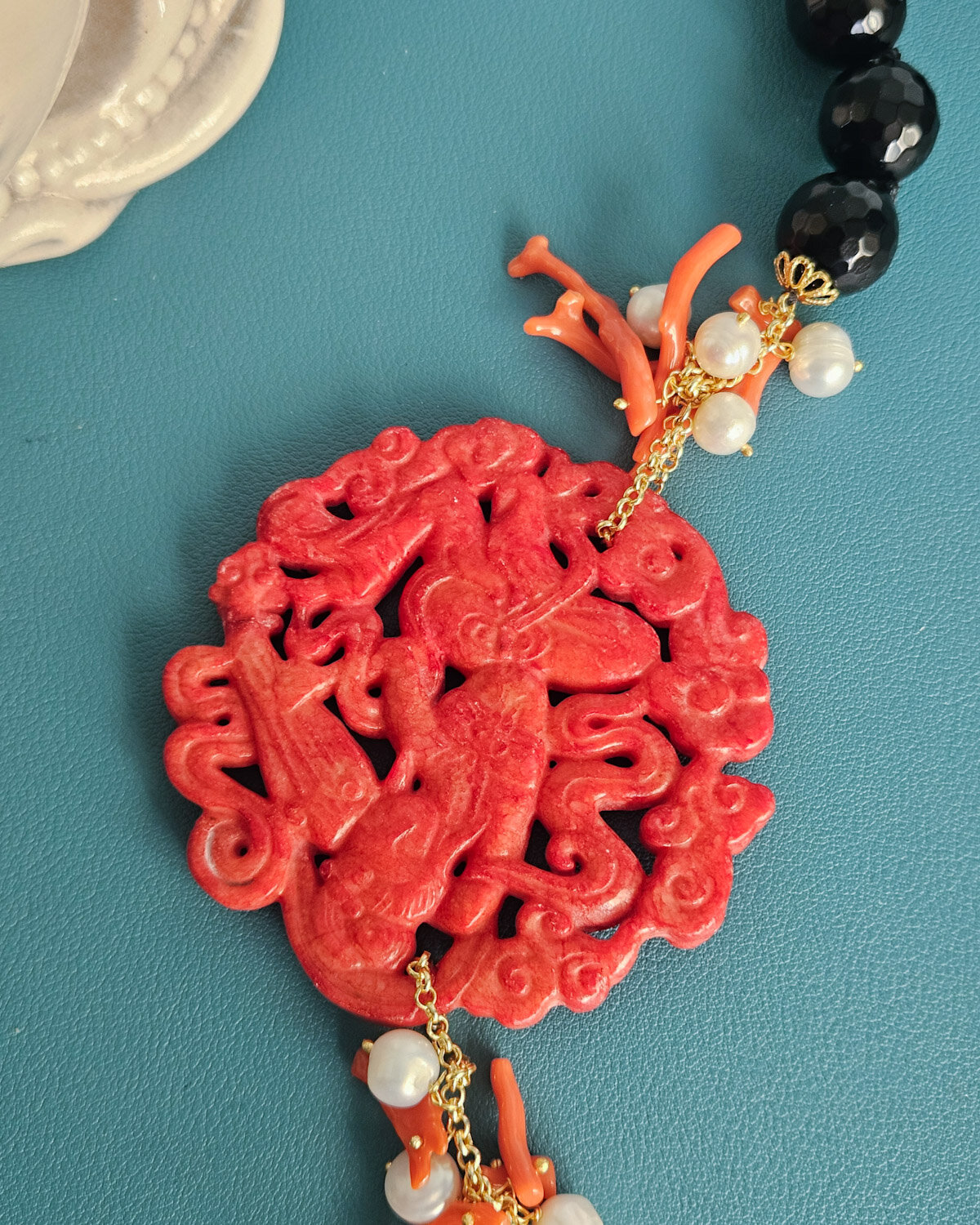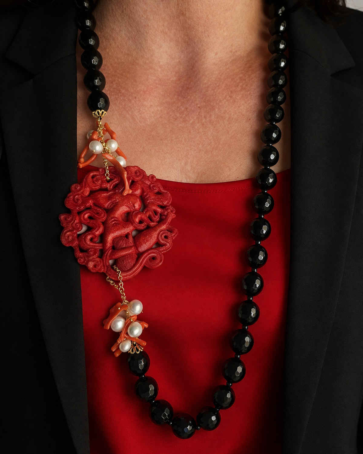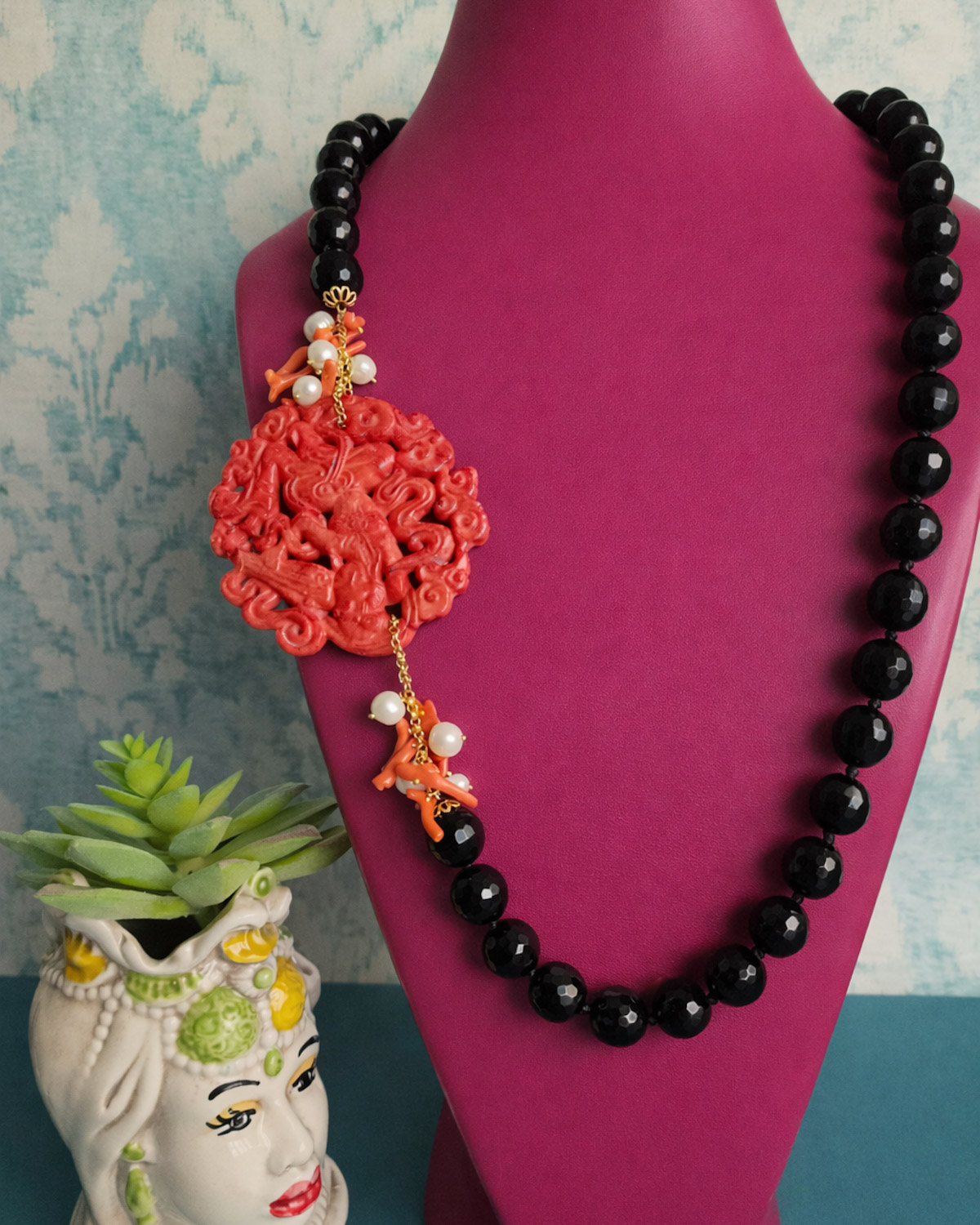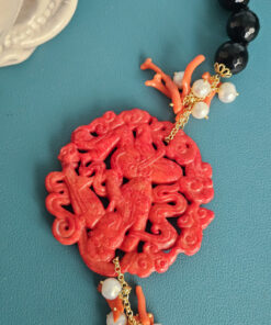 Questa collana è il tipo di accessorio che scegli quando vuoi qualcosa di particolare, non scontato, costruito con materiali di pregio e con un gusto che si riconosce subito. È una collana costruita su contrasti intelligenti: il nero profondo dell’onice valorizza i toni caldi del rosso, mentre la giada Burma introduce una sfumatura più morbida, quasi vellutata, che rende l’insieme ancora più ricercato.