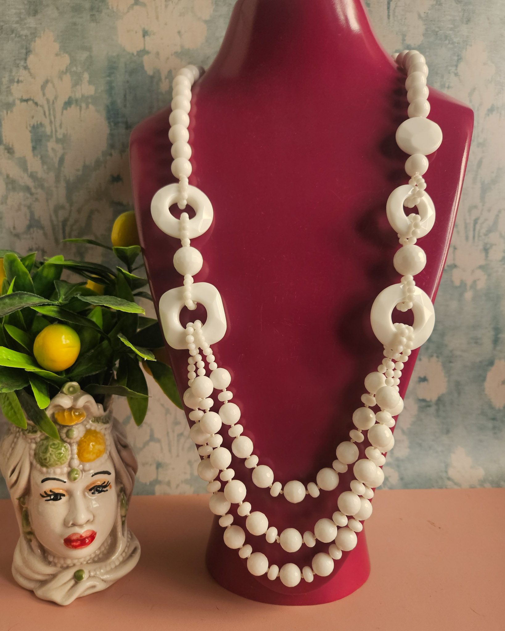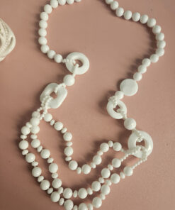Questa collana in agata bianca è un gioiello che cattura immediatamente l’attenzione per la sua luminosità e l’originale composizione di forme e volumi. Le pietre tonde, alternate agli elementi geometrici più grandi, creano un equilibrio perfetto tra classicità e modernità.