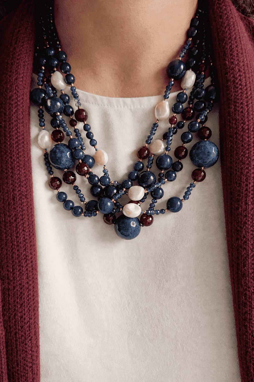 Collana Multifilo con Agata Blu, Borgogna e Perle di Fiume
