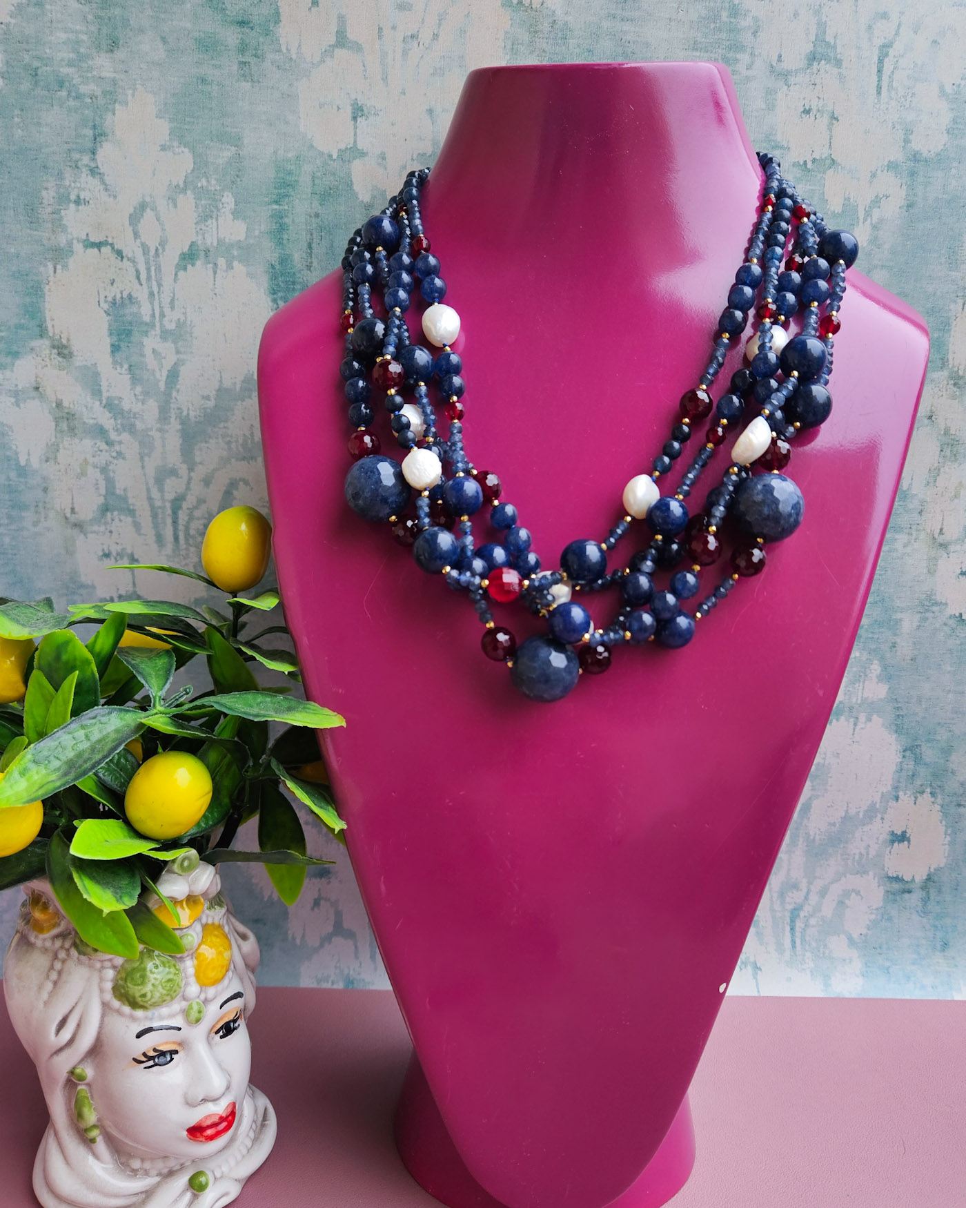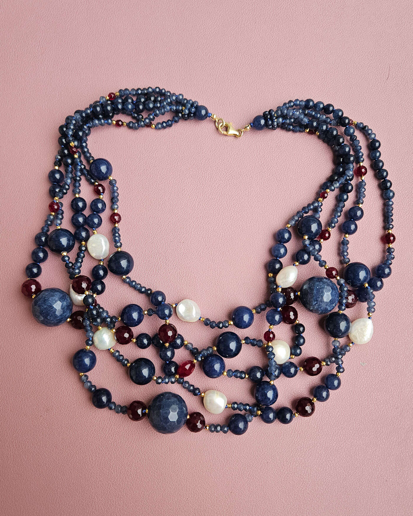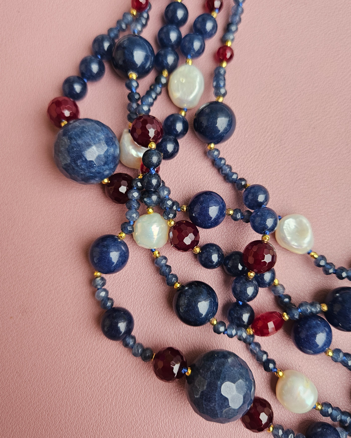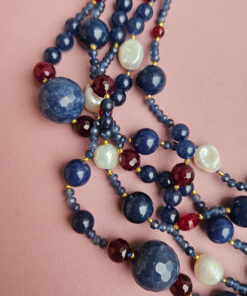 Questa collana è un gioiello molto vistoso e ricco di personalità, realizzato con 5 fili di agata blu borgogna e perle di fiume, sapientemente alternati per creare movimento, profondità e un elegante gioco di contrasti.