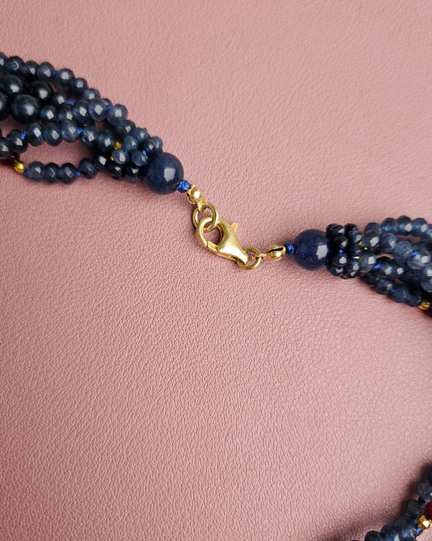 La sua particolarità sta nel fatto che non scende in modo regolare o a decrescere sullo scollo: i fili cadono in maniera volutamente casuale, sovrapponendosi con naturalezza. Questo effetto morbido e irregolare dona alla collana un aspetto dinamico e raffinato, rendendola unica e mai rigida. Le sfumature intense del blu borgogna dell’agata si armonizzano perfettamente con la luminosità naturale delle perle di fiume, creando un equilibrio tra forza e delicatezza.