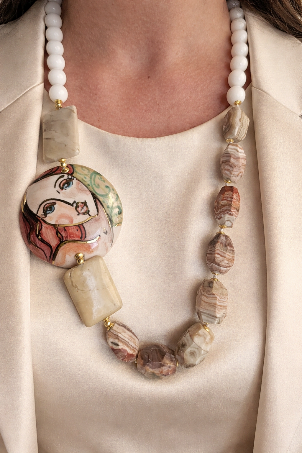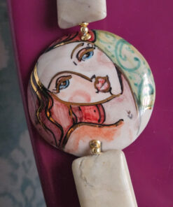 Al centro, un volto dipinto a mano emerge come da un sogno: sguardo deciso e area regale. Un dettaglio poetico che rende ogni collana unica, irripetibile, proprio come chi la indossa.