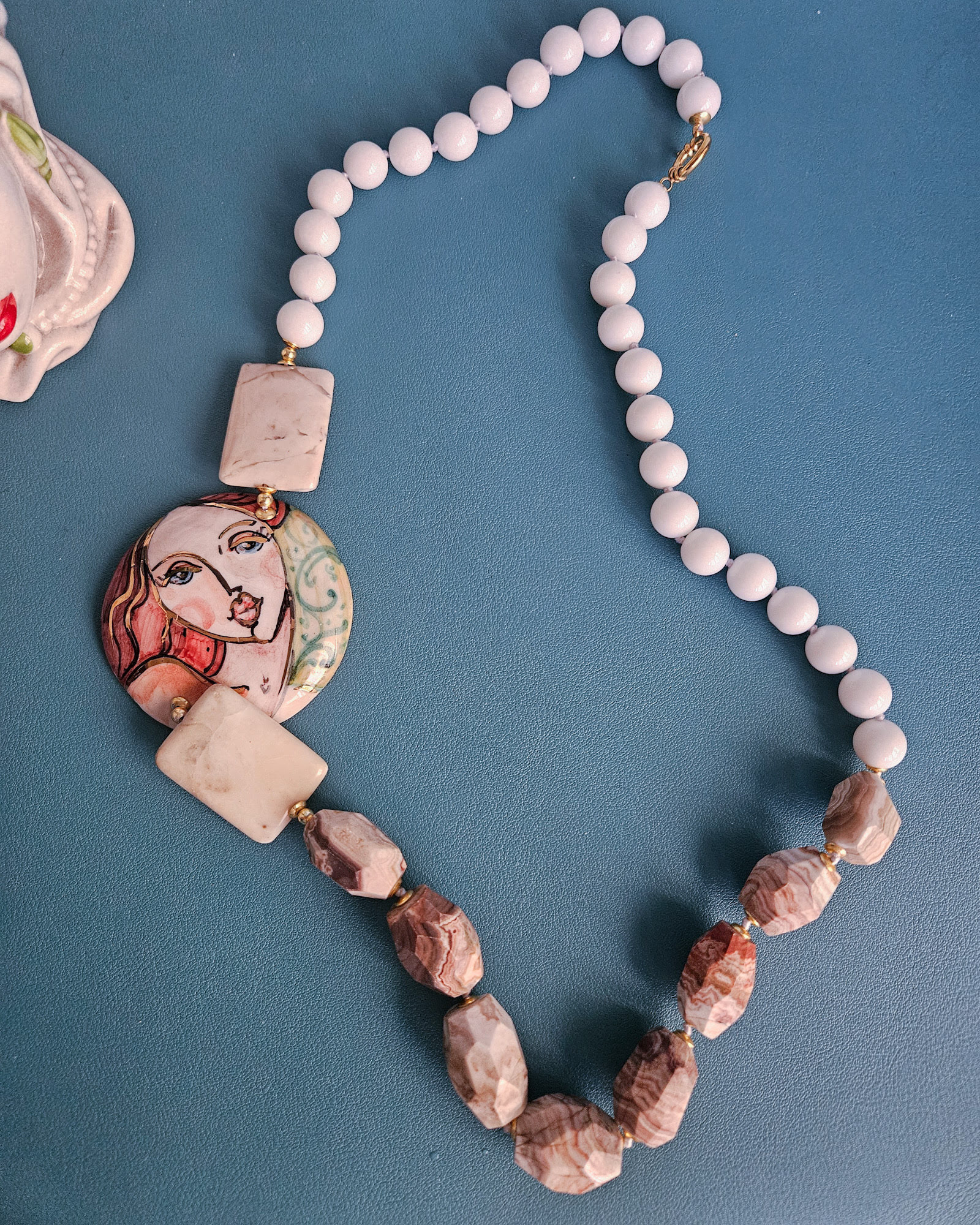 Collana Siciliana con Agata Bianca, Rodocrosite e Ceramica di Caltagirone Dipinta a Mano