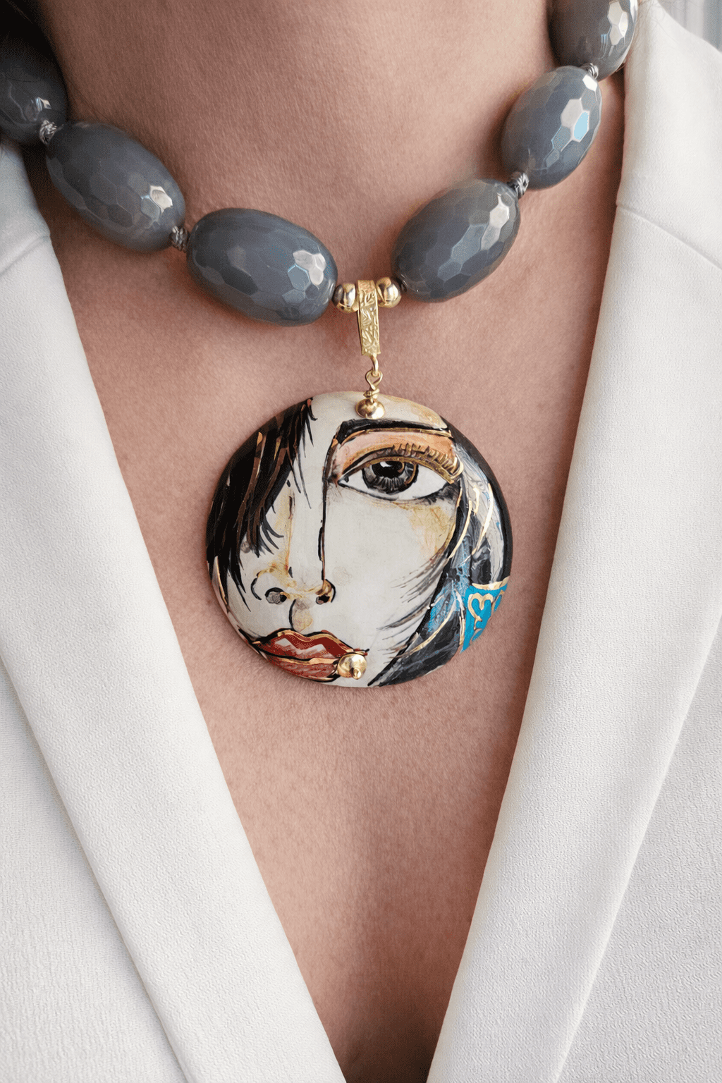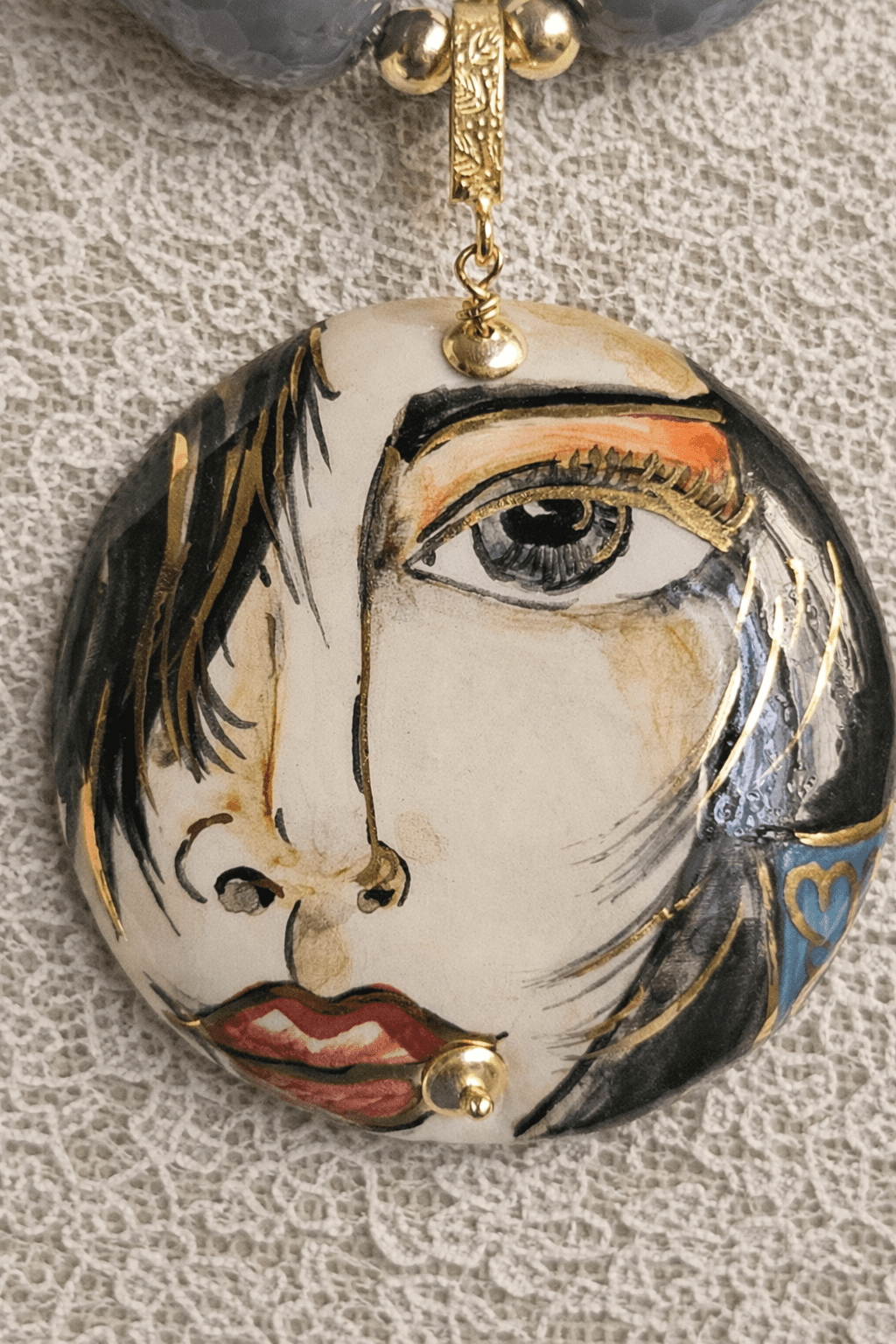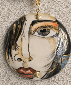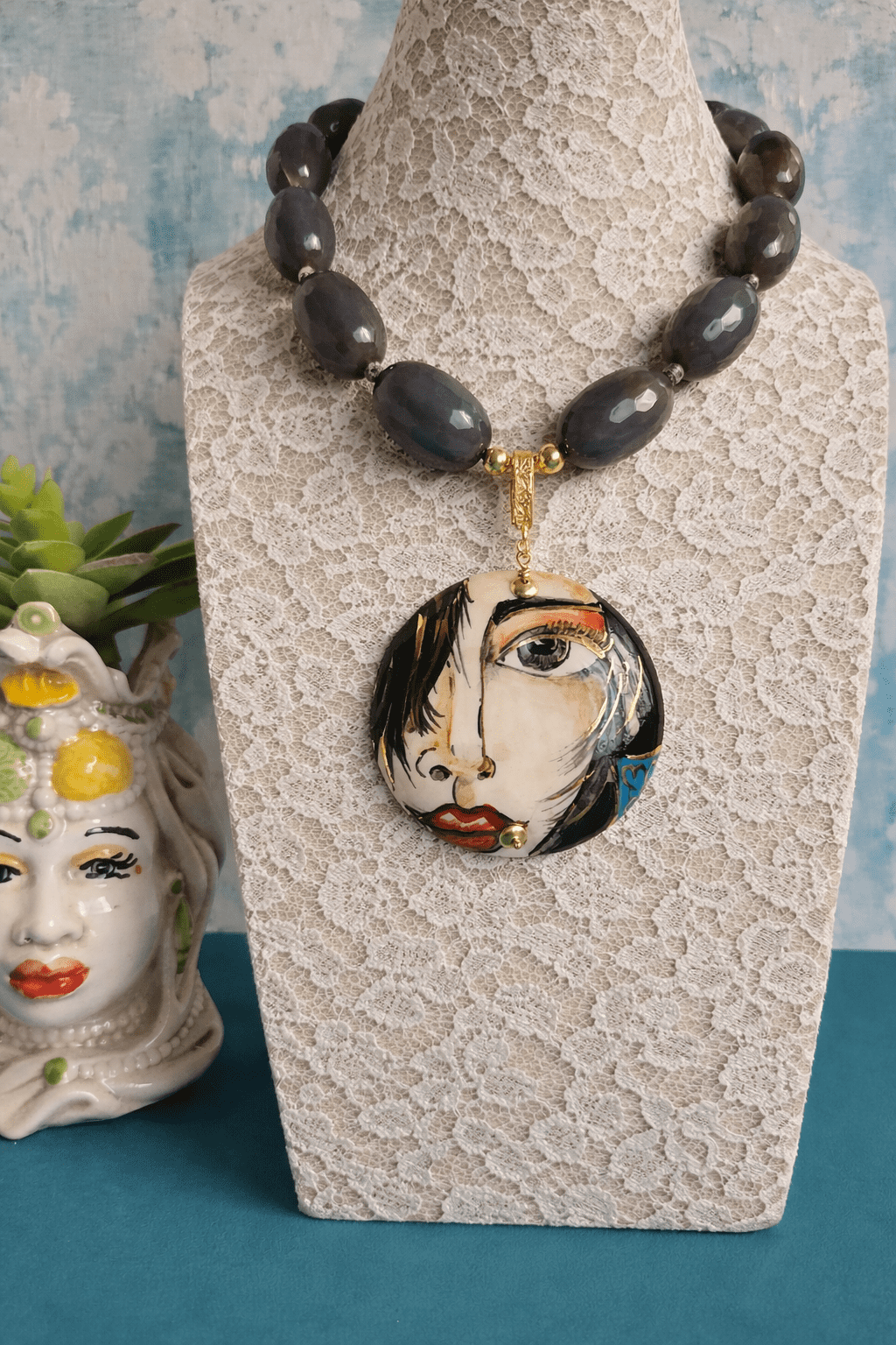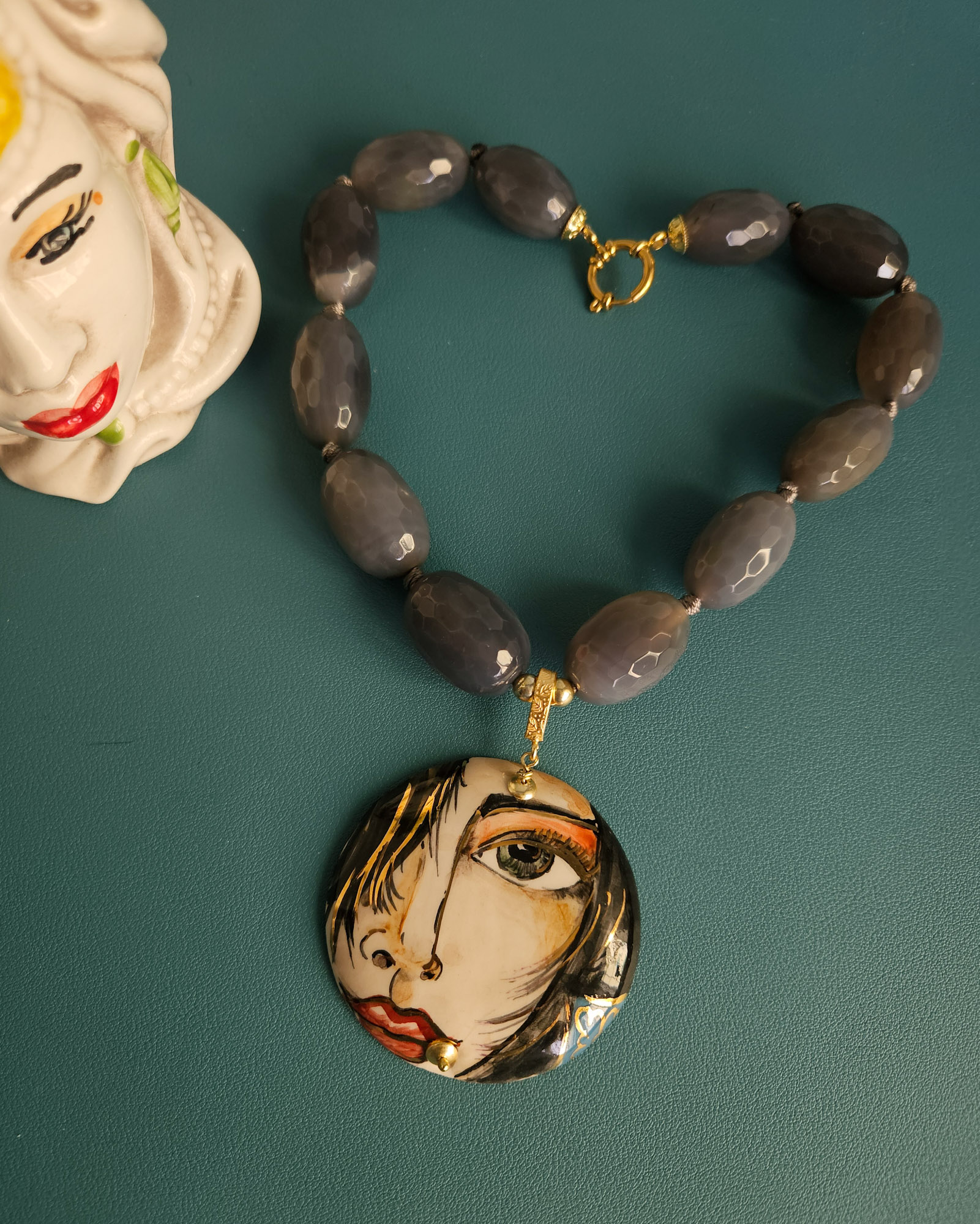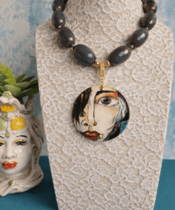 Al centro un importante ciondolo in ceramica di Caltagirone, dipinto a mano. Il medaglione raffigura un volto femminile dallo stile artistico e moderno, con linee fluide e dettagli espressivi: lo sguardo intenso, i tratti sinuosi e le sfumature calde rendono la collana scenografica e sofisticata.