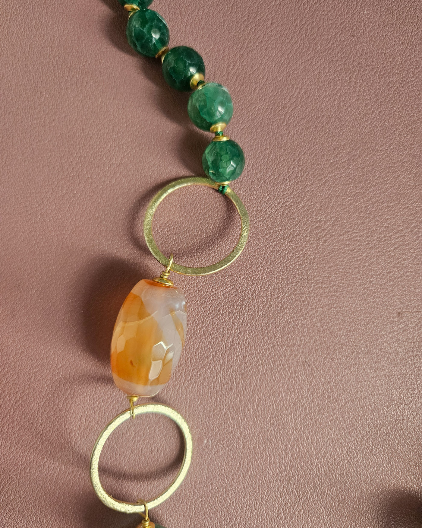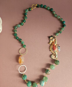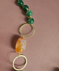 Realizzata con pregiate sfere di agata fuoco verde, note per le loro venature ipnotiche e la capacità di evocare la forza della natura, questa collana è un vero e proprio inno alla bellezza.