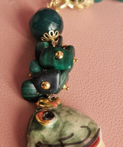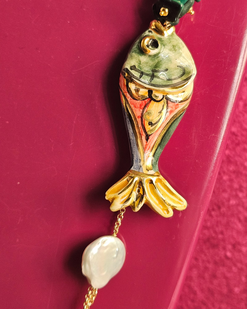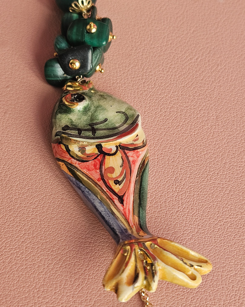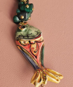 Collana Siciliana con Agata Verde e Pesce in Ceramica di Caltagirone