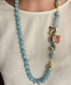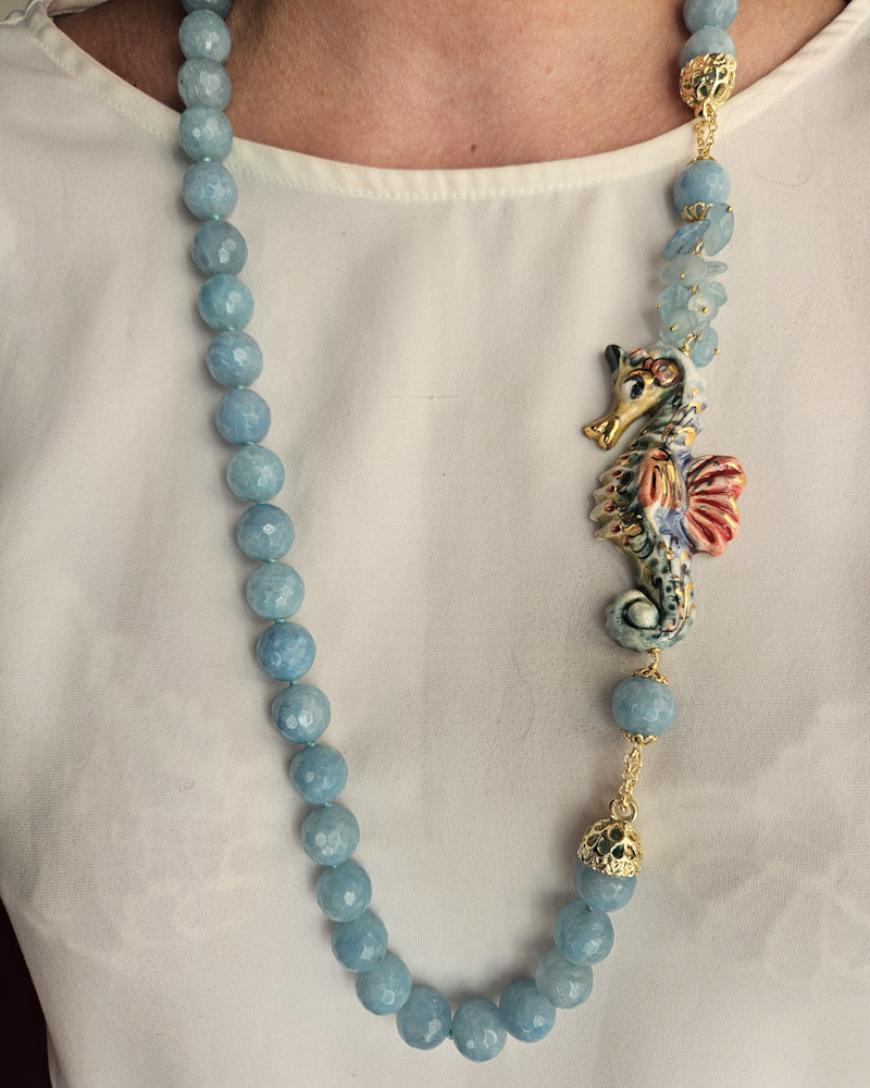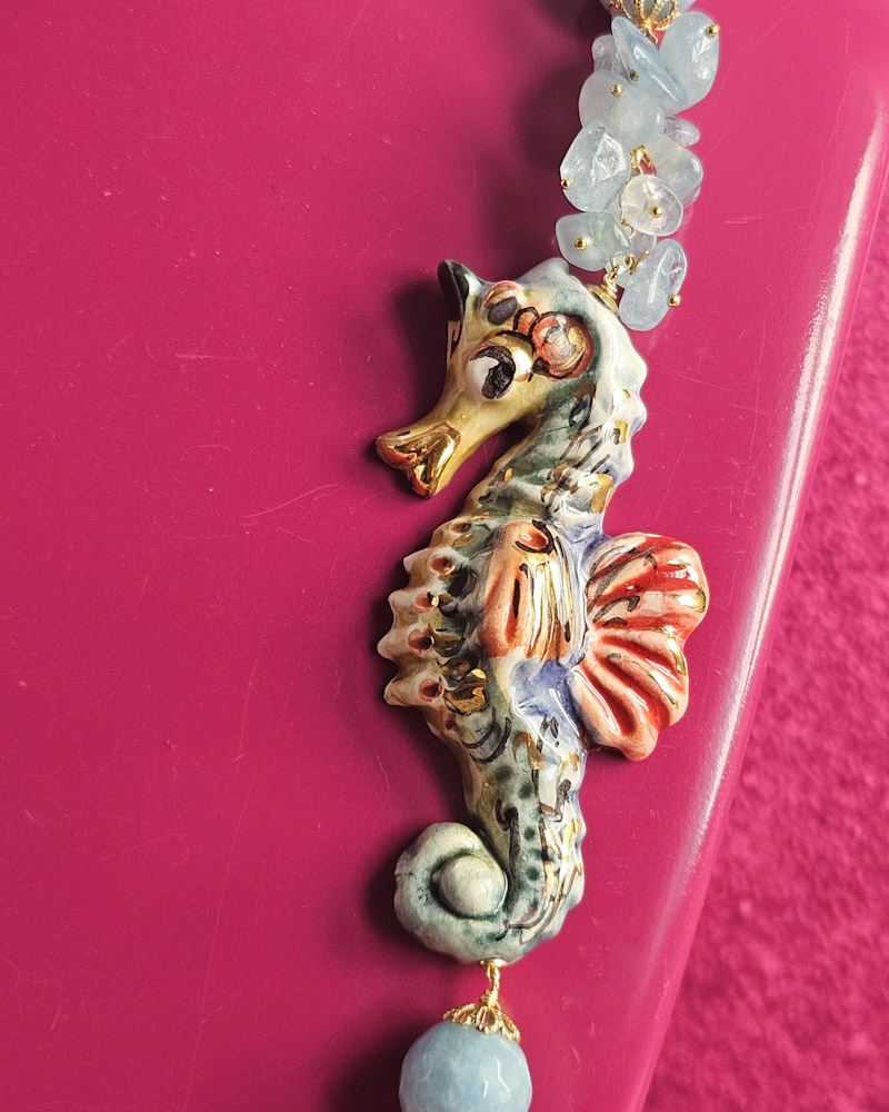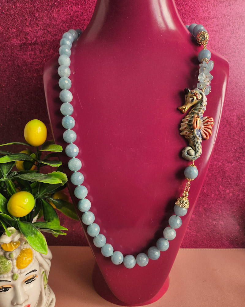 Splendida collana in Angelite con cavalluccio in ceramica di Caltagirone dipinta a mano.