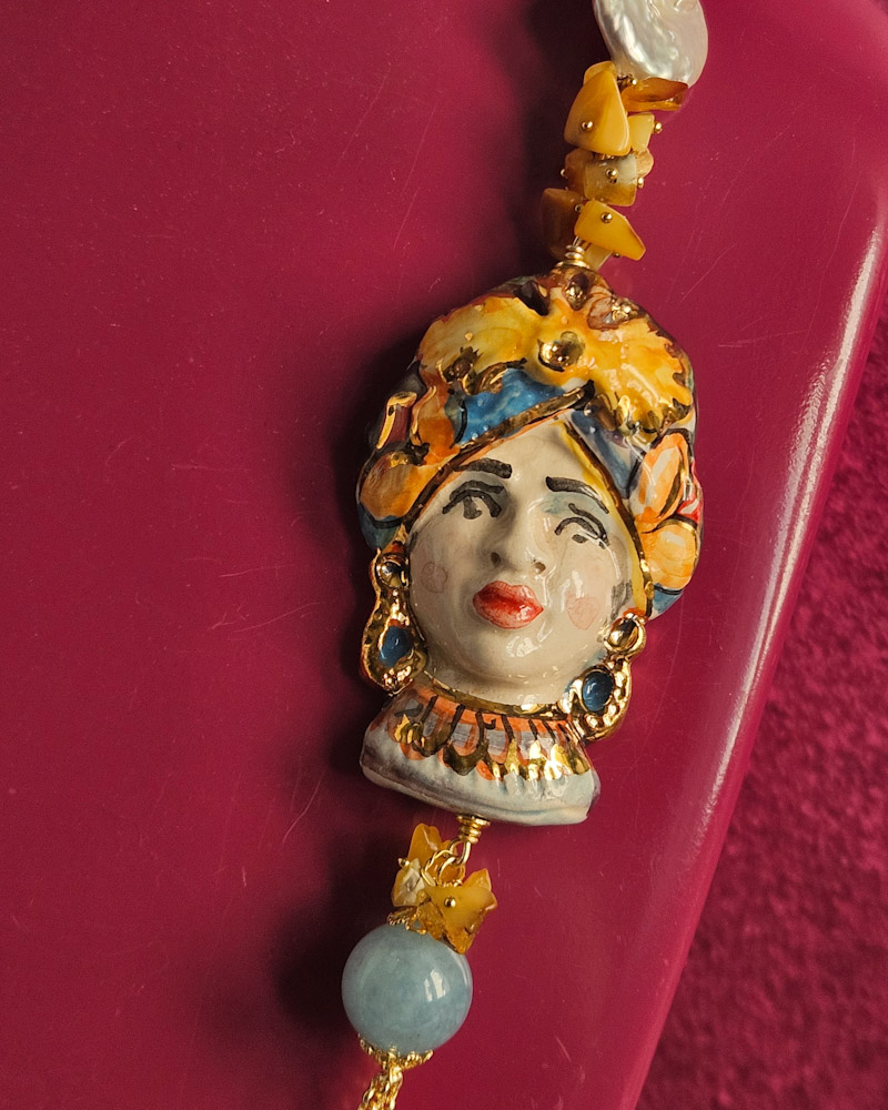 Collana Siciliana con Angelite e Testa di Donna in Ceramica di Caltagirone