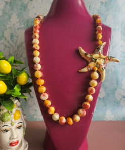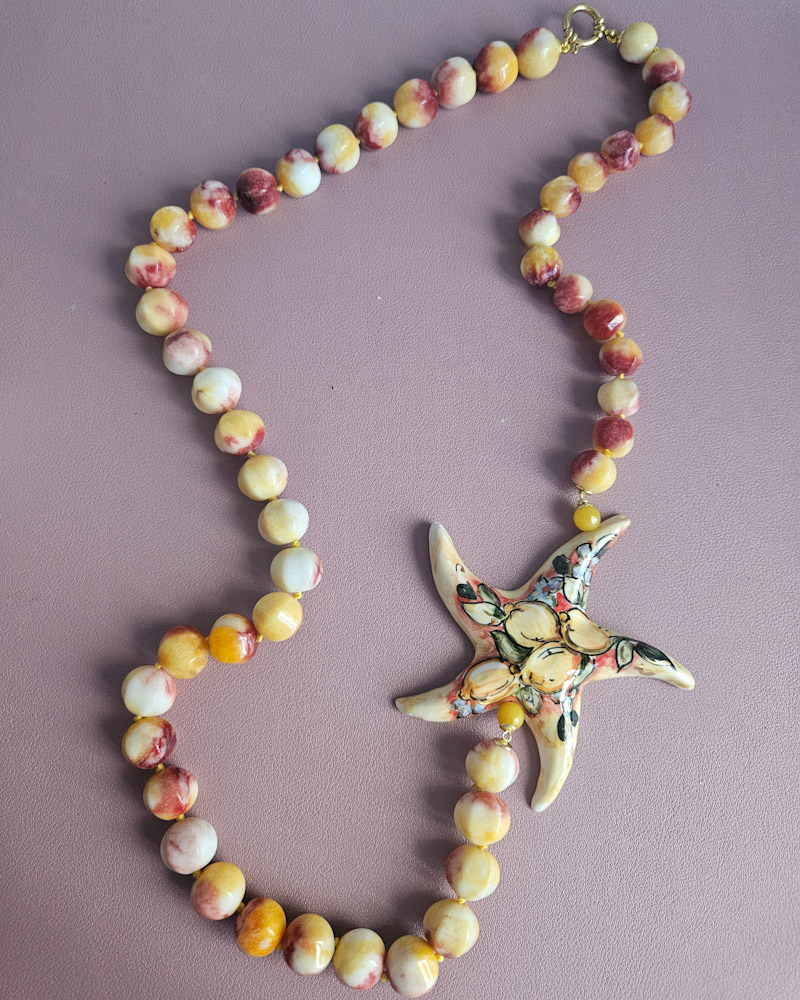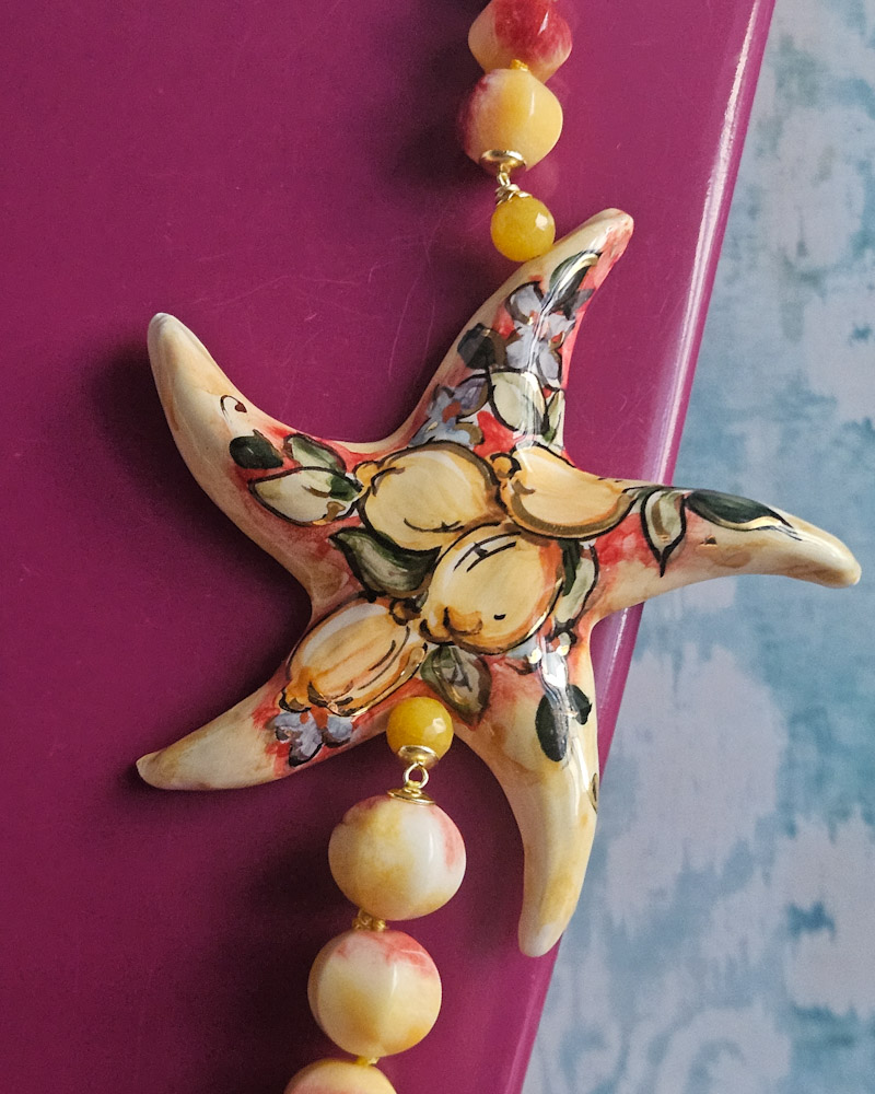 Il vero protagonista del gioiello è la grande stella marina, realizzata in ceramica di Caltagirone, dipinta a mano con motivi dai colori vivaci che risaltano magnificamente sul fondo neutro della ceramica smaltata. La stella dona un tocco mediterraneo e artigianale alla collana, evocando l’estate, il mare e gli elementi tipici siciliani.