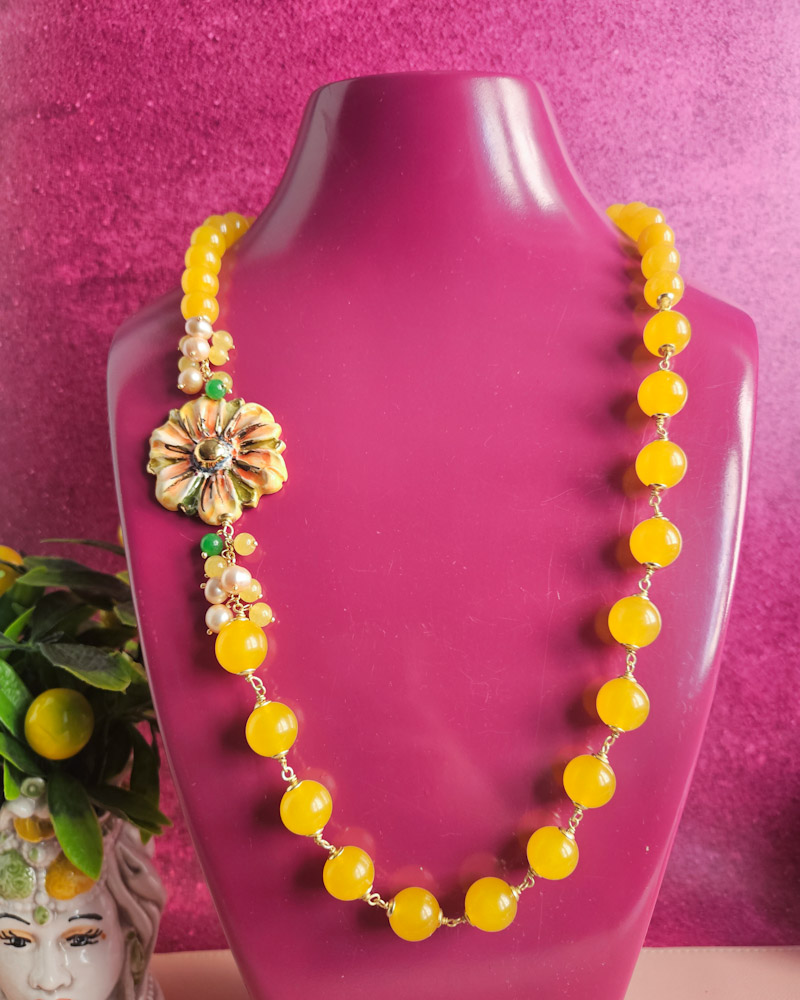 Uno stile tutto siciliano per questa meravigliosa collana realizzata con giada gialla e fiore in ceramica di Caltagirone, indiscusso simbolo di sicilianità.