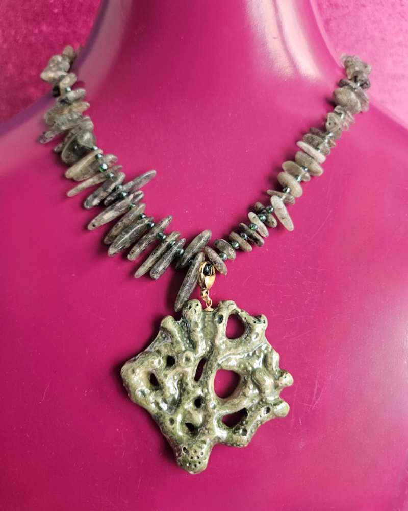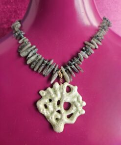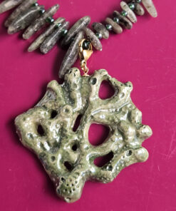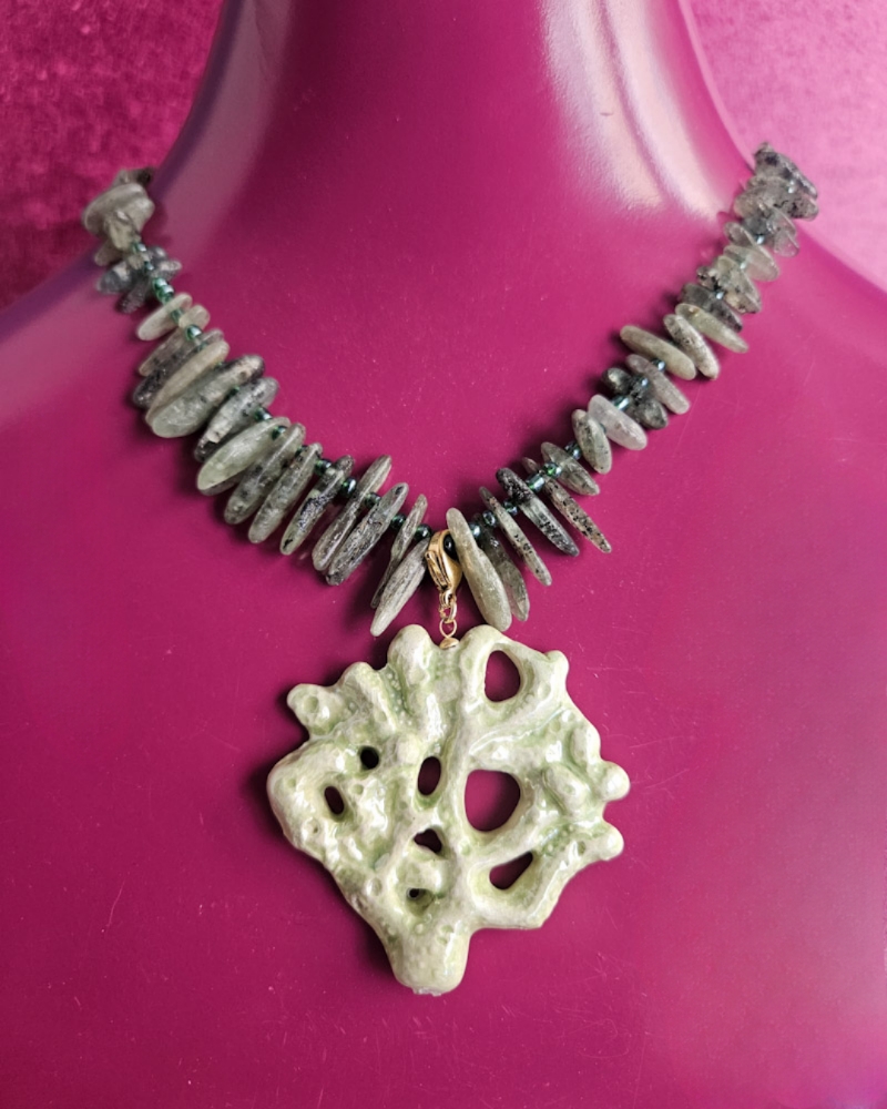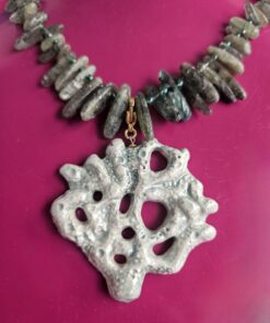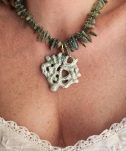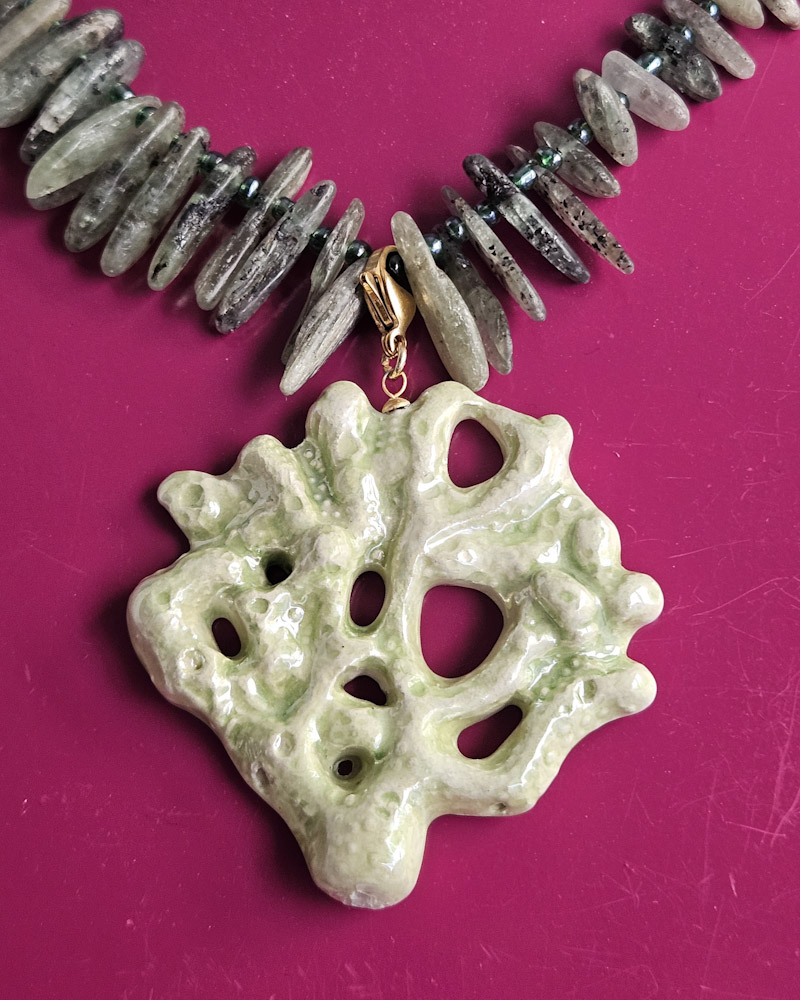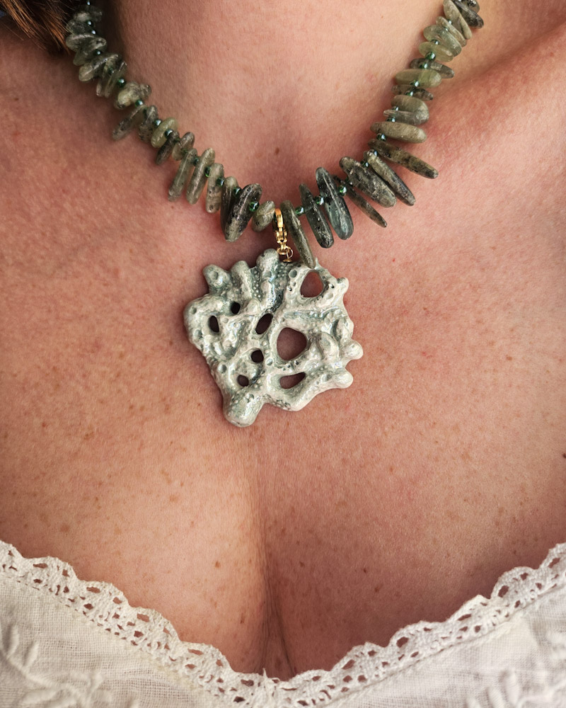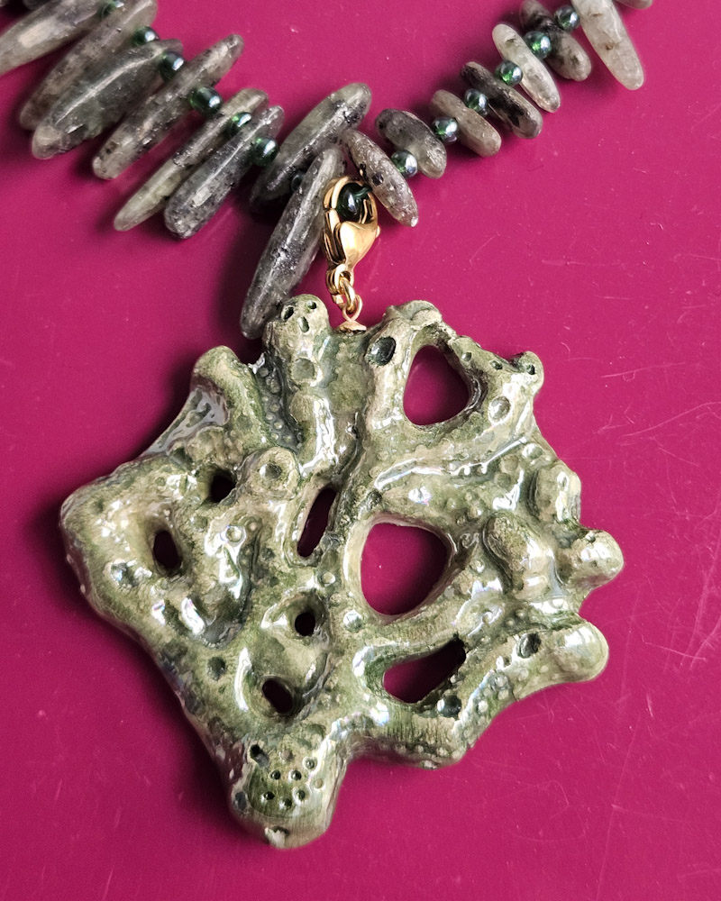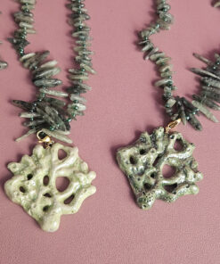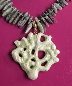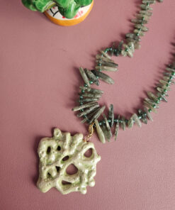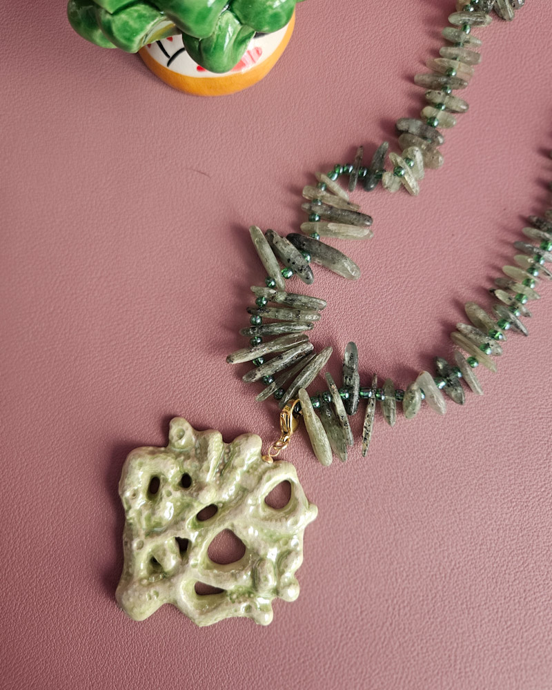 L’unione tra il ciondolo in ceramica di Caltagirone e le chips di granto crea un equilibrio cromatico perfetto: il caratteristico verde dell’apatite con le sue sfumature cangianti, esaltano la vivacità del colore della ceramica, dando vita a un contrasto armonioso e ricercato