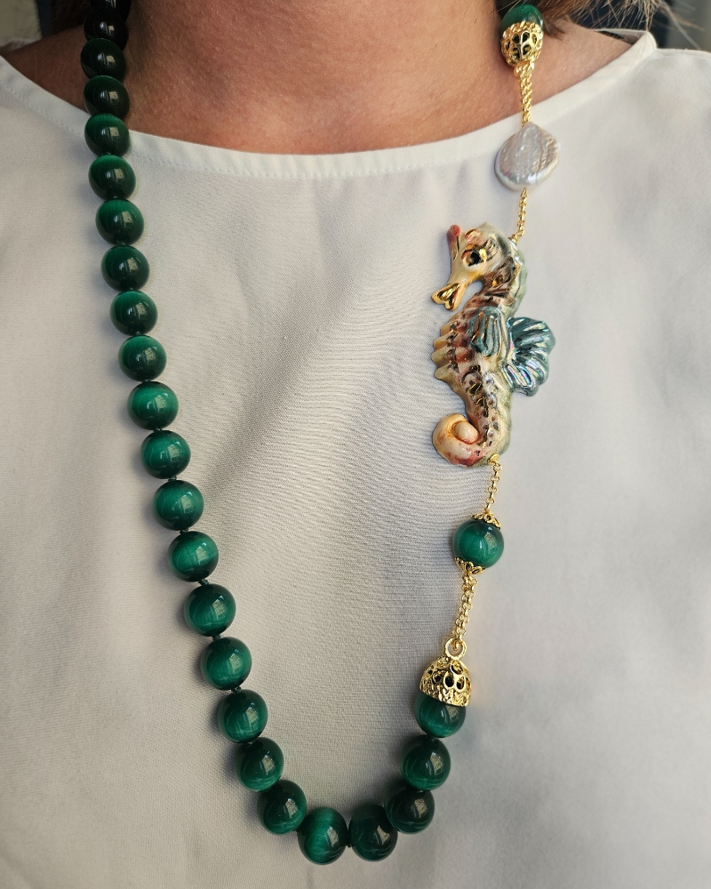 Splendida collana verde con cavalluccio in ceramica di Caltagirone dipinta a mano.