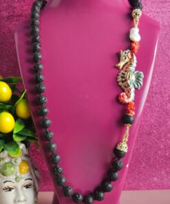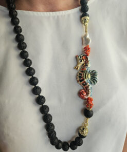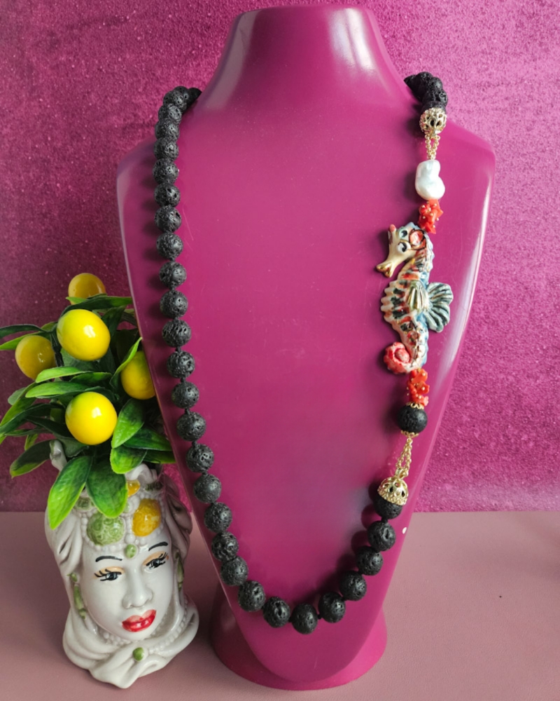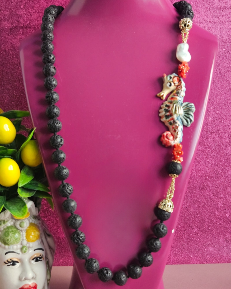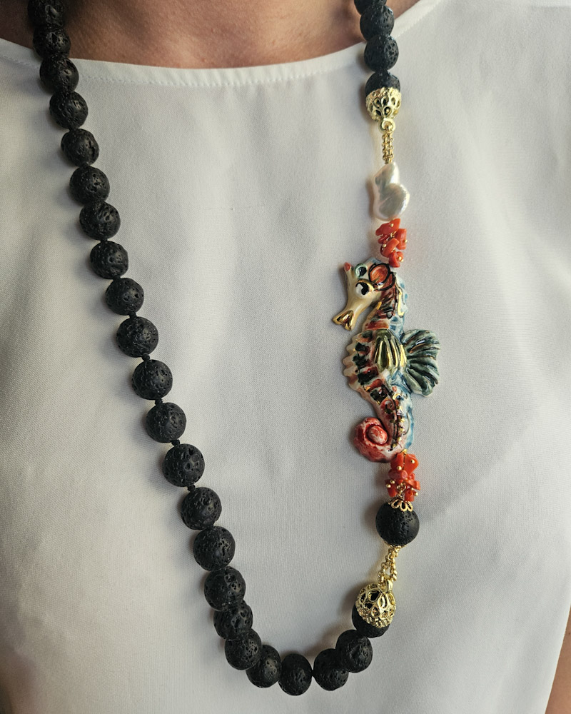 Splendida collana in Pietra lavica dell’Etna con cavalluccio in ceramica di Caltagirone dipinta a mano.