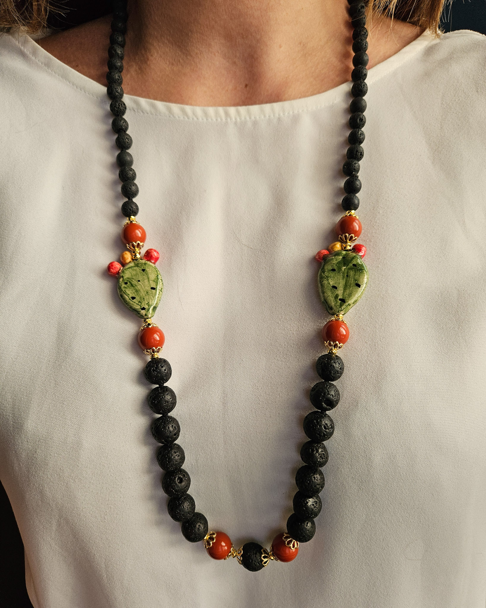 Collana Siciliana con Pietra Lavica e Fichi d’India in Ceramica di Caltagirone