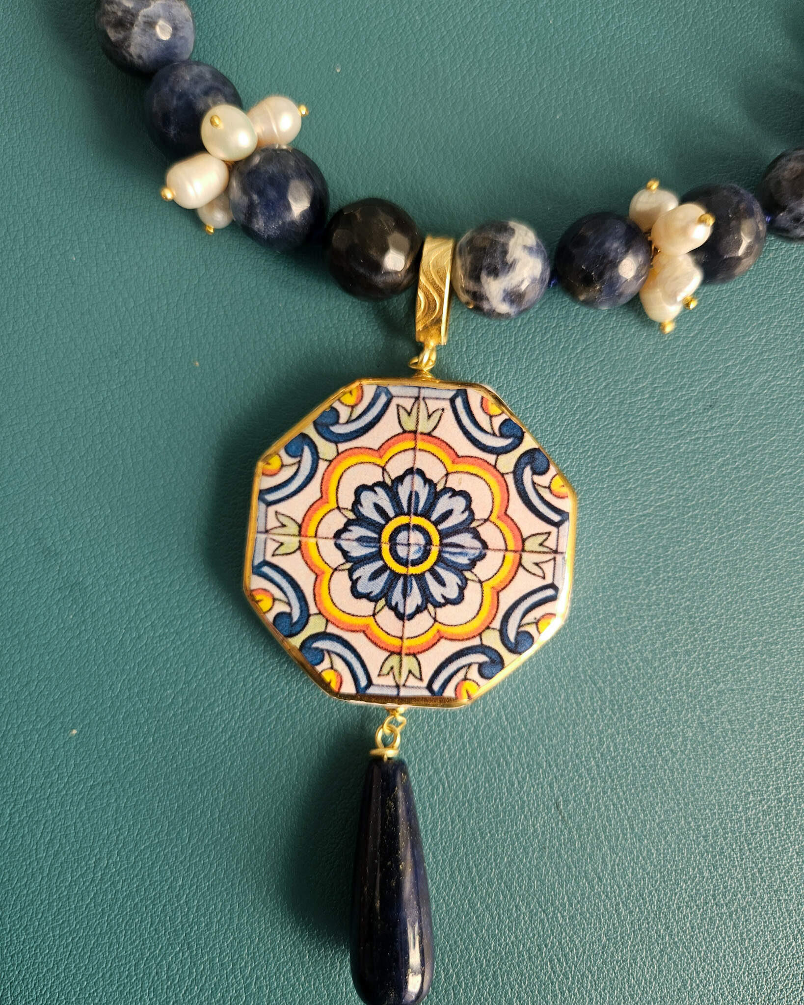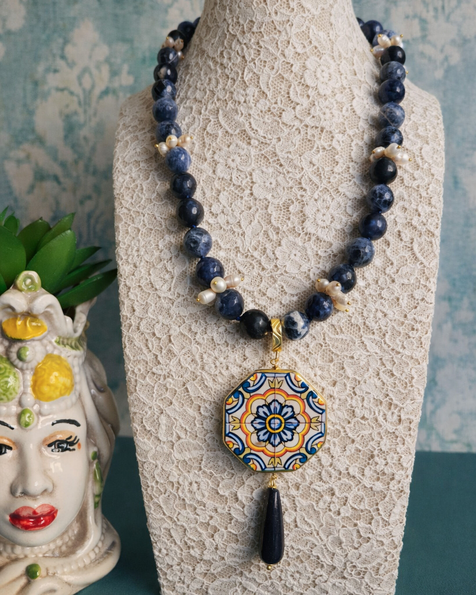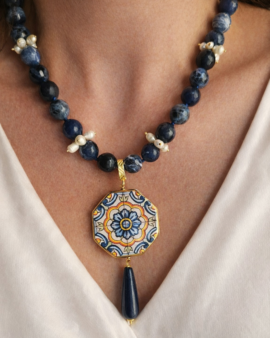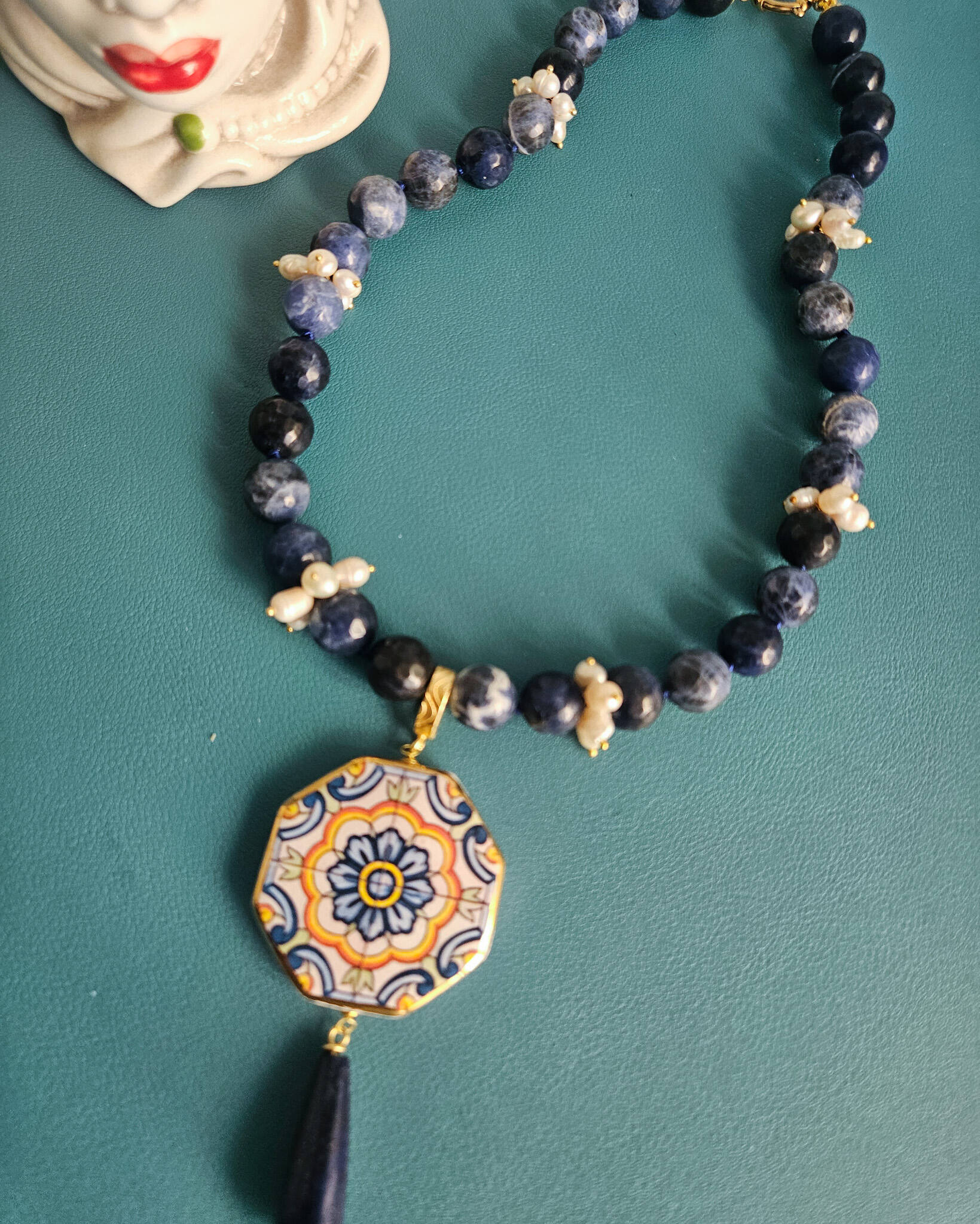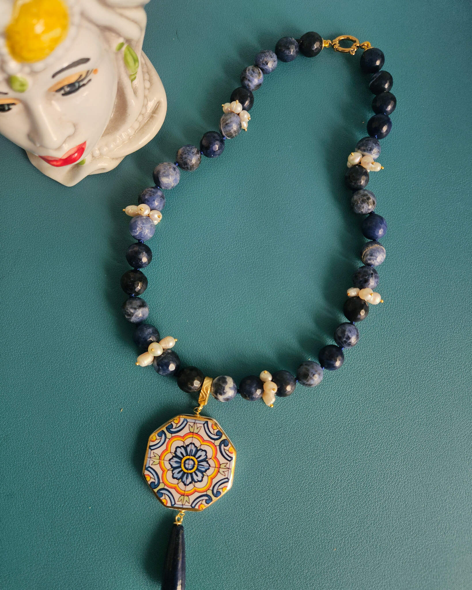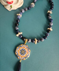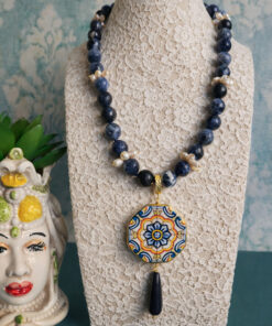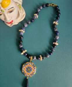Questa collana nasce dall’incontro tra tre elementi che amo profondamente lavorare: sodalite, perle e ceramica di Caltagirone.