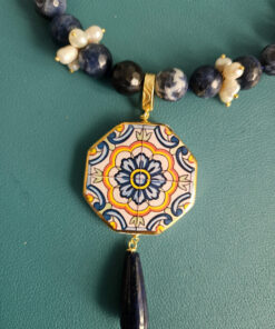 Collana Siciliana con Sodalite, Perle e Mattonella Arabesque in Ceramica di Caltagirone