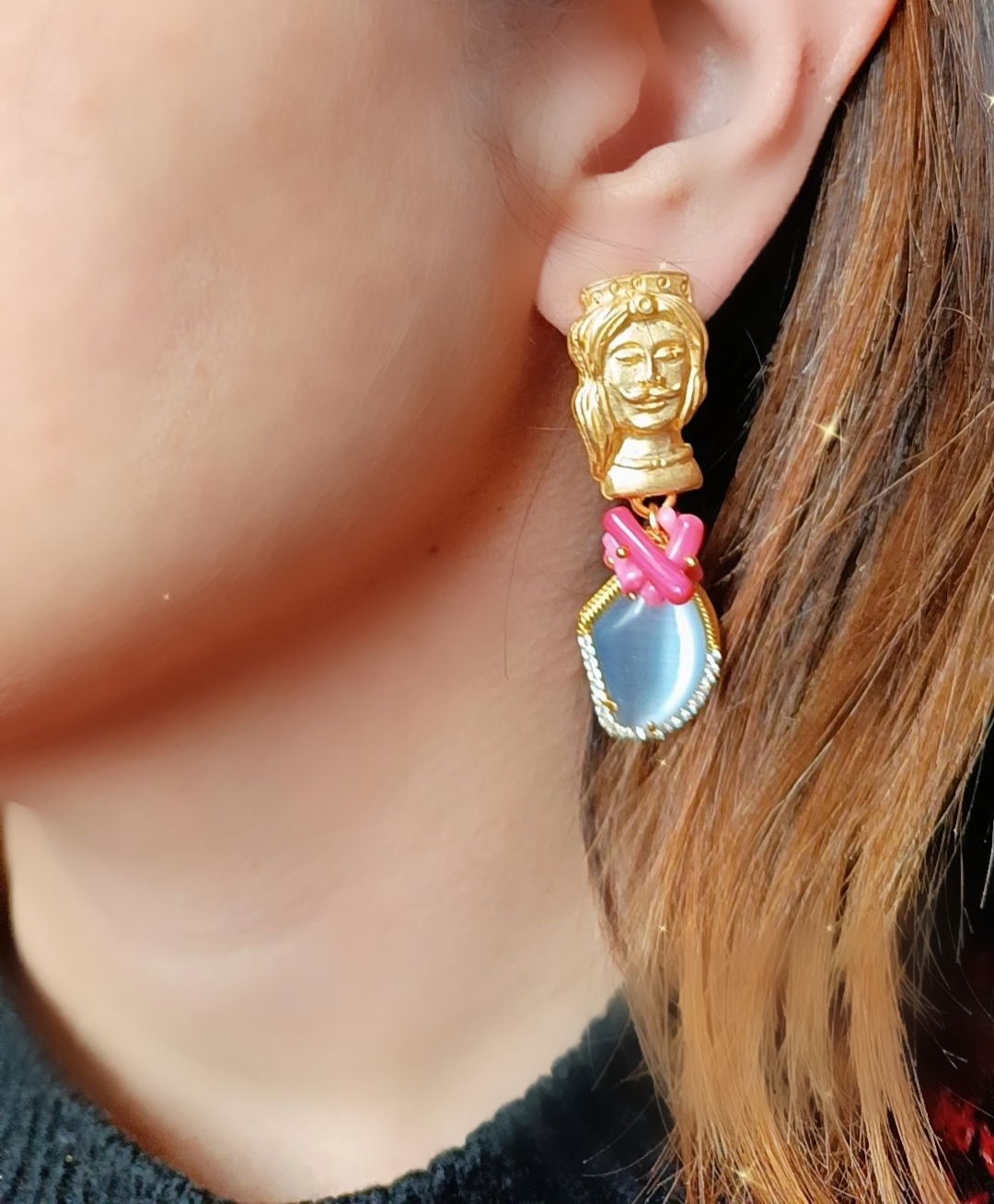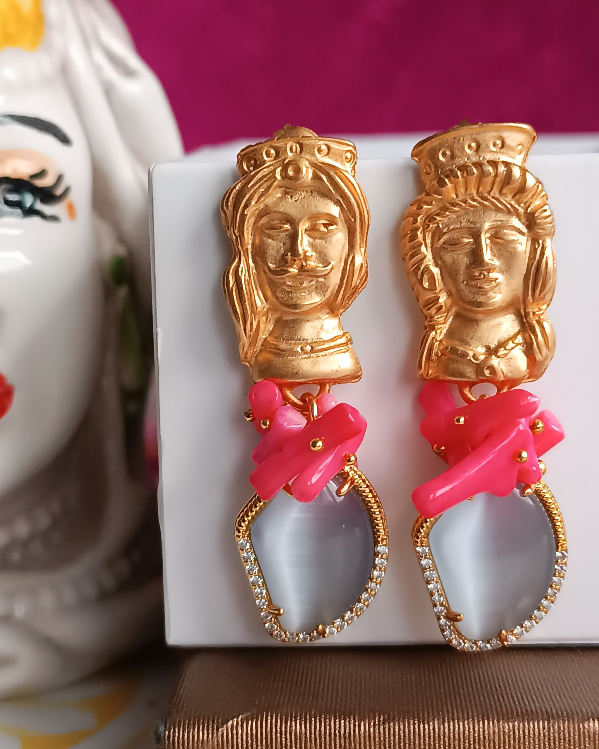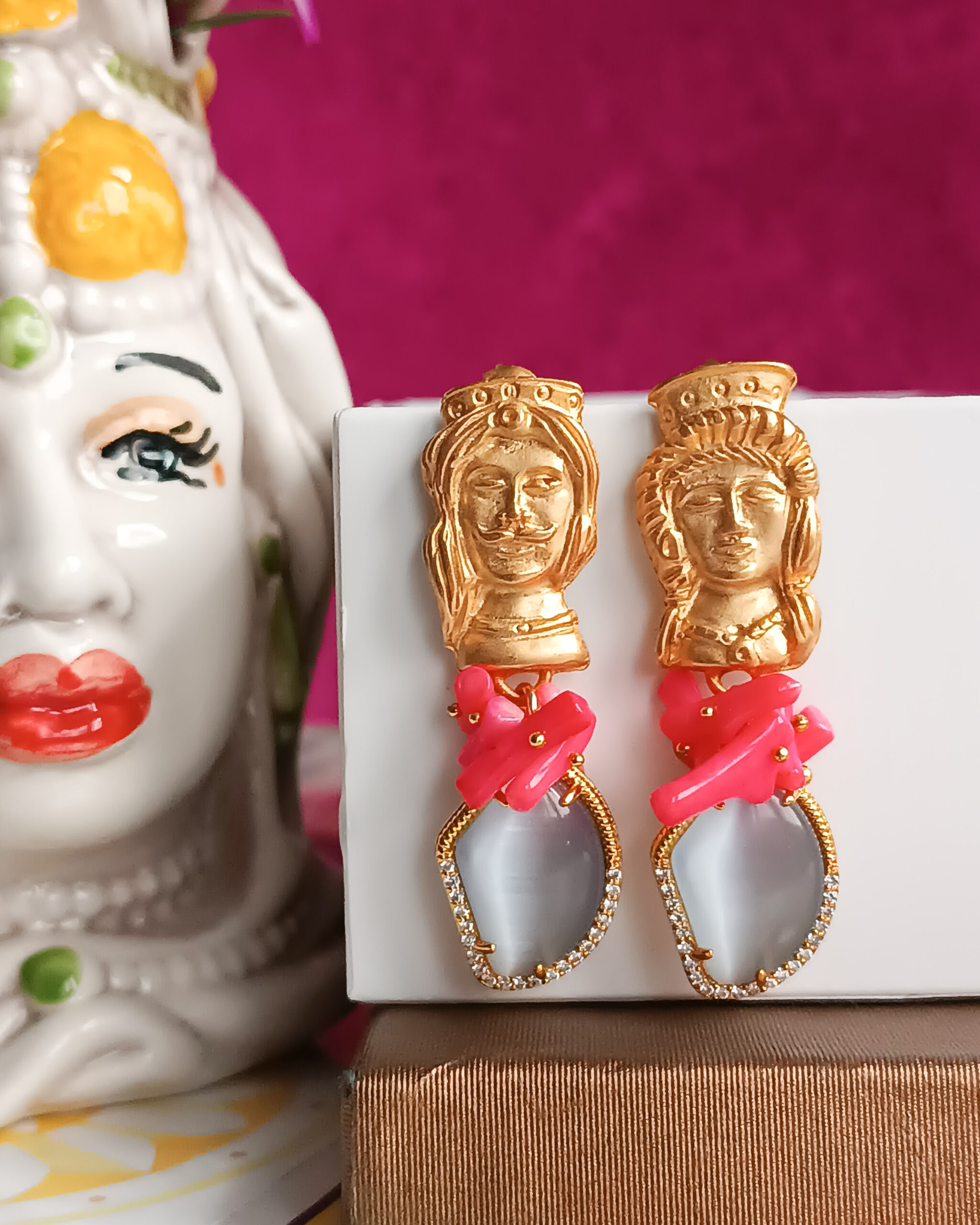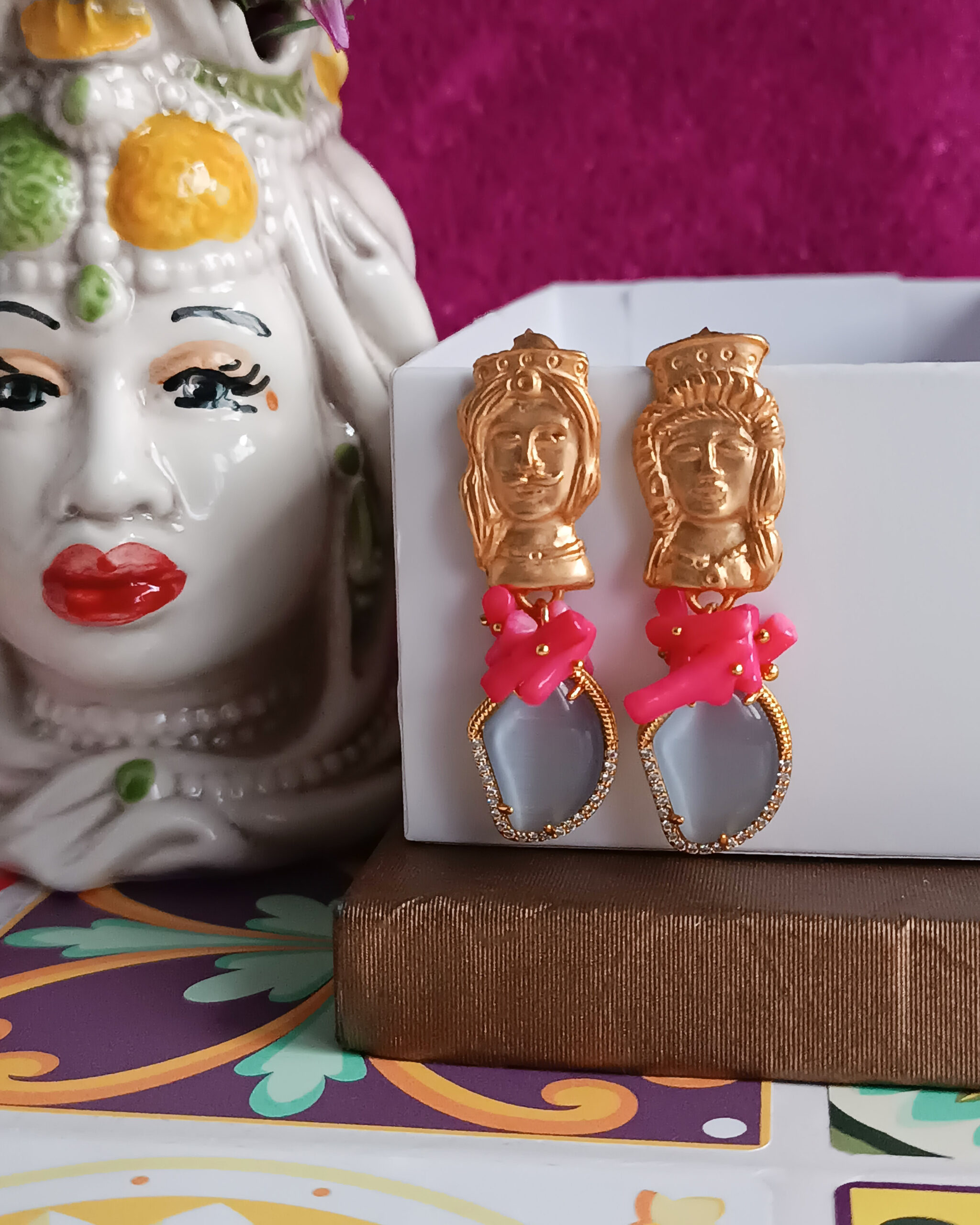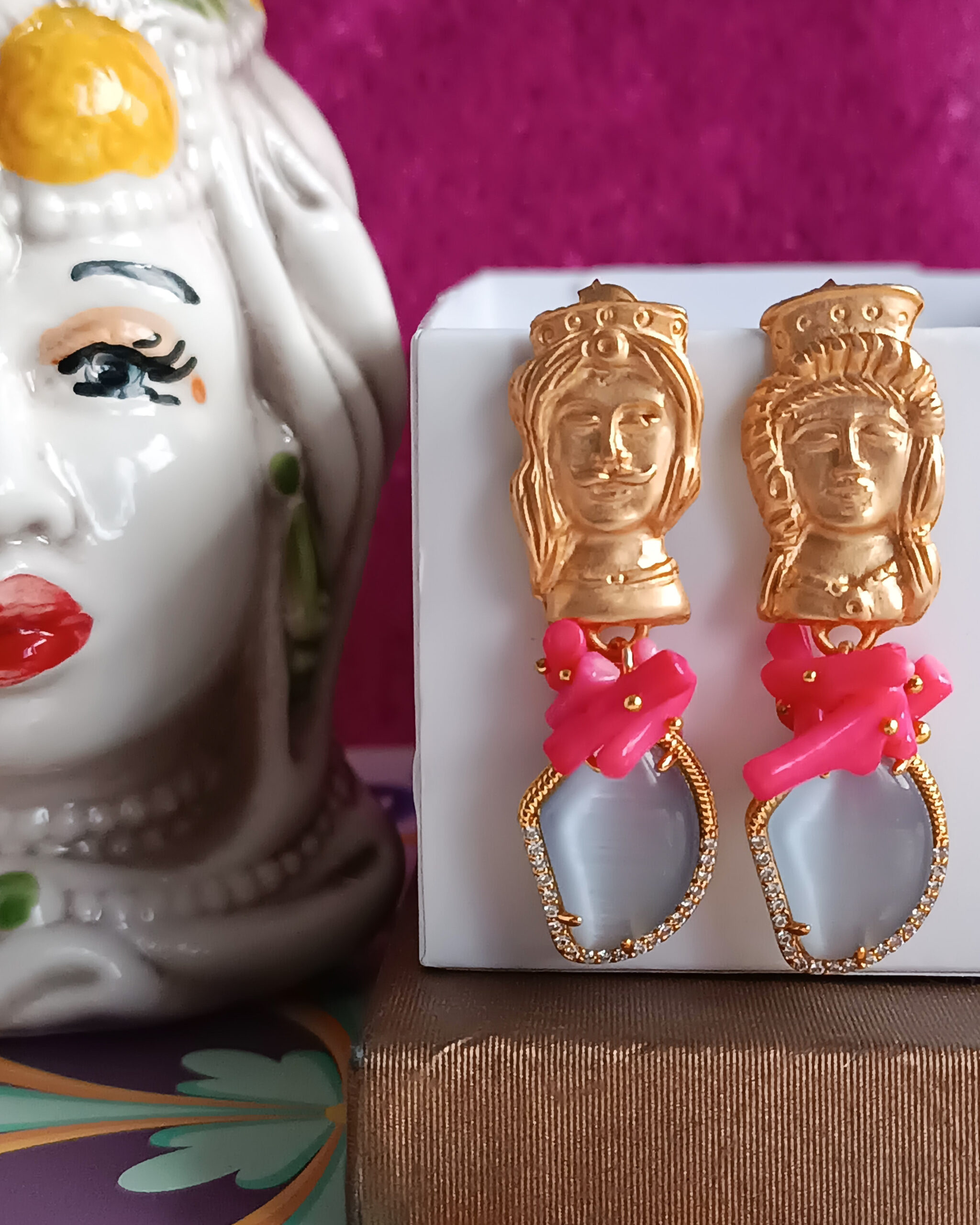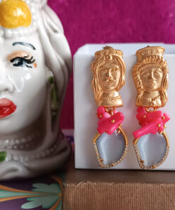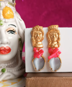 Orecchini molto chic realizzati con occhio di gatto e chips di corallo rosa Il tutto impreziosito da un tocco di sicilianità dato dai perni a forma di testa di moro.