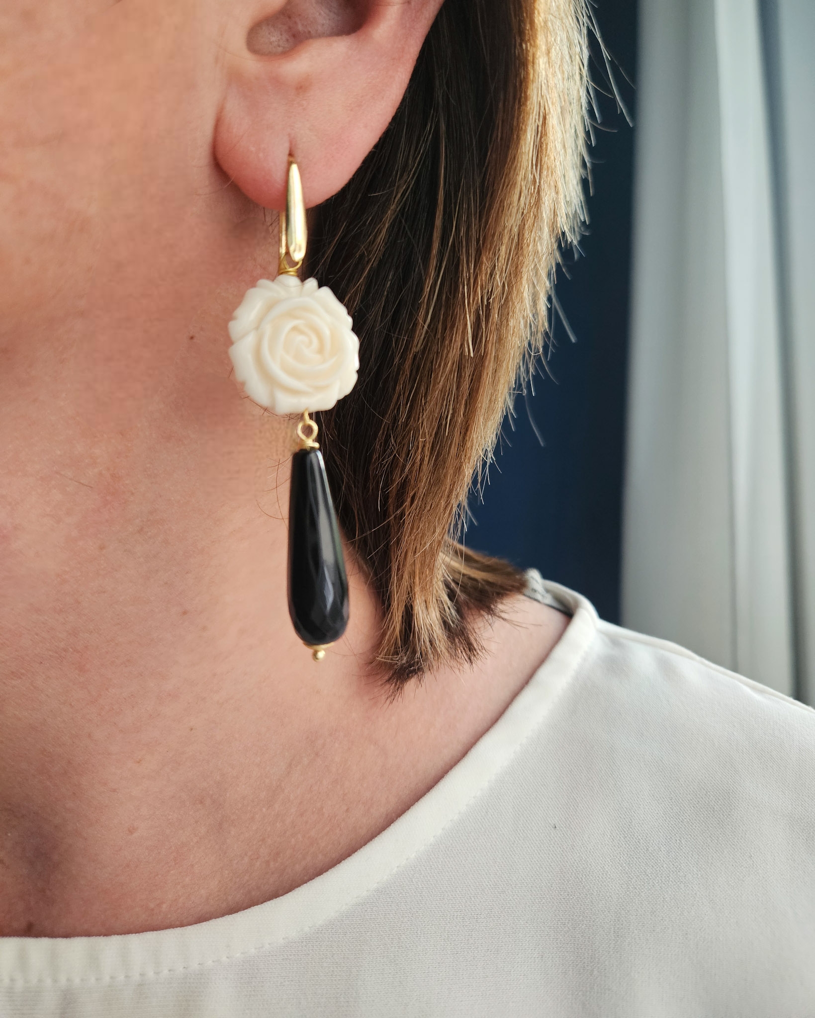 Orecchini a Goccia con Rose Bianche e Onice Nero