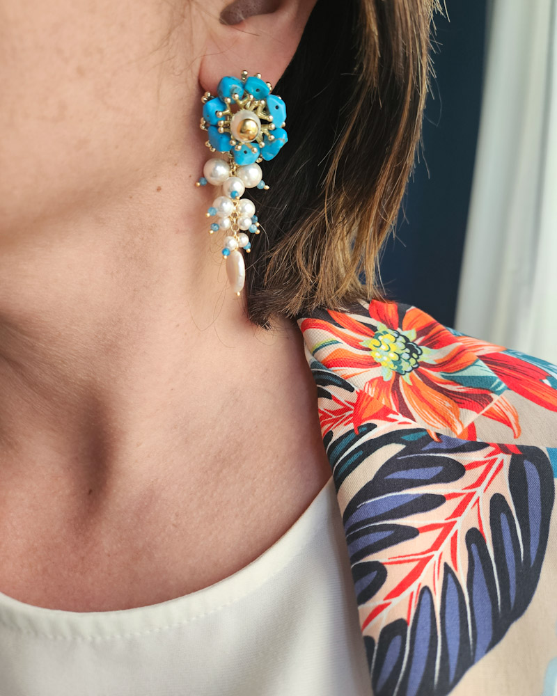 Vistoso fiore al lobo realizzato con chips di Turchese, attentamente incollate a mano, con imponente grappolo degradè di perle di fiume e perle barocche finali.