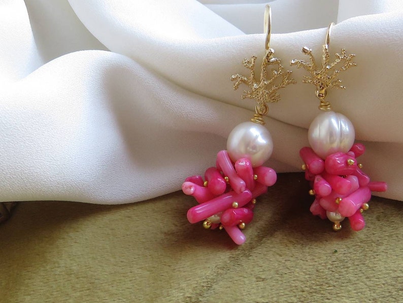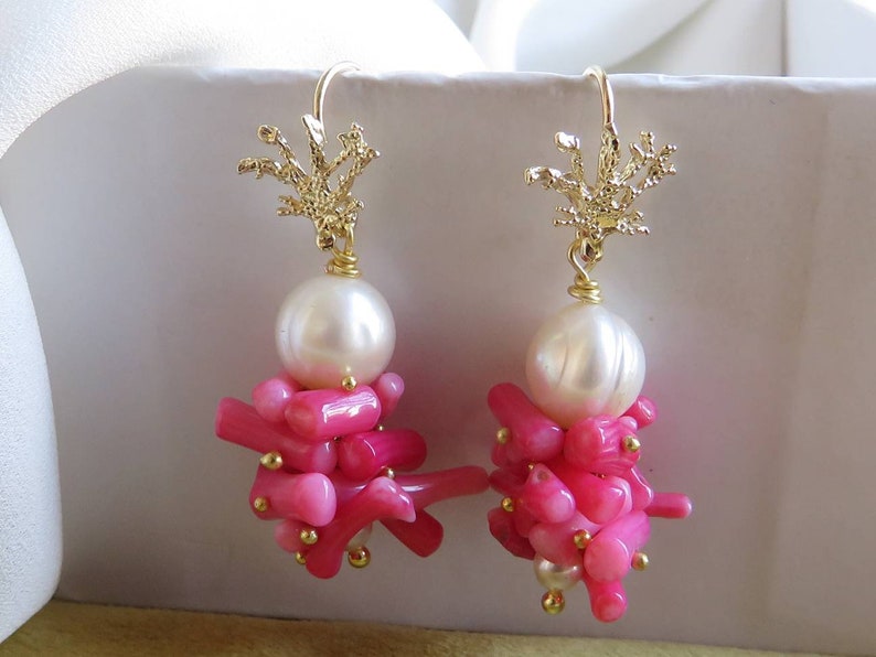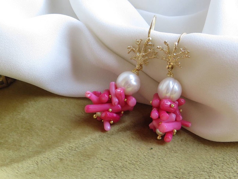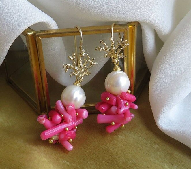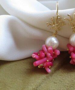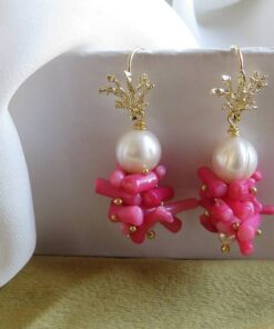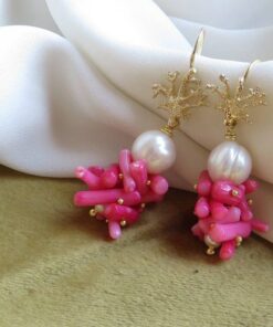Orecchini a grappolo realizzati con unica Perla Scaramazza e rametti di Corallo Bambù rosa montati e assemblati a mano.