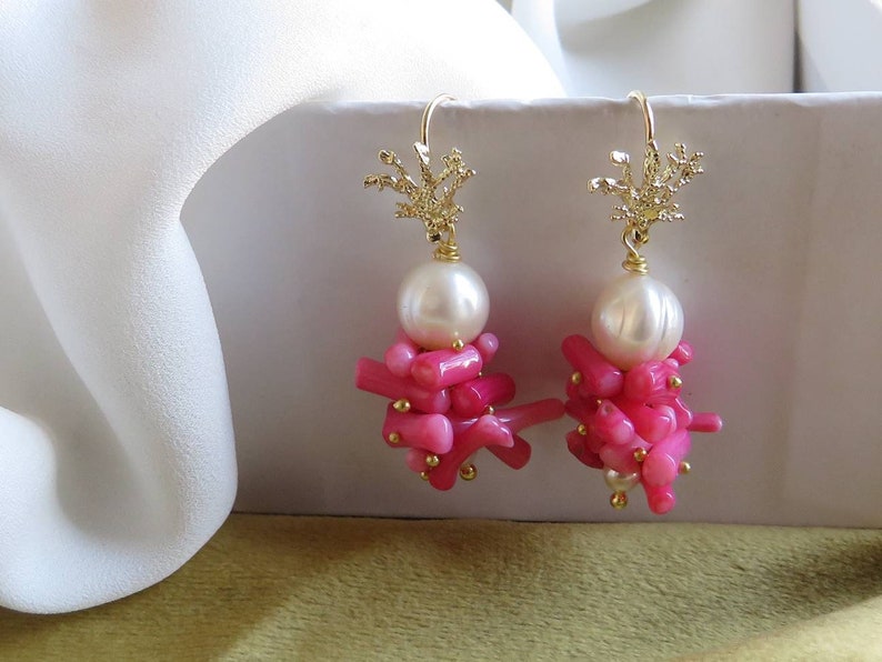 Orecchini a Grappolo con Perle e Corallo Bambù Rosa