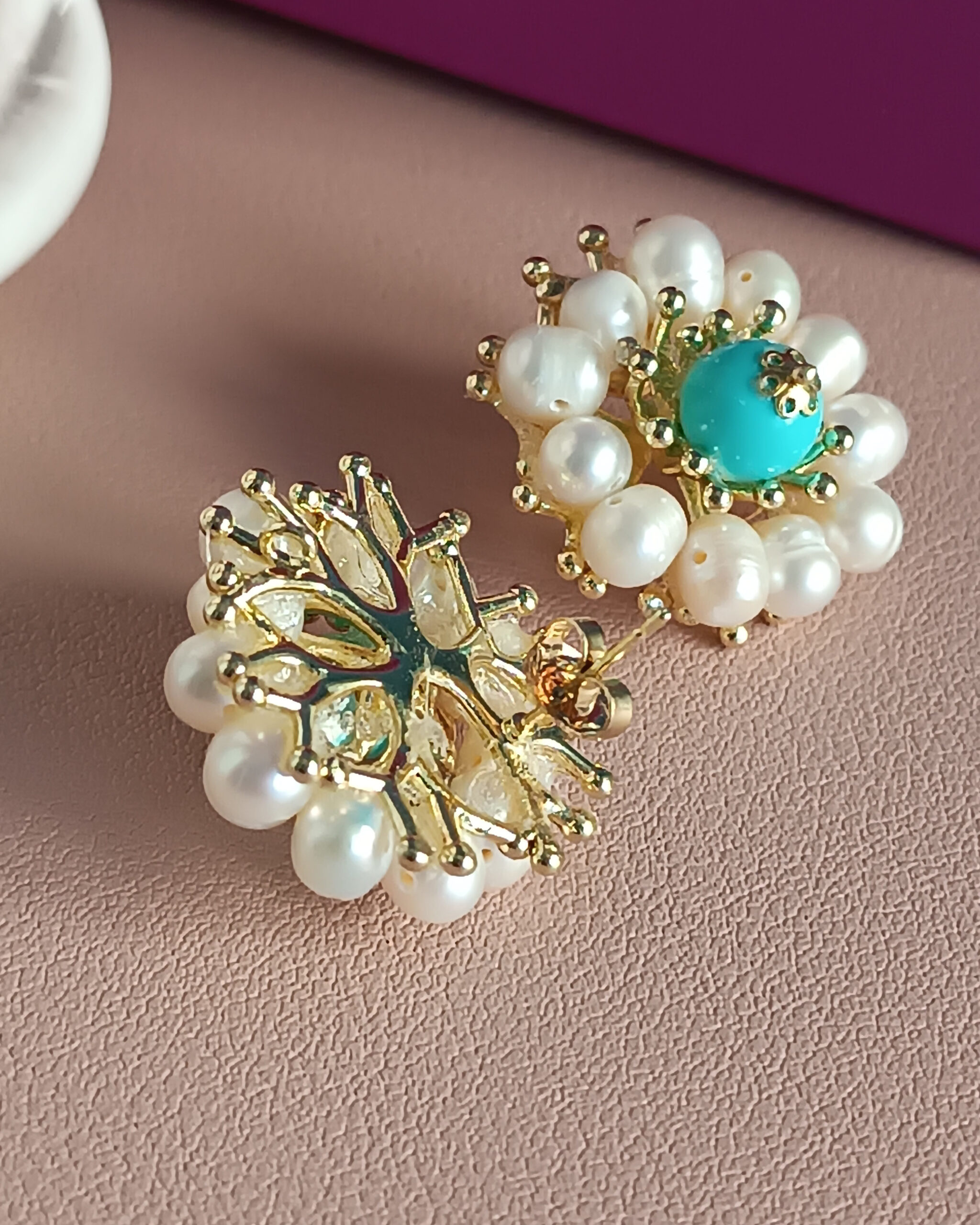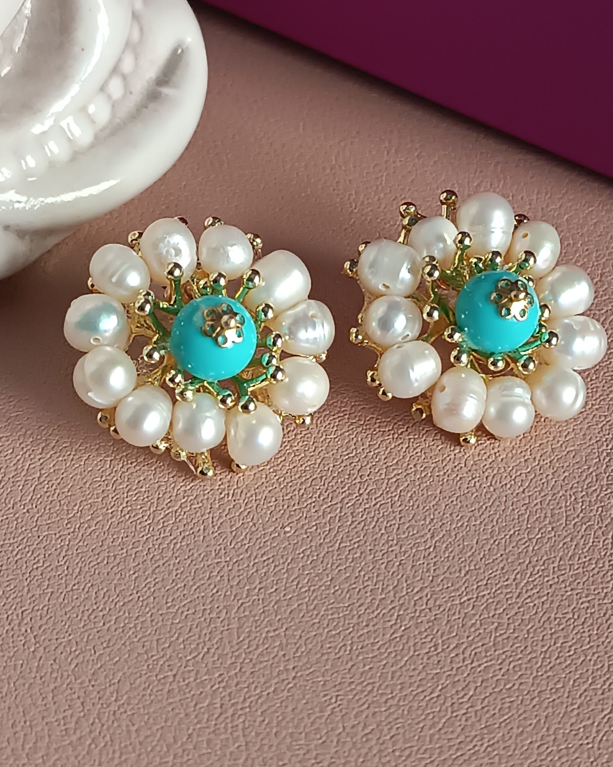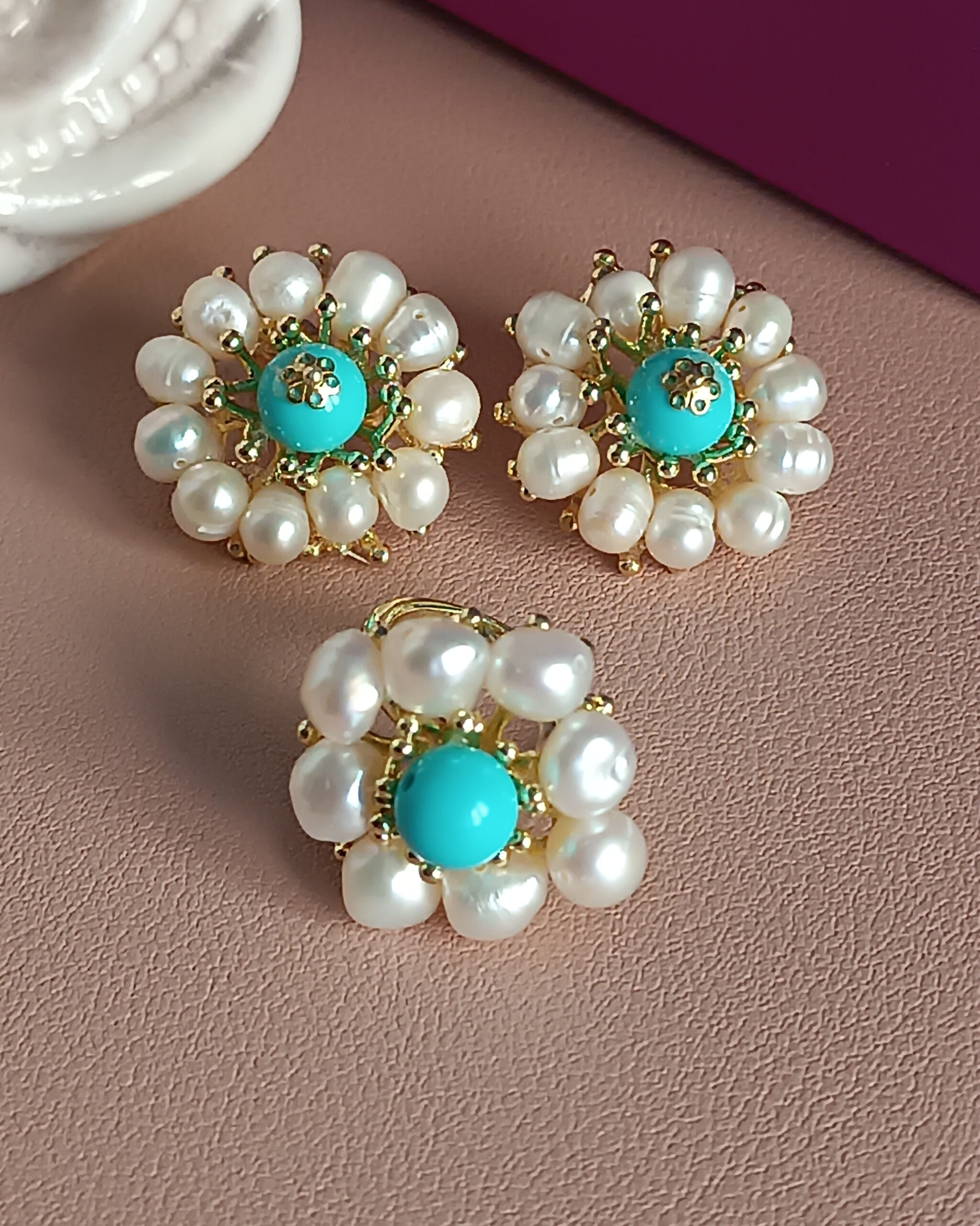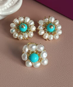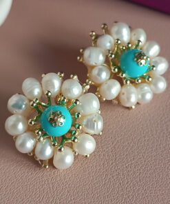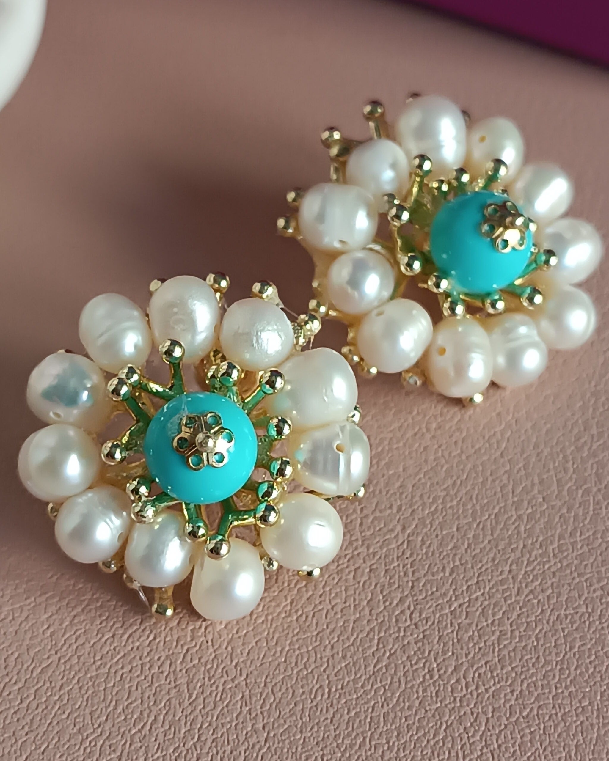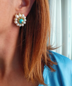 Vistoso fiore al lobo realizzato con Perle di fiume e pietra turchese attentamente incollate a mano. Il risultato è incantevole.