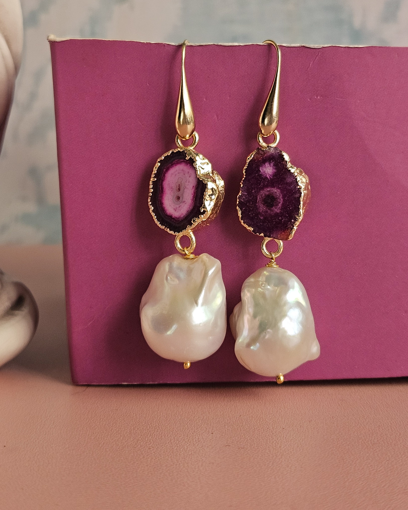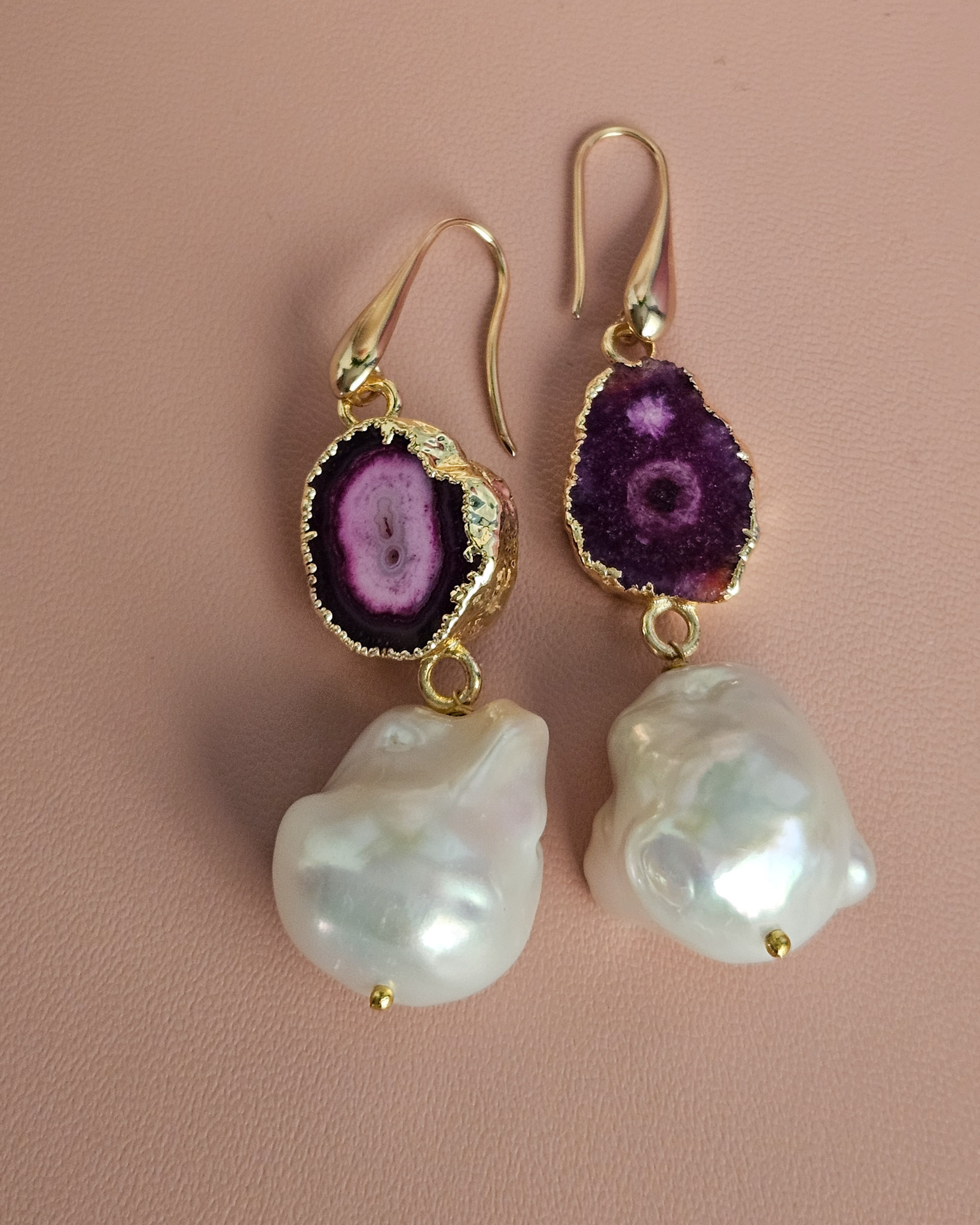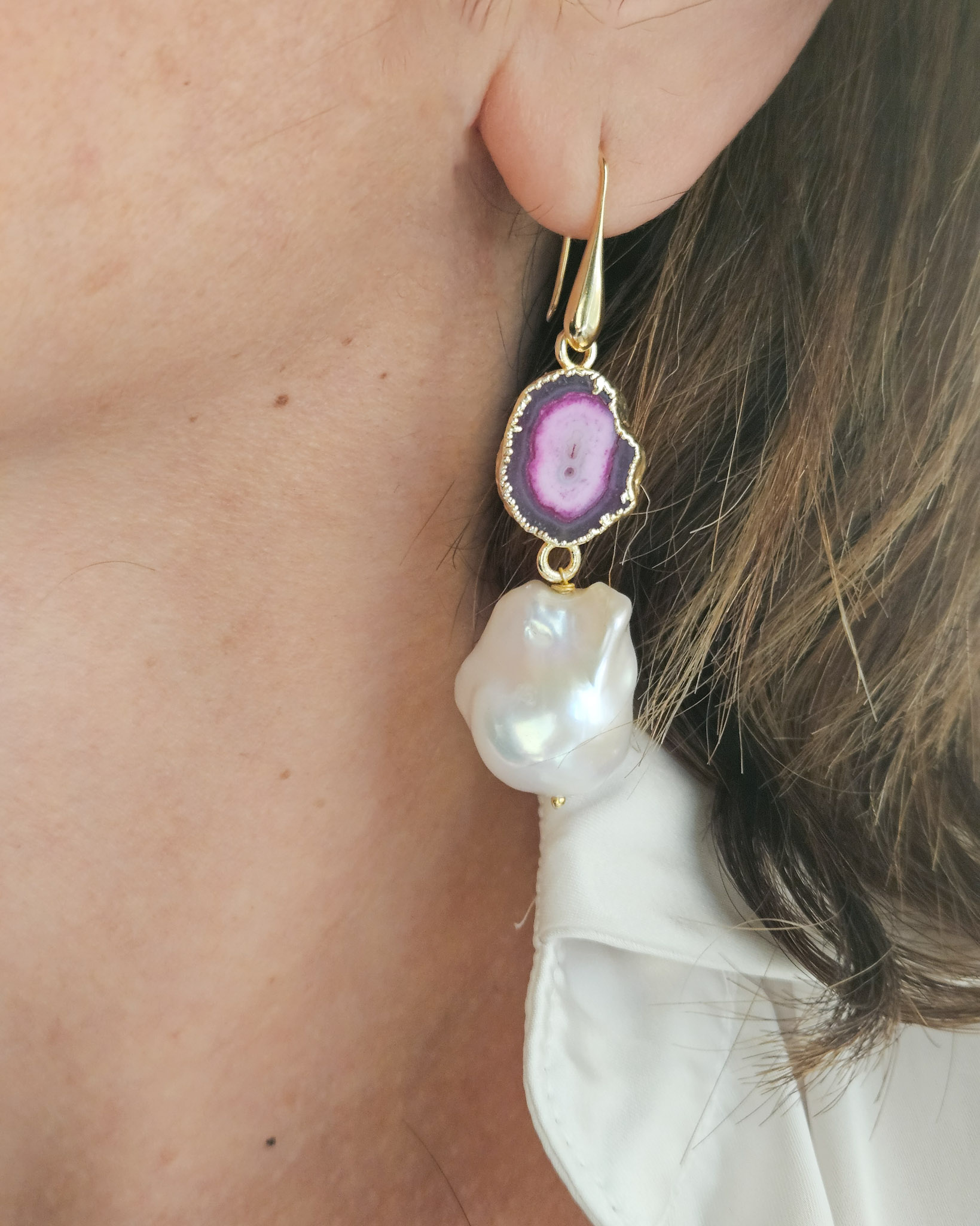 Ogni orecchino è un pezzo unico: la pietra di agata, con le sue affascinanti venature concentriche e il bordo dorato, si abbina perfettamente alla forma tipicamente irregolare della perla barocca, che riflette la luce con delicati riflessi madreperlati.