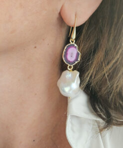 Orecchini Pendenti con Agata Naturale Fucsia e Perle Barocche
