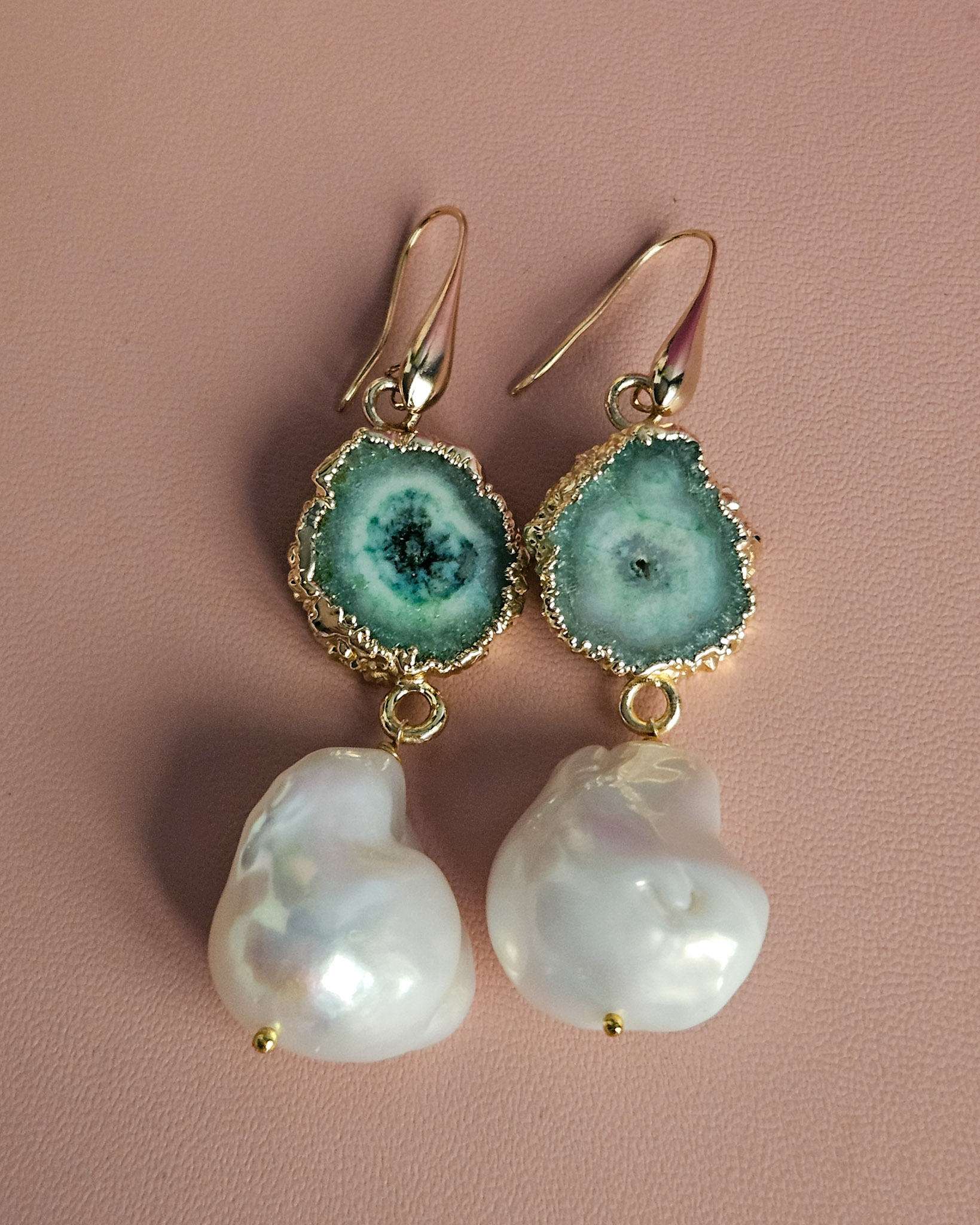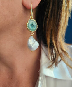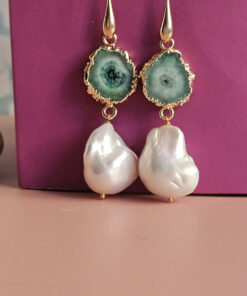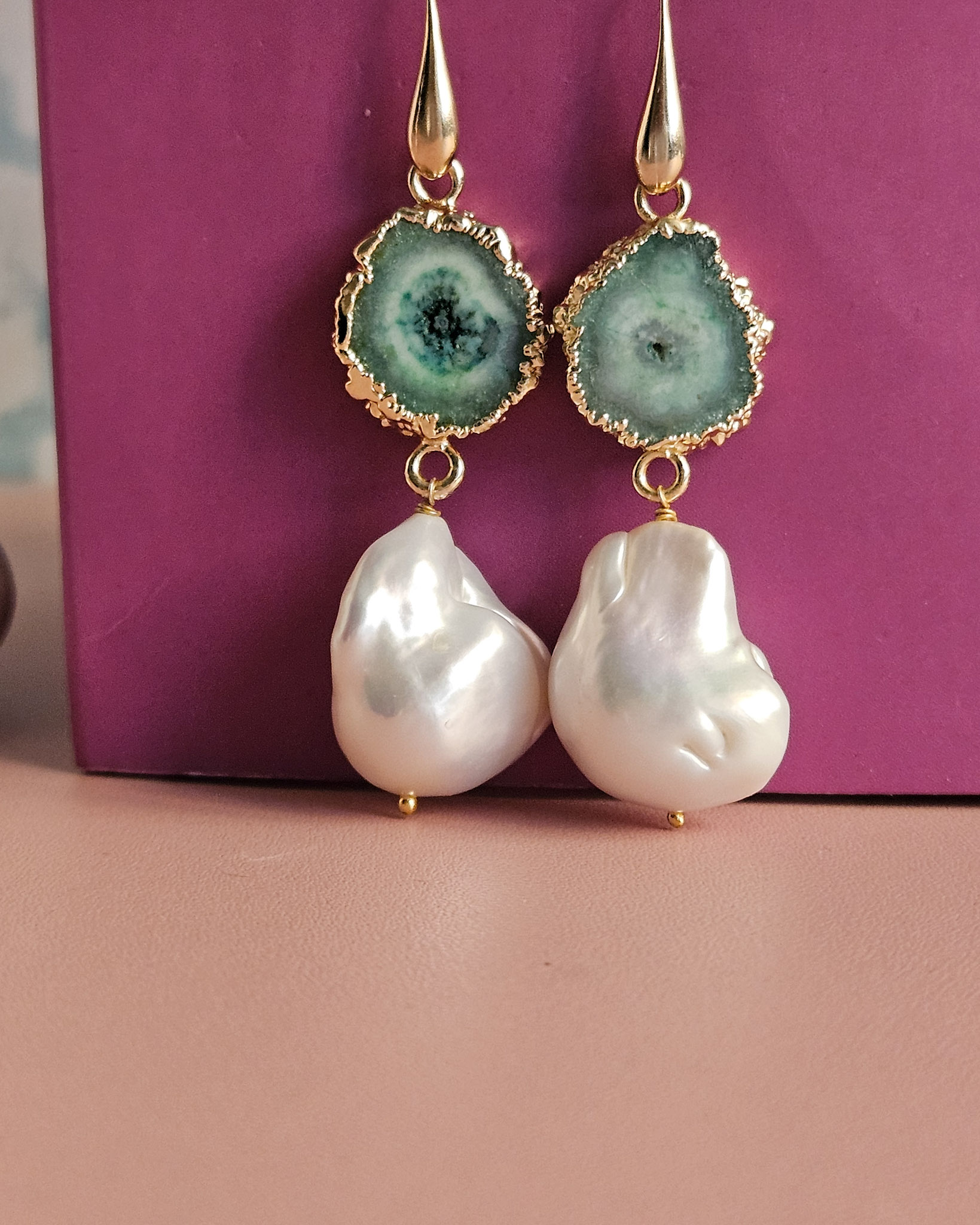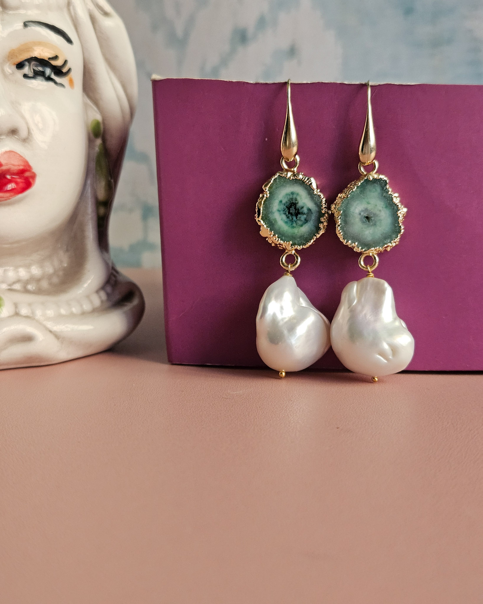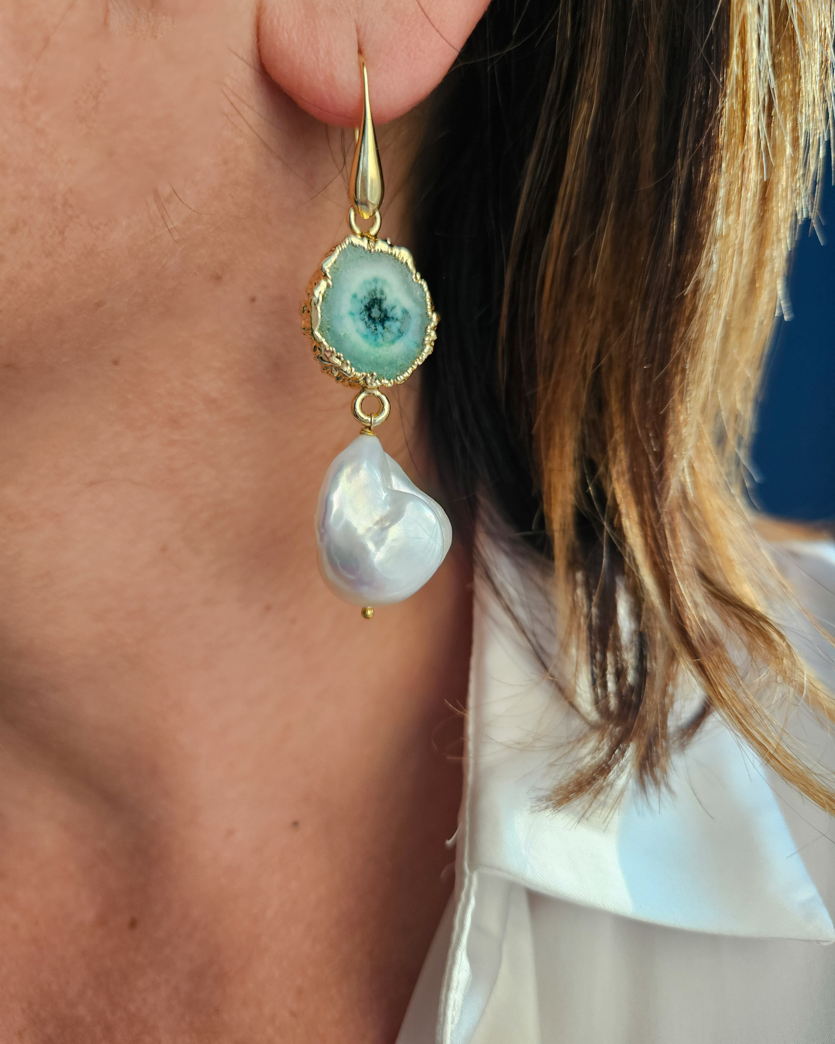 Orecchini Pendenti con Agata Naturale Verde Acqua e Perle Barocche