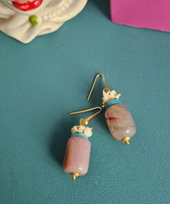 Orecchini pendenti con barilotto di agata striata rosa, dalle sfumature morbide e naturali, abbinato a rondelle di turchese che aggiungono un contrasto fresco e luminoso. La parte superiore è arricchita da chips di corallo rosa, per un dettaglio materico e delicato.