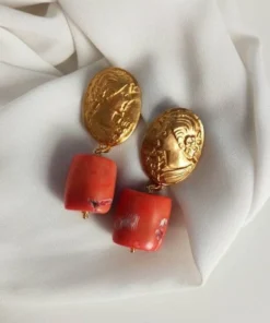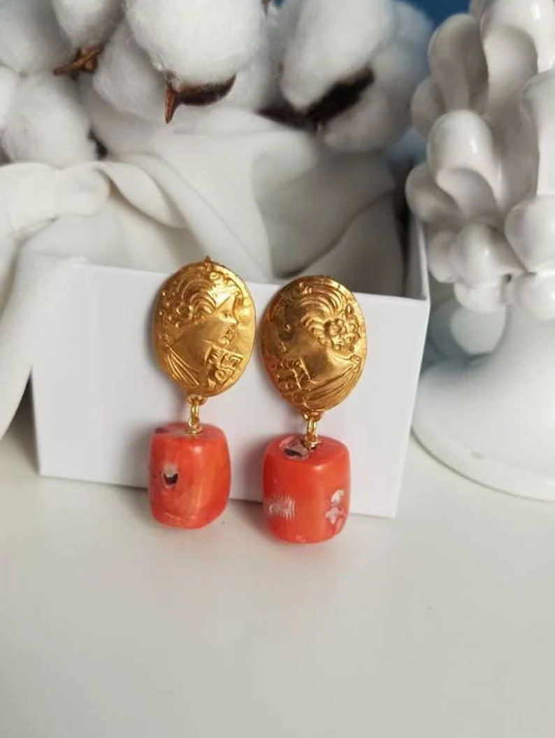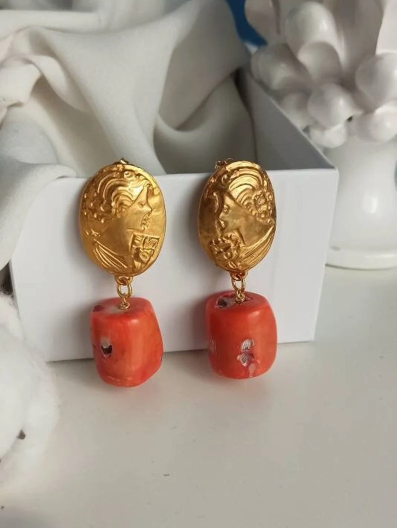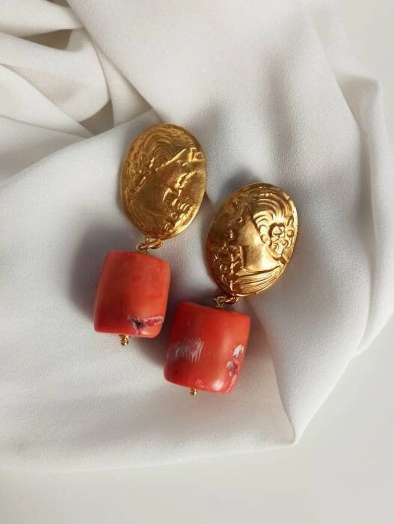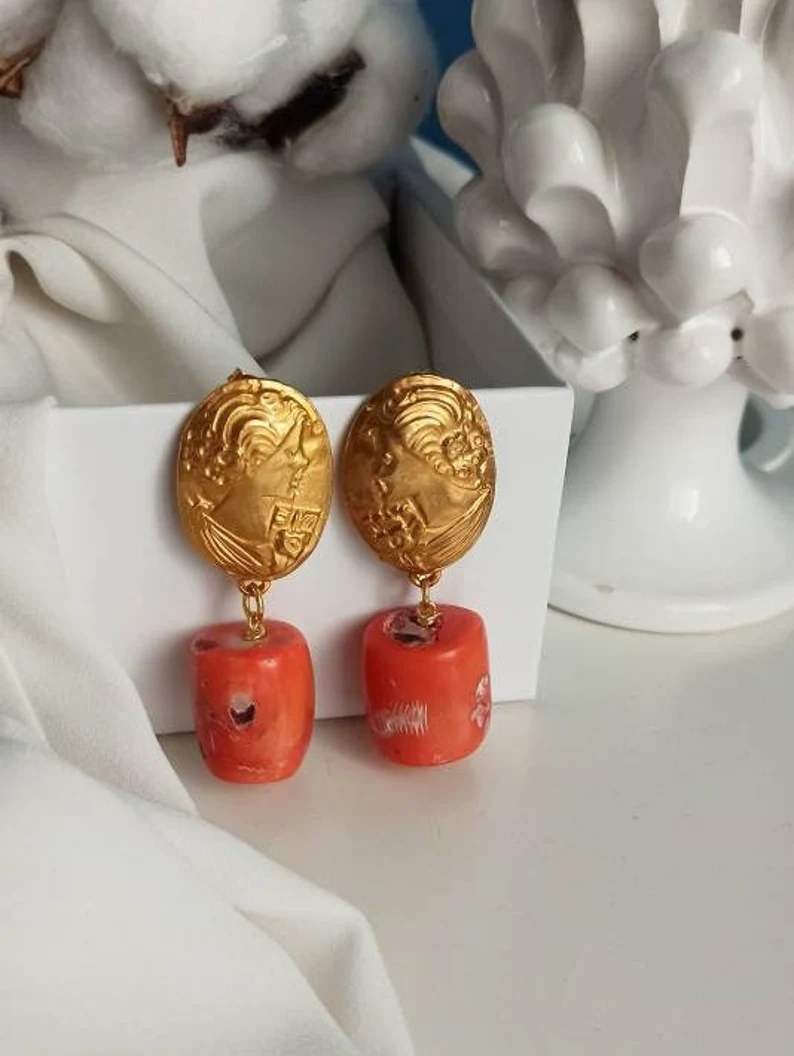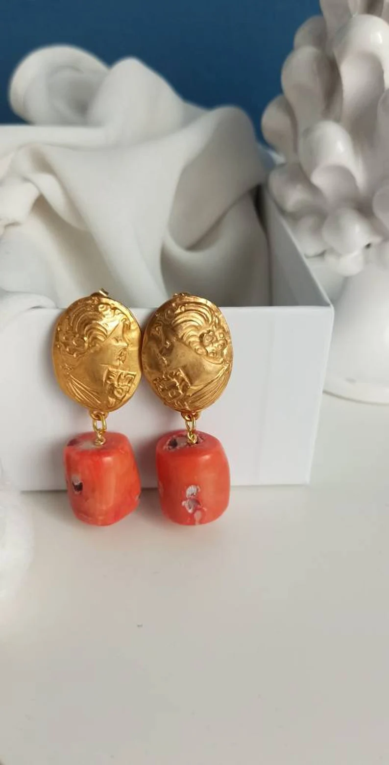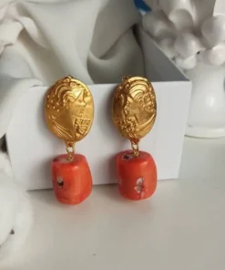 Orecchini Pendenti con Corallo Bamboo Grezzo e Cammei in Ottone