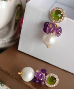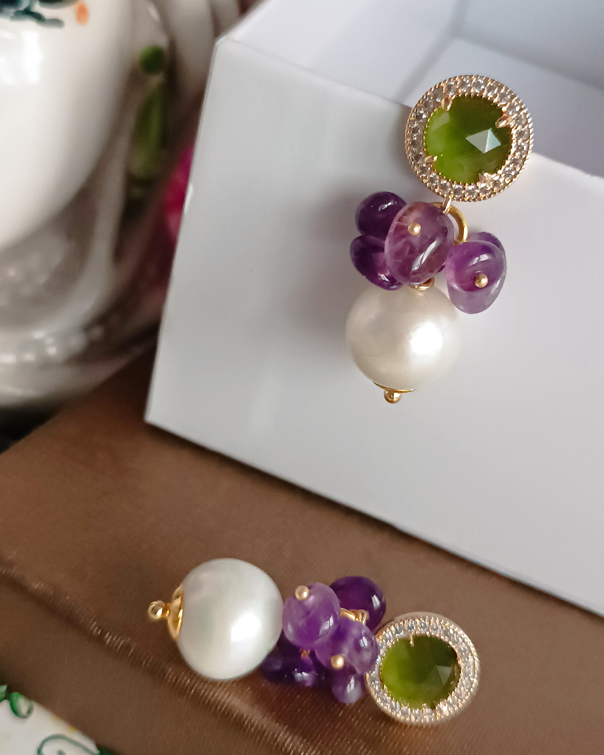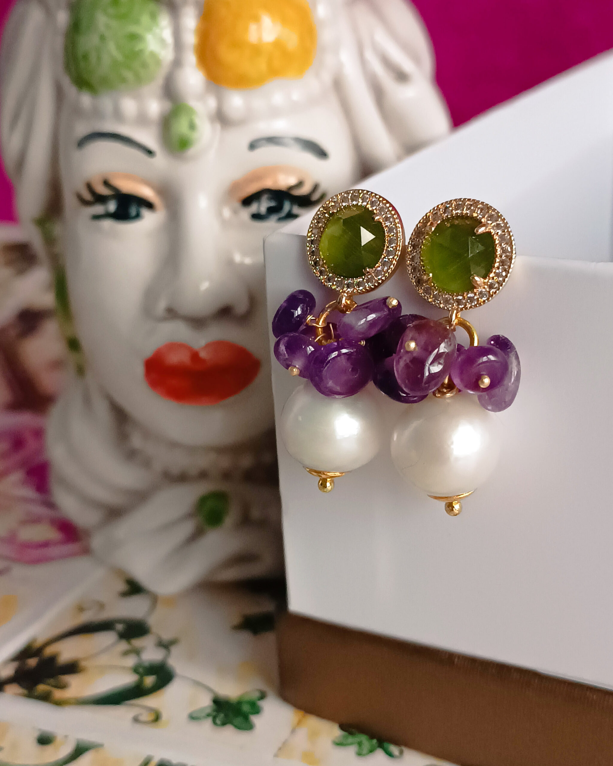 Orecchini Pendenti con Perle Barocche, Ametista e Occhio di Gatto Verde