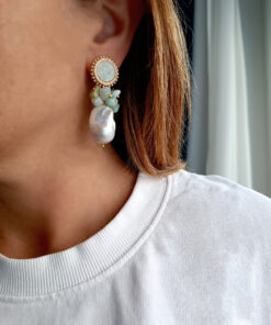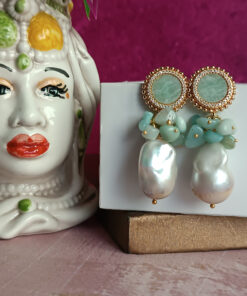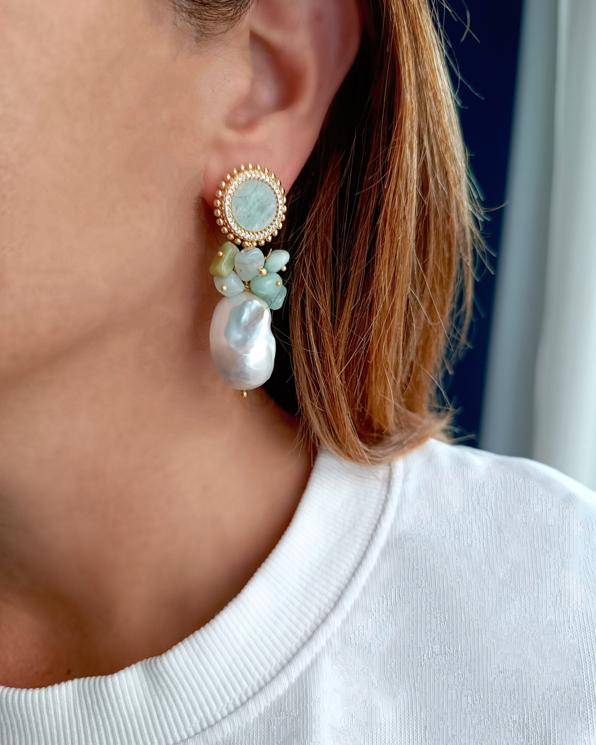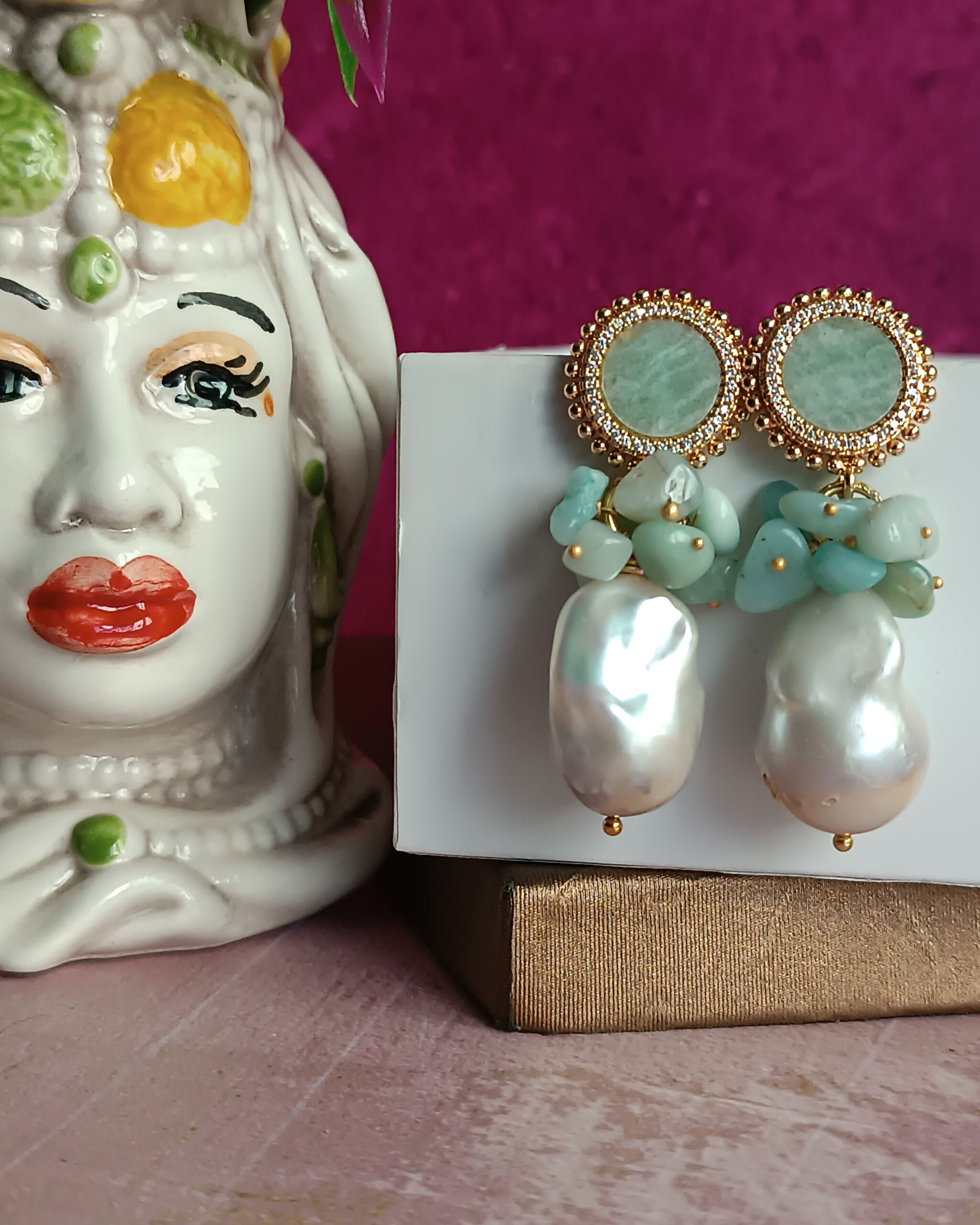 Orecchini elegantissimi realizzati con imponenti Perle Barocche e la splendida Amazzonite.