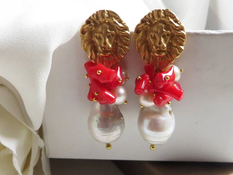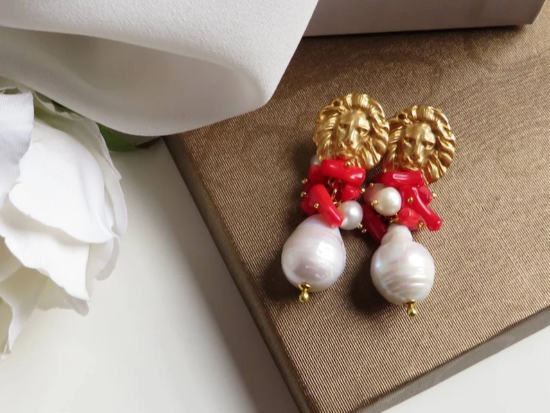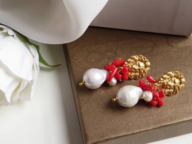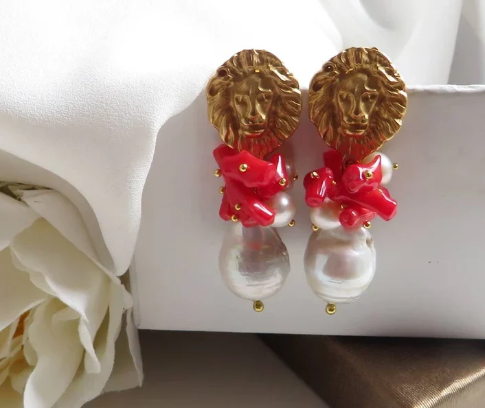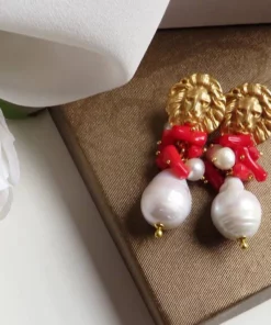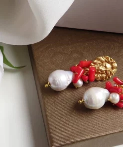 Orecchini Pendenti con Perle Barocche e Corallo Bambù Rosso