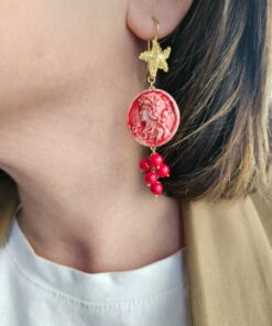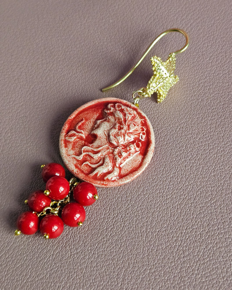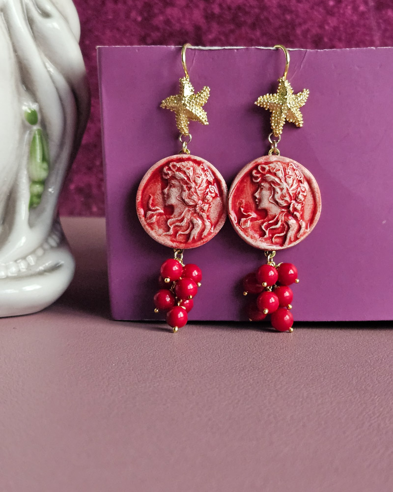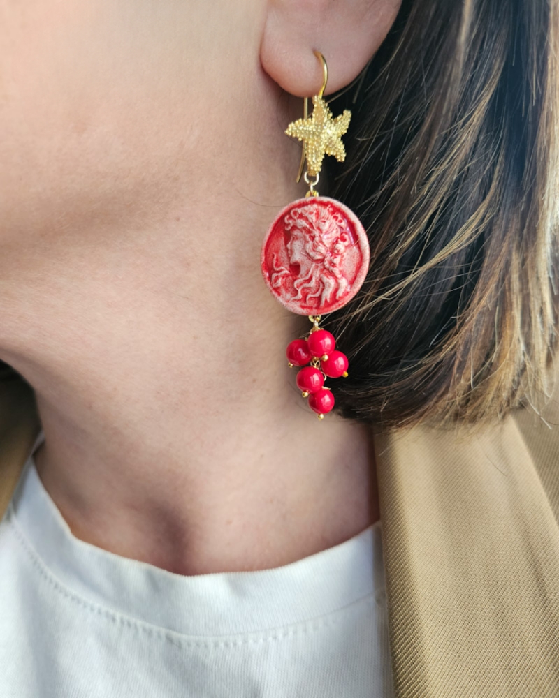 Questi orecchini sono la reinterpretazione moderna di un gioiello classico, ed è qui che la tradizione si fonde con l’innovazione. Il cammeo, simbolo di eleganza e tradizione, è stato totalmente rivisitato e realizzato in ceramica di Caltagirone. Frutto di una lavorazione meticolosa, prende vita nei suoi dettagli unici, con una nuova visione. Ogni pezzo è un’espressione di artigianato autentico, dove la ceramica, con la sua texture distintiva e il suo colore vibrante, arricchisce il cammeo di una profondità visiva unica.