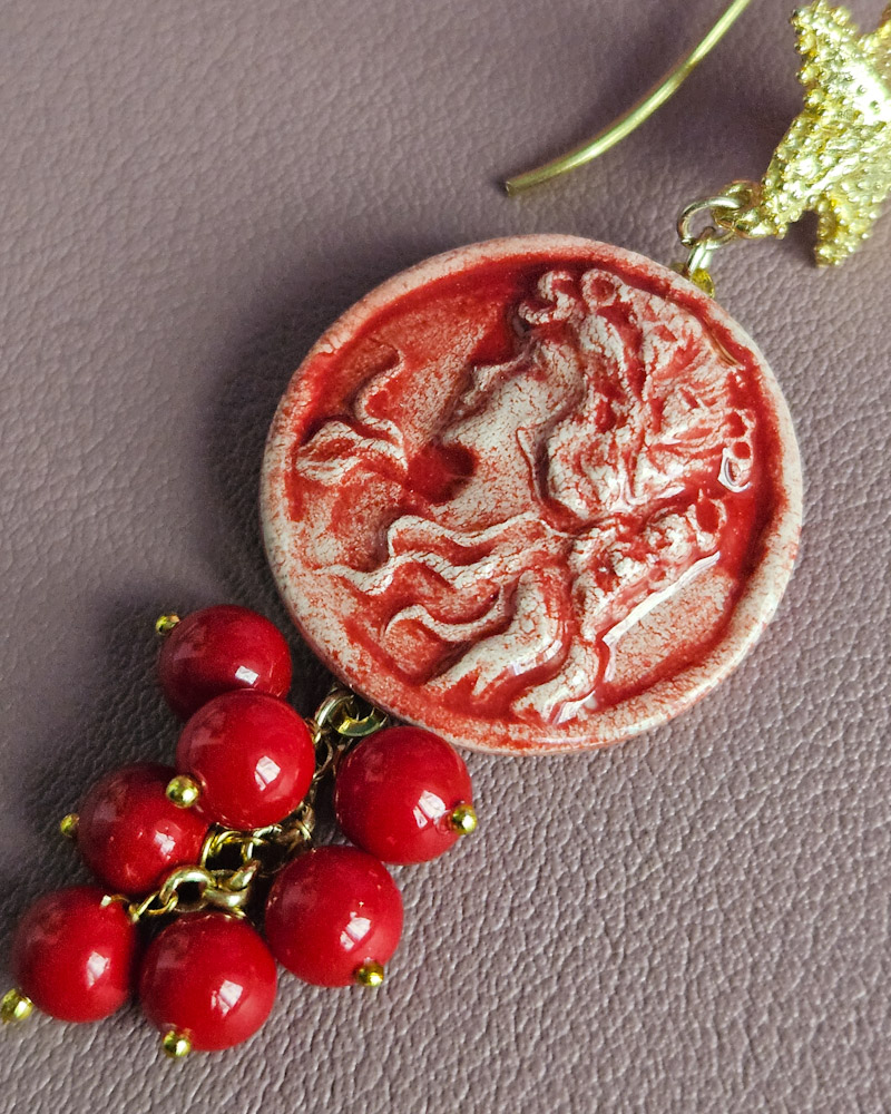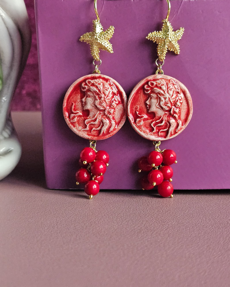 Orecchini Pendenti in Argento 925 con Cammei in Ceramica di Caltagirone e Pietre di Maiorca Rossa